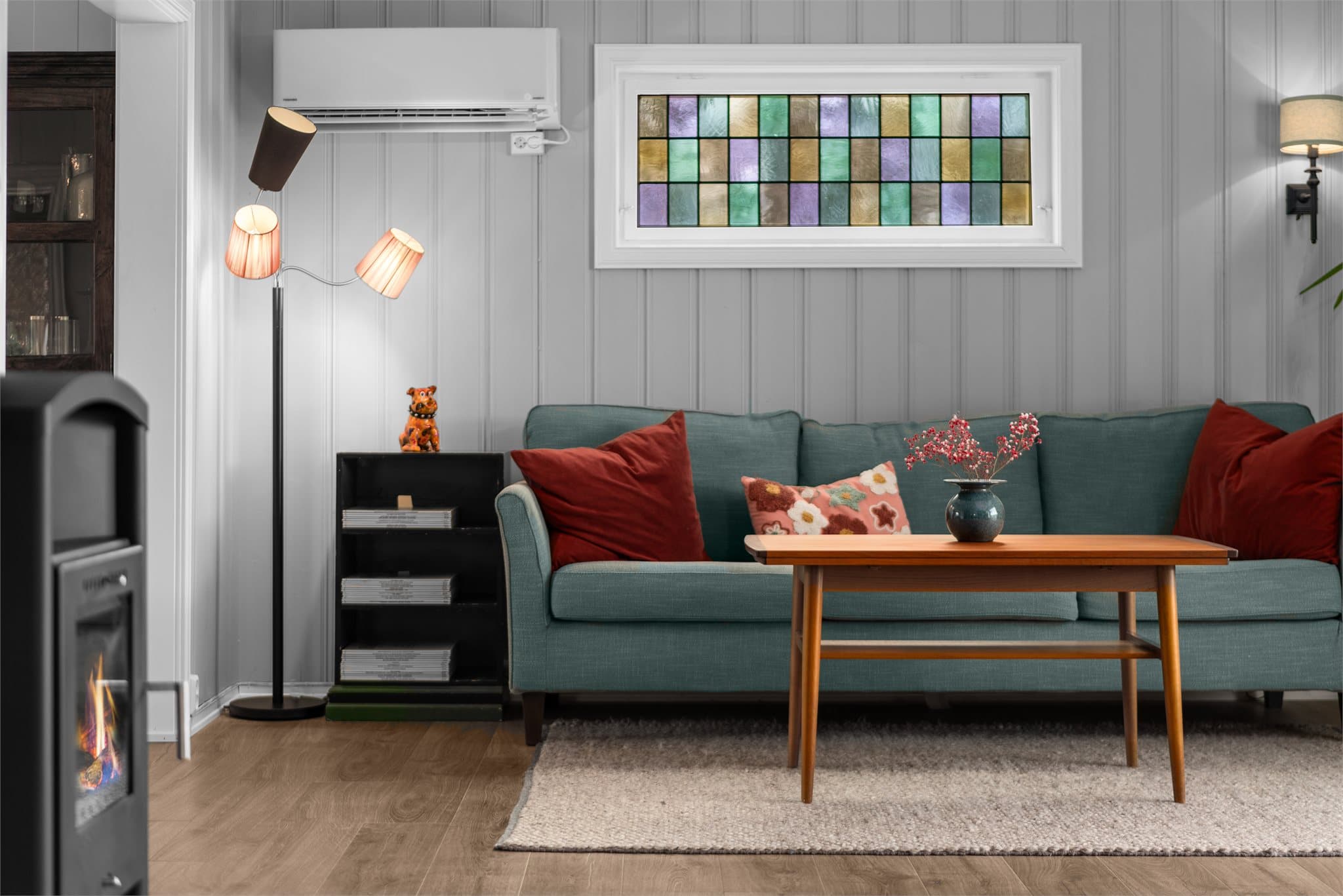 Gulvvarme bad. Varmepumpe montert i stue og i kjeller. Vedovn x2.