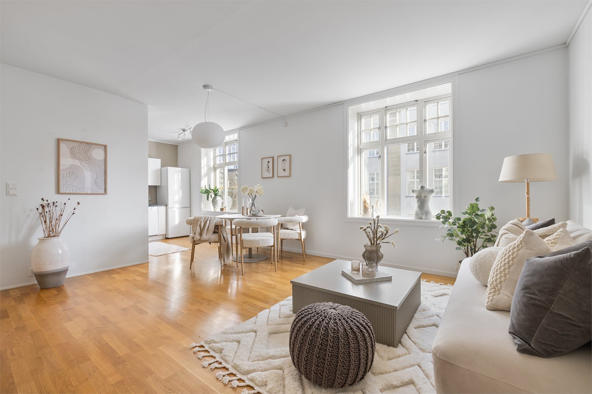 Entré Fra inngangspartiet kommer du inn i en innbydende entré med integrert skyvedørsgarderobe som gir gode oppbevaringsmuligheter. Her får du en praktisk velkomst til boligen, med enkel adkomst til leilighetens øvrige rom. Leiligheten har parkett på gulv og malte overflater på vegger, noe som gir et lyst og helhetlig uttrykk. Stue Stuen er romslig og lys, med store klassiske vindusflater som slipper inn rikelig med naturlig lys. God takhøyde og brede vinduskarmer gir leiligheten et klassisk bygårdspreg. Her er det god plass til både sofagruppe og spisebord, og peisovnen bidrar til en lun og hyggelig atmosfære. Kjøkken Kjøkkenet ligger i delvis åpen løsning mot stuen, noe som gir en god romfølelse og fleksible møbleringsmuligheter. Kjøkkeninnredningen har glatte fronter og laminert benkeplate, samt godt med skap- og benkeplass. Over stekesonen er det etablert mekanisk avtrekk. Soverom Leiligheten har et romslig soverom på ca. 9 kvm vendt mot stille bakgård. Rommet har store vindusflater som gir godt med naturlig lys, og det er plass til både dobbeltseng og garderobeløsning. Et rolig og behagelig rom med en lun atmosfære. Bad Badet er flislagt og fremstår funksjonelt, utstyrt med dusjvegger, servant i servantskap, vegghengt toalett og opplegg for vaskemaskin. Rommet ventileres med mekanisk avtrekk. Bod og oppbevaring Leiligheten disponerer en bod i kjeller på ca. 6 kvm, som gir gode lagringsmuligheter for sesongutstyr og øvrige eiendeler. Fellesarealer Sameiet har en pent opparbeidet bakgård med hyggelige sitteplasser. I tillegg finnes en felles takterrasse med flott utsikt og gode solforhold, et perfekt sted å nyte fine dager.