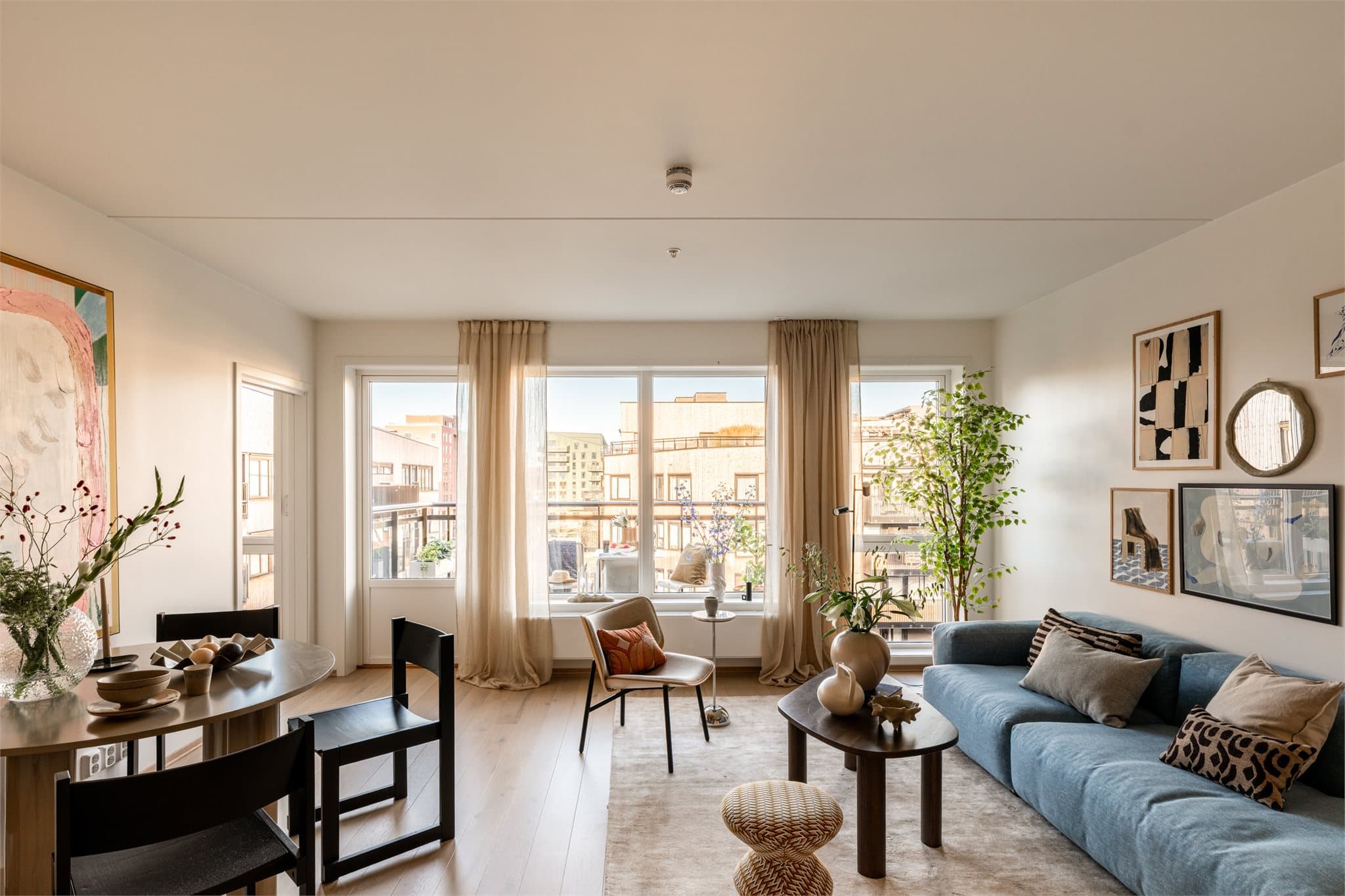 Velkommen hjem! Hjemmets første rom, og det som møter deg og gjestene dine når du kommer inn døren, fremstår innbydende og gir et godt førsteinntrykk. Et romslig og lyst rom med god plass til oppbevaringsmøbler. Stue med kjøkken i åpen løsning Oppholdsrommet fremstår lyst, moderne og innbydende med store vindusflater som slipper inn rikelig med dagslys. Den åpne løsningen mellom kjøkken og stue gir en naturlig soneinndeling, hvor kjøkkenet har en stilren innredning med gode oppbevarings- og arbeidsflater. Stuen har en behagelig atmosfære og gir godt med plass til både sofagruppe, spisebord og øvrig møblement. Dette er et sosialt og funksjonelt oppholdsrom som passer like godt til hverdagsliv som til hyggelige sammenkomster. Baderommet Hovedbadet fremstår moderne og delikat med lyse, tidløse fliser og downlights i himling. Rommet har et romslig dusjhjørne med glassvegger, vegghengt toalett og stilren baderomsinnredning med underskuffer. Praktisk opplegg for vaskemaskin gjør badet både funksjonelt og brukervennlig i hverdagen. Hovedsoverom med eget bad På hovedsoverommet får du en avslappende og behagelig sone med god plass til dobbeltseng, nattbord og ønsket møblering. De lyse flatene kombinert med vindusløsningen gir et fint lysinnslipp og en rolig atmosfære. Her får dere også direkte tilgang til et privat, flislagt bad med dusj, servantinnredning og vegghengt toalett - en praktisk og komfortabel løsning i hverdagen. Soverom ll og lll Med tre soverom totalt får dere et hjem som enkelt kan tilpasses ulike behov og livsfaser. Soverommene er lyse med gode vindusflater som slipper inn rikelig med dagslys. Her er det plass til seng, skrivepult eller ekstra oppbevaring - perfekt som barnerom, ungdomsrom, gjesterom eller et behagelig hjemmekontor når hverdagen krever det. Rommene gir fleksibilitet til å forme boligen slik den passer best for deg og din livsstil. Balkongen Her får dere en svært trivelig uteplass som forlenger oppholdsrommet i sommersesongen. Balkongen vender mot nordvest, noe som gir behagelig ettermiddags- og kveldssol - perfekt for avslappende stunder etter jobb eller lange, lyse sommernetter med venner. Det er god plass til både sittegruppe og litt beplantning, slik at dere kan skape deres egen grønne og hyggelige uteoase med flott utsyn mot det moderne nabolaget.