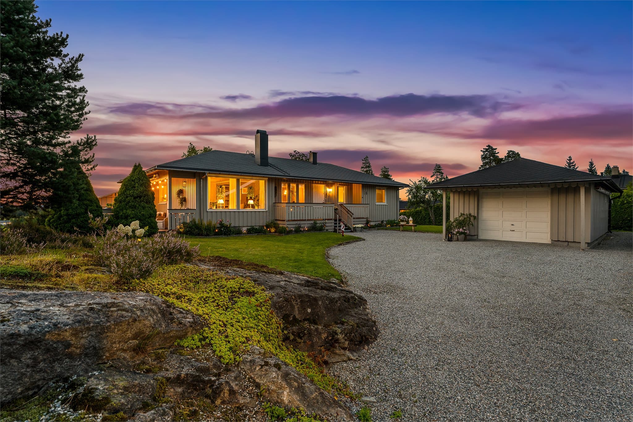 EMERA Romerike ved Line Stuve ønsker velkommen til Lerkesvingen 18! Eiendommen ligger innerst i blindvei i et etablert og barnevennlig boligområde i Gjerdrum kommune, med kort avstand til Ask sentrum. Her bor du i rolige omgivelser med umiddelbar nærhet til Romeriksåsen, som byr på fantastiske tur- og friluftsmuligheter året rundt. Innvendig består hovedetasjen av entré/gang, kjøkken med spiseplass, romslig stue, tre gode soverom samt baderom. Fra stuen er det utgang til en stor og solrik terrasse. Underetasjen er innredet med bad, vaskerom, kjellerstue, innredet rom og flere lagringsrom. Etasjen har også egen inngang med entré, noe som gir fleksible bruksmuligheter. Tomten er pent opparbeidet med gruset gårdsplass, dobbelgarasje, plenarealer og naturtomt. Velkommen!