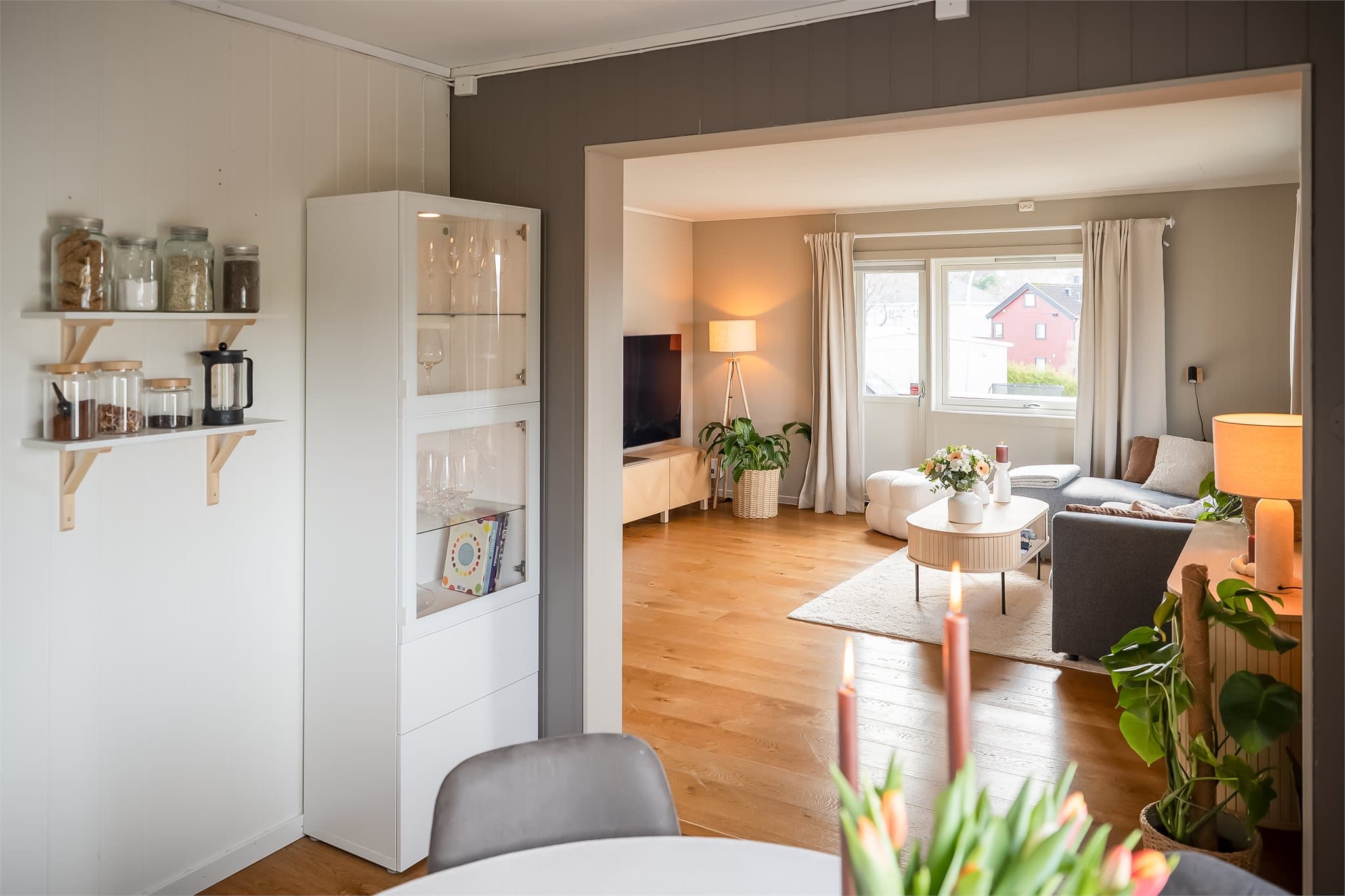 Velkommen hjem! Entré Leiligheten har en innbydende entré som gir et godt førsteinntrykk ved ankomst. Her er det gode oppbevaringsmuligheter for yttertøy og sko, med plass til garderobeløsning. Entréen oppleves som praktisk utformet med enkel adkomst til leilighetens øvrige rom, og ytterdøren er utstyrt med elektrisk dørlås for økt komfort. Stue og balkong Lys og trivelig stue med delvis åpen løsning mot kjøkken, noe som gir en luftig romfølelse. Store vindusflater sørger for rikelig med naturlig lys, og peisovn gir god varme på kalde dager. Fra stuen er det utgang til en solrik balkong på ca. 8,5 kvm med gode solforhold store deler av dagen. Balkongen har plass til sittegruppe og grill, og fungerer som en fin forlengelse av oppholdsrommet i sommerhalvåret. Kjøkken Kjøkkenet ligger i en egen, naturlig avgrenset sone i tilknytning til stuen. Det har en praktisk vinkelløsning med gode arbeidsflater og rikelig med oppbevaringsplass i både over- og underskap. Kjøkkenet fremstår som lyst og funksjonelt, med god plass til spisegruppe like ved, noe som gjør det enkelt å samle familie og gjester til måltider. Soverom Romslig soverom på ca. 13,5 kvm med plass til dobbeltseng og tilhørende møblement. Det er gode garderobemuligheter, og lune fargevalg gir rommet en rolig og behagelig atmosfære. Bad Lyst og moderne bad utstyrt med servantinnredning, speil, toalett og dusjnisje. Det er opplegg for vaskemaskin med praktisk plassering. Bod og parkering Leiligheten disponerer rikelig med bodareal i kjeller på totalt ca. 18 kvm. Det medfølger parkering på biloppstillingsplass.