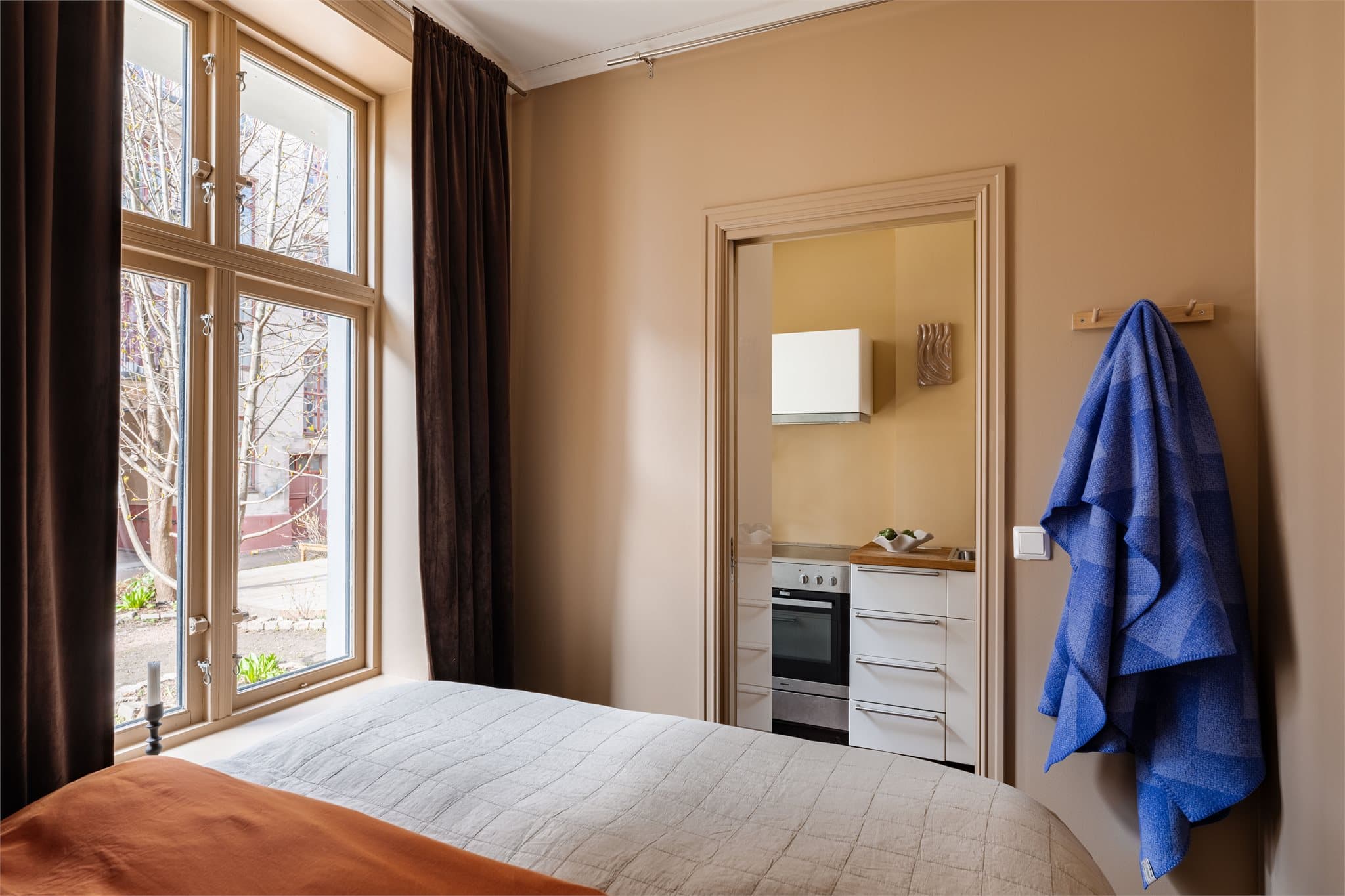 Dette er en arealeffektiv og sjarmerende leilighet i en klassisk bygård fra 1878. Planløsningen på ett plan er praktisk utnyttet, og boligen kombinerer historiske elementer som furugulv og vedovn med moderne komfort som et bad oppgradert i 2014. Som en naturlig del av bygningens alder, har gulvene noe skjevhet, noe som er et karaktertrekk ved eldre bygårder. Entré: En brann- og lydklassifisert dør åpner inn til en entré med mønstrede fliser på gulvet. Her er det plass til å henge fra seg yttertøy og sette fra seg sko. Stue: Stuen har plass til både sofagruppe og spisebord. Rommet varmes effektivt opp av en vedovn, som også skaper en lun atmosfære på kalde dager. De originale furugulvene og en vegg med murt forblending gir rommet tekstur og karakter. Store vindusflater slipper inn dagslys. Kjøkken: Kjøkkenet er et eget, funksjonelt rom med innredning med glatte fronter og en solid benkeplate i tre. Det er utstyrt med frittstående hvitevarer, inkludert komfyr, oppvaskmaskin og kjøl-/fryseskap. En kjøkkenventilator med kullfilter er montert over kokesonen. Soverom: Soverommet har plass til dobbeltseng og oppbevaringsløsninger. Et stort vindu gir godt med lys og utsyn mot bakgården. Bad/vaskerom: Badet ble oppgradert i 2014 og er helfliset med elektriske varmekabler i gulvet. Rommet er innredet med servant, vegghengt toalett og et dusjhjørne med glassdører. Det er også praktisk opplegg for vaskemaskin. Overflater: Gulv: Furu i stue og soverom. Fliser i entré og på bad. Vegger: Malte plater og murt forblending. Himling: Malte plater. Lagring: Leiligheten disponerer to eksterne boder. For fullstendig teknisk informasjon om boligen, se punktet Byggemåte i salgsoppgaven. Dersom det er registrert avvik med tilstandsgrad (TG) 2 eller 3 i tilstandsrapporten, oppfordres interessenter spesielt til å undersøke disse forholdene nærmere, da gitte tilstandsgrader er et konkret uttrykk for alder/slitasje/ødeleggelser/konsekvenser som innebærer kostnader til utbedring. Kjøper må innta disse vurderingene og medfølgende utbedringskostnader i sin kjøpsbeslutning, jf. avhl. § 3-10. Det samme gjelder eventuelt andre opplysninger om kjente risikofaktorer, som for eksempel ufaglært arbeid, begrenset kontroll av det elektriske anlegget og opplysninger fra selgers egenerklæringsskjema.