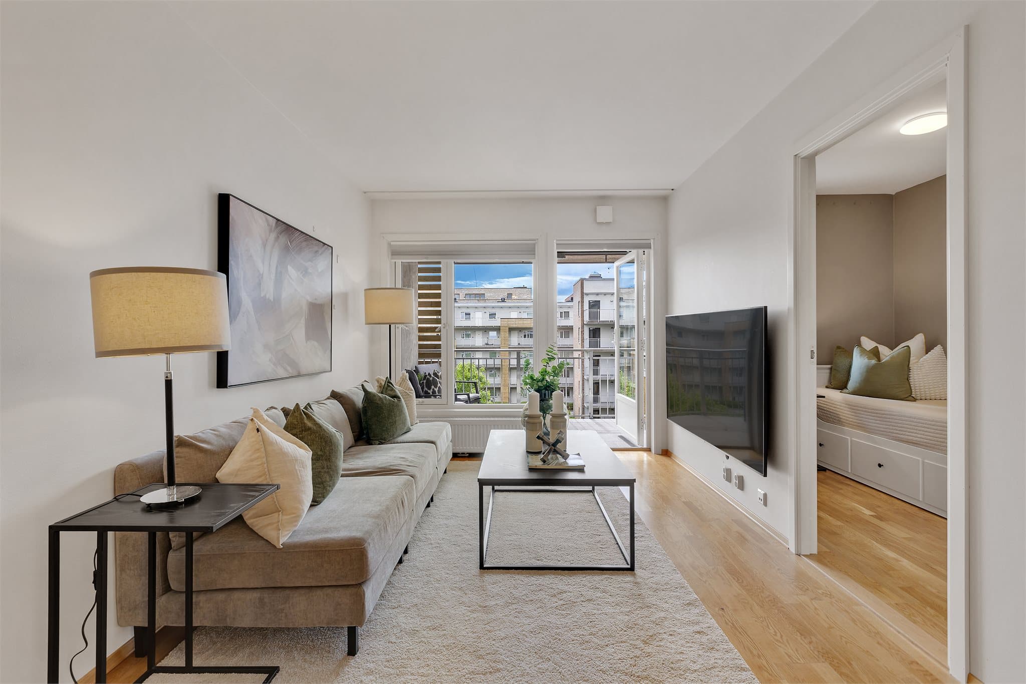 Lys og gjennomgående 3-roms med en solrik balkong i rolige omgivelser! Varmtvann og fyring inkl. Kort vei til alt!