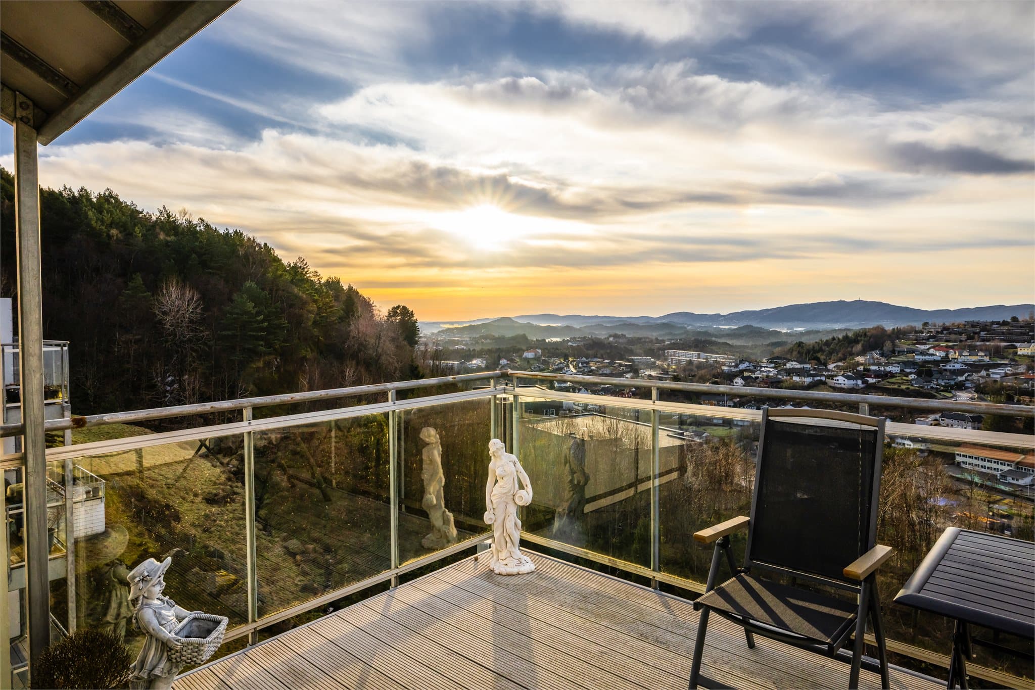 Vestvendt, romslig 3-roms m/13m² drømmebalkong i 5. etasje (øverst). Vidstrakt utsikt, heis, garasjeplass, god bodplass.