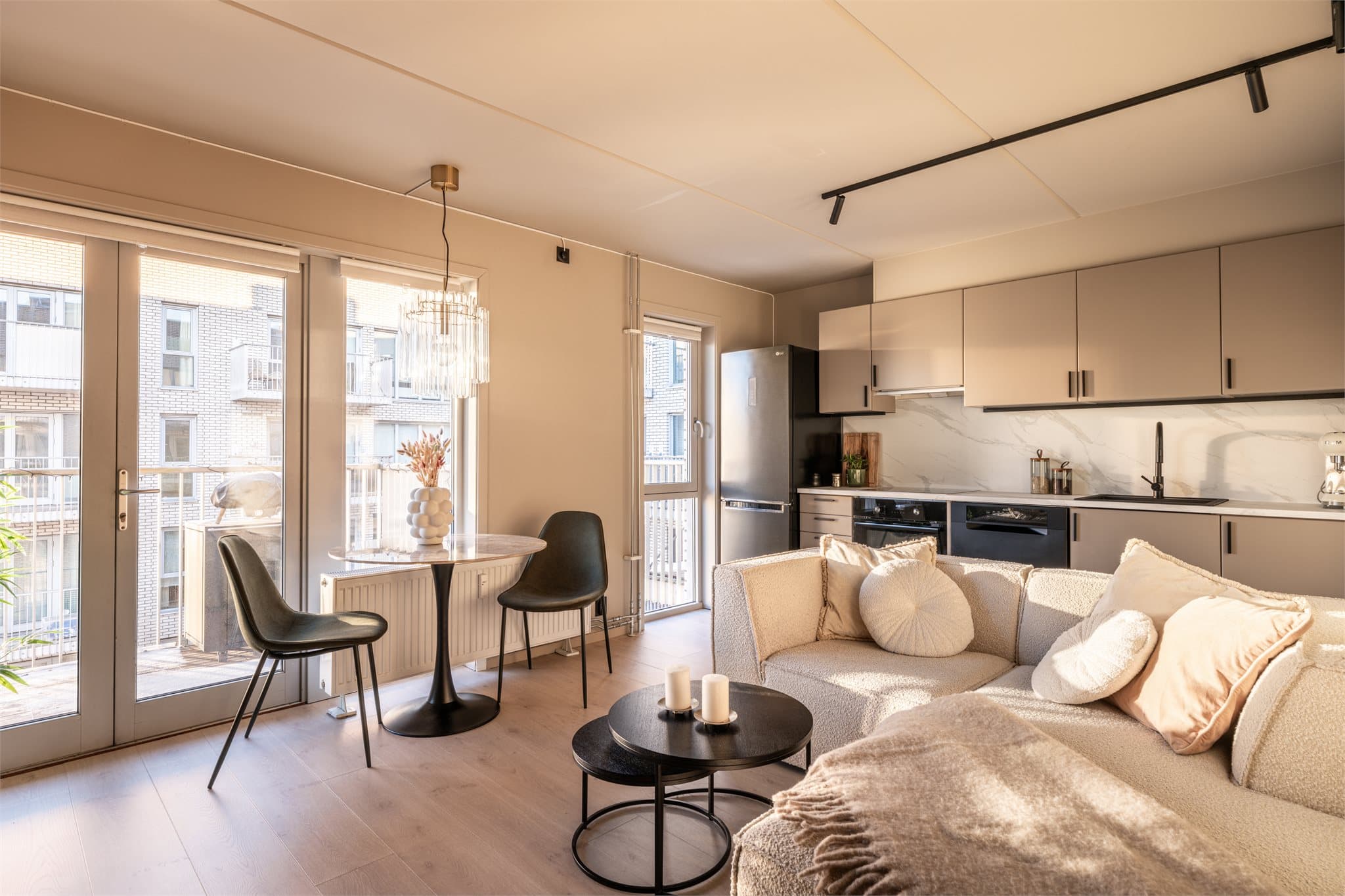 Velkommen inn til en arealeffektiv og moderne 2-roms leilighet i et bygg fra 2009. Leiligheten har en gjennomtenkt planløsning med en åpen stue- og kjøkkenløsning som utgjør boligens sosiale sone. Her er det nylig lagt laminatgulv og foretatt oppgraderinger av det elektriske anlegget, noe som gir et tidsriktig og innflyttingsklart preg. Fra stuen er det utgang til en romslig, nordvestvendt balkong. Entré: Entréen gir adkomst til leilighetens øvrige rom og har plass til oppbevaring av yttertøy og sko. Stue og kjøkken: Den åpne løsningen mellom stue og kjøkken skaper en lys og sosial atmosfære. Stuen har nylig lagt laminatgulv fra 2025 og en ny spotskinne fra 2026. Rommet varmes opp av en radiator tilknyttet fellesanlegget for vannbåren varme. En tofløyet balkongdør slipper inn lys og gir utgang til uteplassen. Kjøkkenet har en malt innredning med glatte fronter og laminatbenkeplate. Det er utstyrt med induksjonstopp, innebygget stekeovn og ventilator tilkoblet kanal. Det er avsatt plass til kjøleskap/fryser og oppvaskmaskin. I 2026 ble det lagt opp en ny, egen kurs til stekeovnen. Balkong: Fra stuen er det utgang til en nordvestvendt balkong på 7 m². Balkongen har betongdekke, delvis kledd med lamellfliser i tre, og rekkverk i stålkonstruksjon. Her er det også utelys og stikkontakt. Soverom: Soverommet er adskilt fra stuen med en plassbesparende skyvedør. Også her er det nylig lagt laminatgulv (2025) og montert ny spotskinne (2026). Rommet har en svært god garderobeløsning som gir rikelig med oppbevaringsplass. Leilighetens sikringsskap med automatsikringer er plassert her. Bad: Badet er en flislagt baderomskabin med elektrisk gulvvarme. Det er innredet med en servant med underskap, vegghengt toalett og en nedsenket dusjnisje med innfellbare dører. Det er opplegg for vaskemaskin. Rommet har mekanisk avtrekk. Overflater: Gulvoverflater: Laminat. Fliser på bad. Vegger: Malte flater. Fliser på bad. Himling: Malt glatt himling med synlige elementskjøter. Malt glatt metallhimling på bad. Oppbevaring: Leiligheten har en romslig garderobeløsning på soverommet. I tillegg disponerer leiligheten en kjellerbod på 5 m². Boder utenfor boenheten kan omdisponeres av sameiet. For beskrivelse av tilstandsgrad (TG) 2 og 3, se punktet Byggemåte i salgsoppgaven. Interessenter oppfordres spesielt til å undersøke disse forholdene som er gitt TG2 og 3 nærmere, da gitte tilstandsgrader her er et konkret uttrykk for alder/slitasje/ødeleggelser/konsekvenser som innebærer kostnader til utbedring. Kjøper må innta disse vurderingene og medfølgende utbedringskostnader i sin kjøpsbeslutning, jf. avhl. § 3-10. Det samme gjelder eventuelt andre opplysninger om kjente risikofaktorer, som for eksempel ufaglært arbeid, begrenset kontroll av det elektriske anlegget og opplysninger fra selgers egenerklæringsskjema.