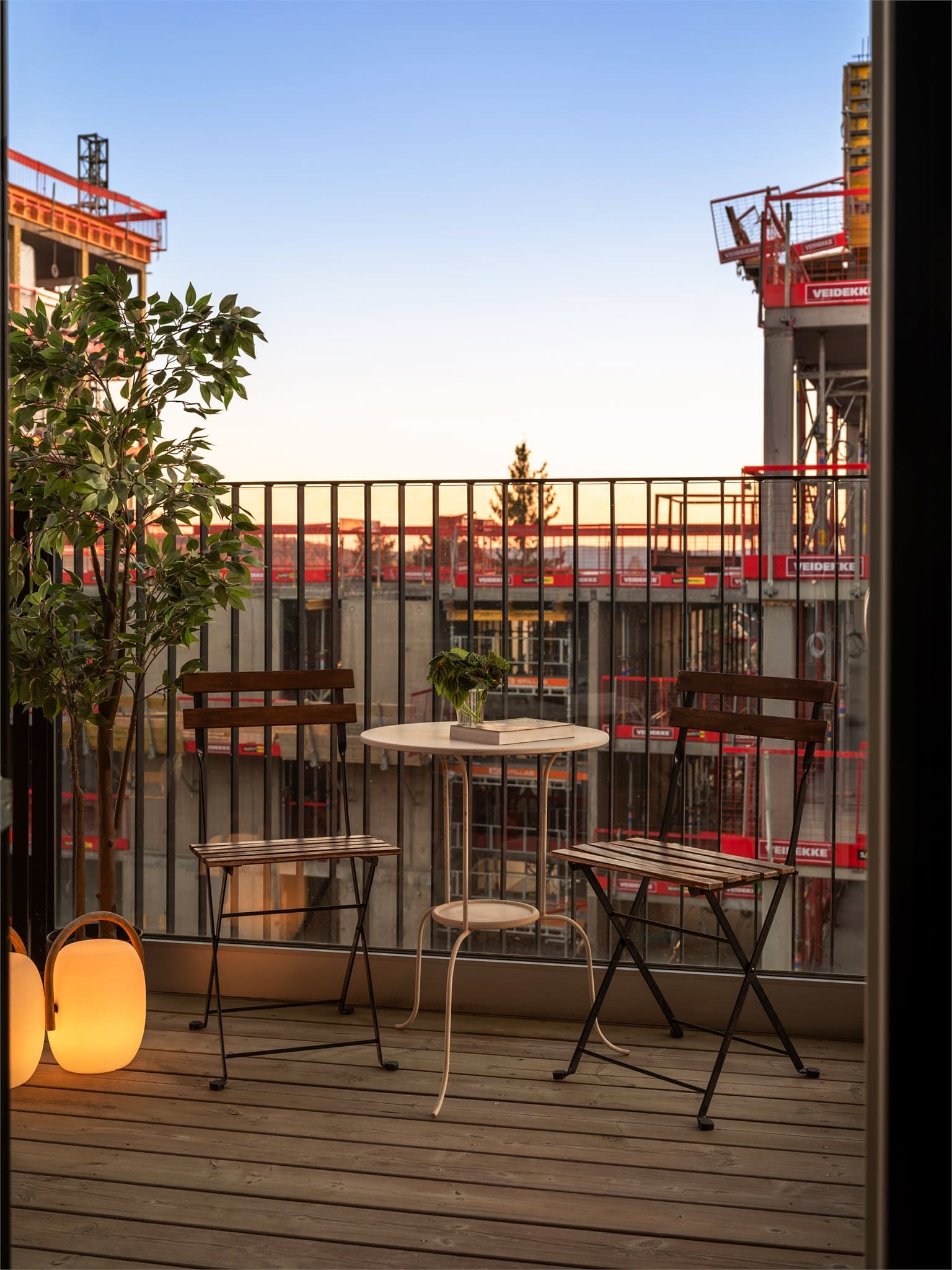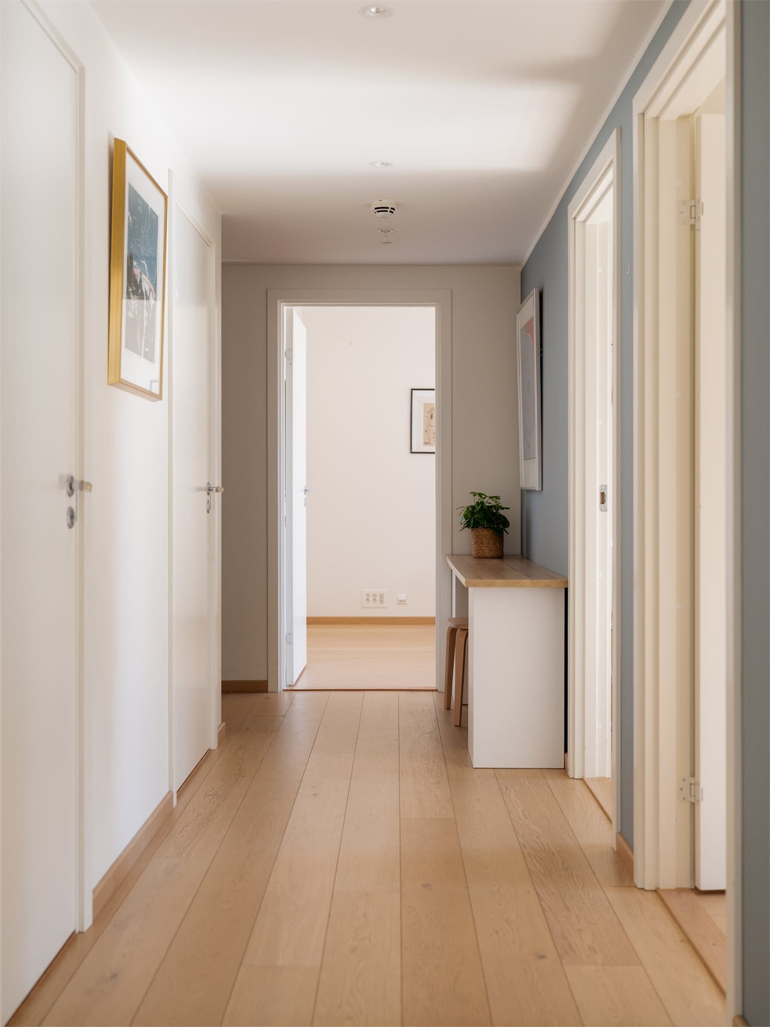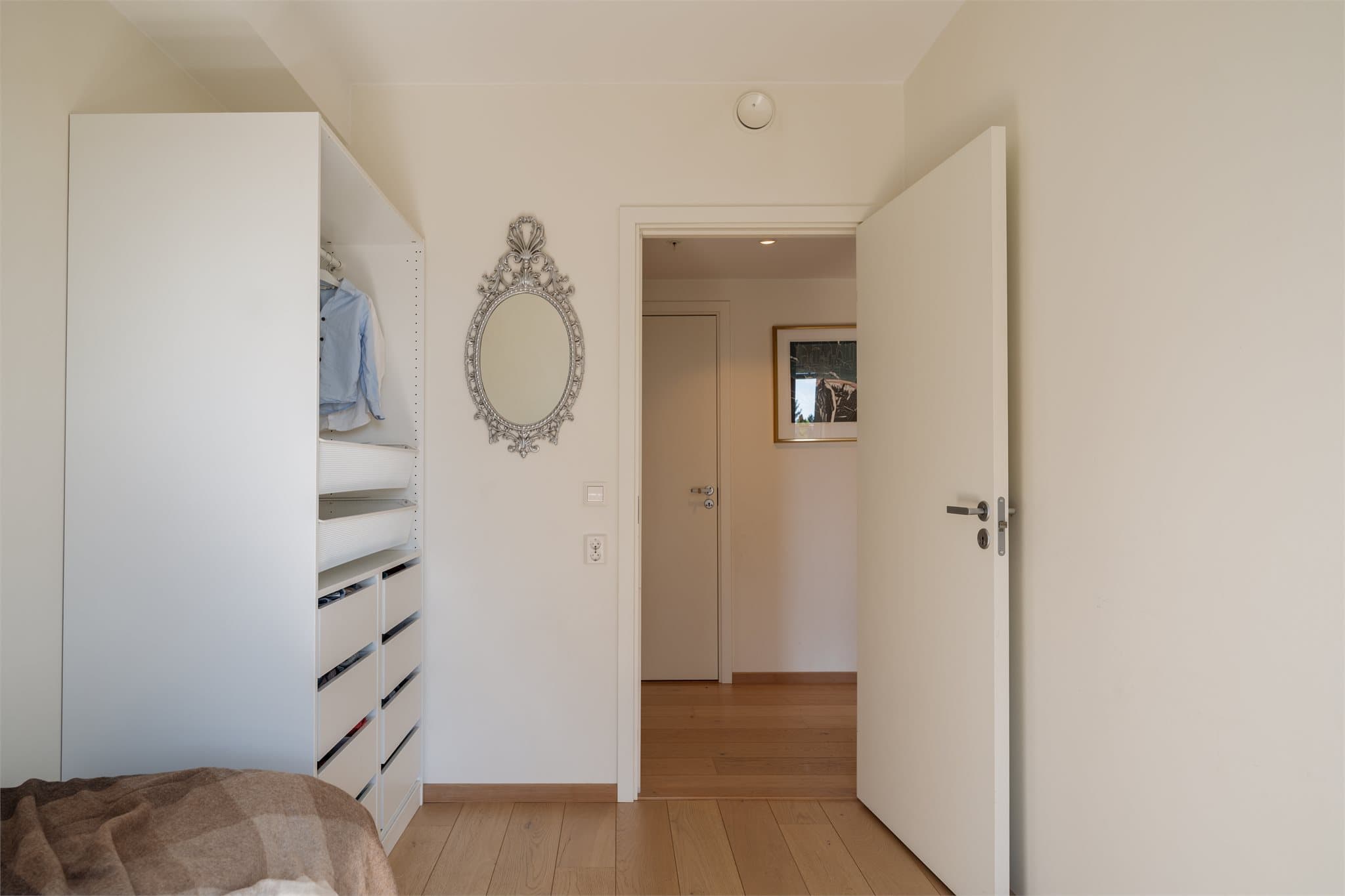 Dette er en moderne og arealeffektiv 4-roms leilighet fra 2019, beliggende i 4. etasje i populære Krydderhagen. Boligen har en gjennomgående god standard med vannbåren gulvvarme og balansert ventilasjon. Planløsningen er familievennlig med tre soverom, to bad og en praktisk innvendig bod. To sydvestvendte balkonger gir gode uterom. Entré Velkommen inn i en innbydende entré med god plass til oppbevaring av yttertøy og sko i en praktisk, åpen garderobeløsning. Entréen gir et hyggelig førsteinntrykk og leder deg naturlig videre inn i boligen. Stue/kjøkken Boligens stue fremstår som lys og luftig, med god plass til både sofagruppe og øvrig møblement. Store vindusflater slipper inn rikelig med naturlig lys, og sammen med en takhøyde på ca. 2,60 meter skapes en romslig og behagelig atmosfære. I tilknytning til kjøkkenet finner du en hyggelig spisedel som danner et naturlig samlingspunkt. Kjøkkenet ligger i åpen løsning mot stuen og spisedelen og fremstår som både funksjonelt og stilrent. Den praktiske kjøkkenøyen gir rikelig med arbeidsflate og gode oppbevaringsmuligheter, samtidig som den fungerer som et sosialt midtpunkt. Innredningen har profilerte fronter og laminat benkeplate. Alle hvitevarer er integrerte, herunder platetopp, stekeovn, oppvaskmaskin samt kjøl- og fryseskap. Ventilator med avtrekk via balansert ventilasjonsanlegg. Innglasset balkong Fra stuen er det utgang til en solrik, sydvestvendt innglasset balkong på ca. 10 m². Innglassingen forlenger utesesongen betraktelig og gir en lun og skjermet uteplass som kan benyttes store deler av året. Her er det gode solforhold og plass til komfortable utemøbler. Balkong Leiligheten disponerer i tillegg en åpen, sydvestvendt balkong på ca. 5 m² med adkomst fra hovedsoverommet. Perfekt for rolige morgenstunder. Soverom Leiligheten har tre romslige soverom. Hovedsoverommet har god plass til dobbeltseng og er utstyrt med en romslig skyvedørsgarderobe. Herfra er det direkte utgang til egen balkong, samt adkomst til privat bad som gir en komfortabel og praktisk løsning. De to øvrige soverommene har gode størrelser og fleksible bruksområder, enten som barnerom, gjesterom eller hjemmekontor. Hovedbad Romslig og delikat bad med adkomst fra hovedsoverommet. Badet er flislagt på gulv og vegger og har behagelig elektrisk gulvvarme. Innredet med vegghengt toalett, servant i møblement, speilskap og dusjhjørne med svingbare glassdører. Taker er lyssatt med downlights. Gjestebad Leiligheten har også et praktisk gjestebad, også dette flislagt med elektrisk gulvvarme. Badet er utstyrt med vegghengt toalett, servant med innredning, speilskap og dusjhjørne. I tillegg er det opplegg for vaskemaskin. Taker er lyssatt med downlights. Overflater: Gulv: Parkett. Fliser på begge bad. Vegger: Malte plater og betong. Fliser på begge bad. Himling: Prefabrikerte betongelementer og malte plater. Lagring: Leiligheten disponerer en innvendig bod, praktisk tilknyttet entreen, samt en ekstern bod i kjelleren på ca. 6,1 m². For fullstendig teknisk informasjon om boligen, se punktet Byggemåte i salgsoppgaven.