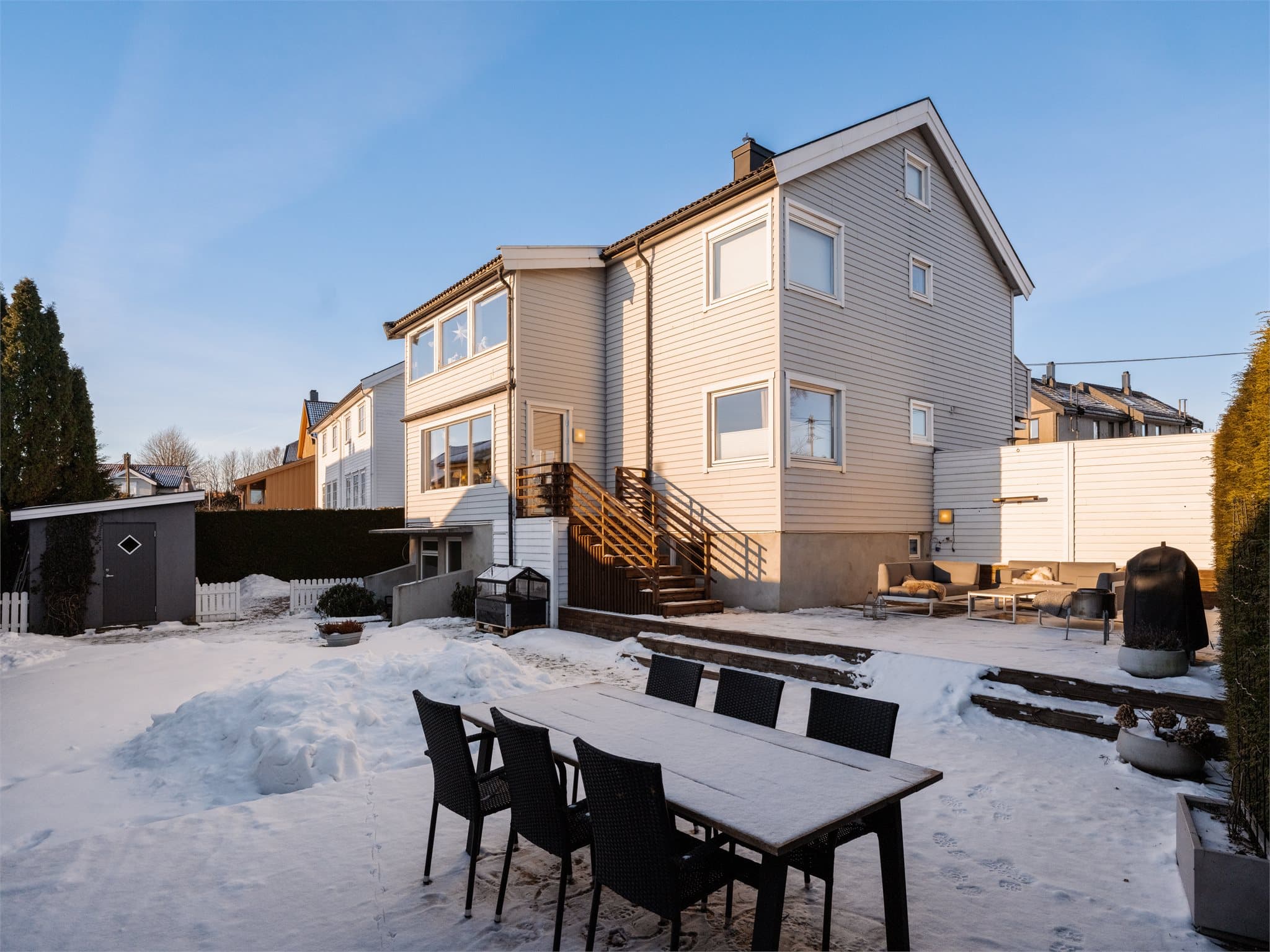 Denne innholdsrike seksjonen i en horisontaldelt tomannsbolig strekker seg over to plan og tilbyr en fleksibel og familievennlig planløsning. Hovedetasjen er boligens sosiale sentrum, med en åpen løsning mellom kjøkken, spisestue og stue, som gir en luftig og lys atmosfære. Fra spisestuen er det direkte utgang til en svært stor terrasse og hage. Underetasjen har en egen inngang og en praktisk rominndeling som gir mulighet for en egen sone for barn eller ungdom. Boligen er gjennomgående oppgradert de siste årene med blant annet et moderne bad fra 2016 og kjøkken fra 2011. 1. etasje Entré: Boligen har adkomst via en felles entré. Innenfor døren til seksjonen kommer man inn i en gang med flislagt gulv. Stue: Stuen er et lyst og innbydende rom med 1-stavs parkett på gulvet og store vindusflater mot sør. Rommet er utstyrt med en luft-til-luft varmepumpe fra Panasonic (2008) for effektiv oppvarming. En dobbel glassdør fra 2020 åpner inn mot spisestuen og skaper en god flyt mellom sonene. Kjøkken og spisestue: Den åpne løsningen fortsetter inn i en romslig sone for kjøkken og spisestue. Kjøkkeninnredningen fra Norema (2011) har profilerte, fabrikklakkerte fronter og en laminatbenkeplate med planlimt kum i rustfritt stål. Veggen over benken er flislagt, og det er belysning under overskapene. Kjøkkenet har platetopp, stekeovn, mikrobølgeovn, frittstående kombiskap for kjøl/frys og opplegg for integrert oppvaskmaskin. Det er installert Aquastop for lekkasjesikring. Spisestuen har god plass til langbord og har 1-stavs parkett på gulvet. Romhøyden i sonen er ca. 2,44 meter. Terrasse: Fra spisestuen er det utgang til en stor terrasse på ca. 85 m². Terrassen ble anlagt i 2021 og har trapp ned til hagen, noe som skaper en sømløs overgang mellom inne- og uterom. Bad: Badet i første etasje ble modernisert i 2016 og er helfliset med varmekabler i gulvet. Rommet har en plassbygget, flislagt servantløsning med hyller og to toppmonterte servanter. Videre er det badekar med svingdør, regnfallsdusj og et veggmontert toalett med spylefunksjon. Himlingen har malte, glatte flater med downlights. Ventilasjonen er mekanisk. Soverom/Kontor: Ved siden av kjøkkenet ligger et fleksibelt rom med 1-stavs parkett, som egner seg godt som soverom eller kontor. Underetasje En innvendig trapp i tre fører ned til underetasjen. Etasjen har også egen inngang via et overbygd inngangsparti på ca. 6,3 m². Denne etasjen er innredet av en tidligere eier, og bruken av rommene som soverom er ikke omsøkt hos kommunen. Gang og tre soverom: Underetasjen har en romslig gang og tre soverom, alle med flislagte gulv med gulvvarme. Romhøyden er ca. 2,15 meter. Ett av soverommene har direkte utgang til en markterrasse på ca. 3,1 m². I 2024 ble det etablert en praktisk skapvegg med skyvedører i gangen ved soverommene. For oppholdsrommene i underetasjen er det ikke innsendt søknad om bruksendring fra tidligere bruk til nåværende bruk av rommene. Se punkt under ferdigattest for utfyllende informasjon. Bad: Badet i underetasjen er fra 2011 og er helfliset med gulvvarme og downlights i taket. Innredningen består av et servantskap med heldekkende servant, speilskap med belysning og et veggmontert toalett. Det er opplegg for vaskemaskin og et dusjhjørne med forheng. Ventilasjonen er mekanisk. Overflater Gulvoverflater: Fliser i entréen, underetasjen og på badene. Ellers 1-stavs parkett. Vegger: Flissatte på badene. Ellers panel i enkelte rom og glatte, malte flater. Himlinger: Panel i enkelte rom. Ellers glatte, malte himlingsflater. Lagring Boligen har gode lagringsmuligheter. I underetasjen er det en innvendig bod, et teknisk rom og en bod under trappen på ca. 2,7 m². I tillegg er det to utvendige boder tilknyttet bygningskroppen. På tomten er det også en frittstående bod på ca. 5,6 m² som ble oppført i 2021. For beskrivelse av tilstandsgrad (TG) 2 og 3, se punktet Byggemåte i salgsoppgaven. Interessenter oppfordres spesielt til å undersøke disse forholdene som er gitt TG2 og 3 nærmere, da gitte tilstandsgrader her er et konkret uttrykk for alder/slitasje/ødeleggelser/konsekvenser som innebærer kostnader til utbedring. Kjøper må innta disse vurderingene og medfølgende utbedringskostnader i sin kjøpsbeslutning, jf. avhl. § 3-10. Det samme gjelder eventuelt andre opplysninger om kjente risikofaktorer, som for eksempel ufaglært arbeid, begrenset kontroll av det elektriske anlegget og opplysninger fra selgers egenerklæringsskjema.