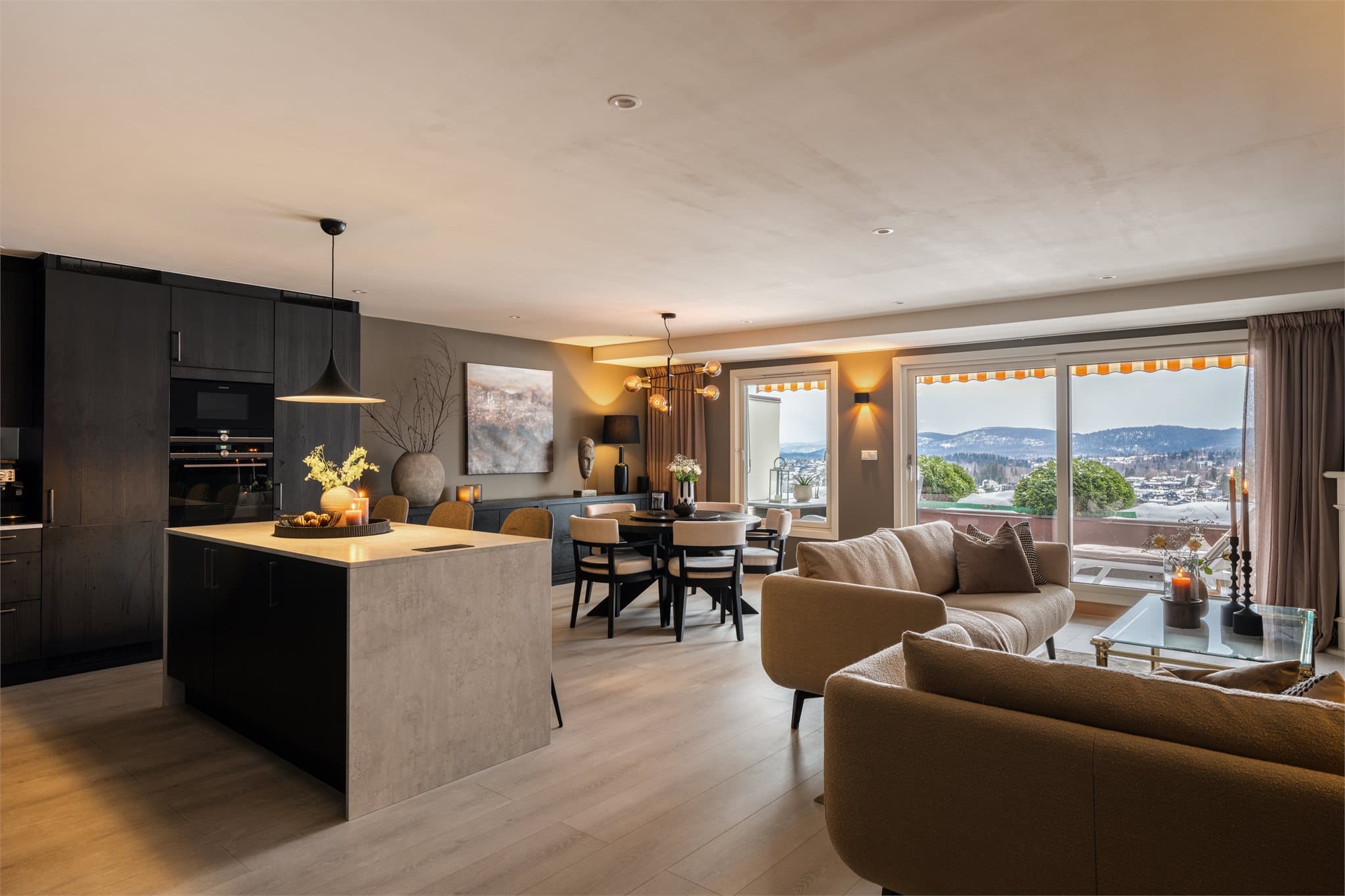 Dette er en gjennomgående og oppgradert leilighet med en arealeffektiv planløsning og to balkonger. Boligen ble pusset opp i 2020-2021 og har en moderne standard med gjennomtenkte materialvalg. Her finner du blant annet et HTH-kjøkken i åpen løsning med stuen, to flislagte bad, et separat vaskerom og tre soverom. Innfelte downlights i alle rom gir en jevn og god belysning. Utvendig ble fasade, terrasser, boder, samtlige vinduer og dører, samt garasjeanlegg, postkasser og dørklokker renovert i perioden 2017–2020 i regi av sameiet. Arbeidene ble utført med fokus på slitesterke materialer og høy kvalitet, og har gitt eiendommen et helhetlig og godt uttrykk. Entré: Entreen gir et svært godt og elegant førsteinntrykk og fungerer som et bindeledd mellom leilighetens ulike soner. Herfra er det direkte tilgang til stue og kjøkken, samt en gang som leder videre til soverommene og badene. Vaskerommet ligger også praktisk tilknyttet entreen. Rommet er lyst og luftig med en romslig løsning, og har god plass til oppbevaringsløsninger for både sko og yttertøy. Stue og kjøkken: Den åpne løsningen mellom stue og kjøkken skaper et sosialt og luftig allrom. Stuen har god plass til både sofagruppe og spisebord, og en gasspeis fra Heat & Glo bidrar med ekstra varme og stemning. Store vindusflater mot balkongen slipper inn rikelig med naturlig lys og skaper en lys og luftig atmosfære. Kjøkkenet fra HTH ble montert i 2021 og har en innredning med glatte fronter og benkeplate i laminat med nedfelt vask. Alle hvitevarer er integrerte: platetopp, stekeovn med dampfunksjon, mikrobølgeovn, oppvaskmaskin og kjøl-/fryseskap. En kullfilterventilator er plassert over kokesonen, og for ekstra trygghet er det montert Waterguard og komfyrvakt. Kjøkkenet har en praktisk kjøkkenøy for ekstra oppbevaring og benkeplass. Det gjøres oppmerksom på at leilighetens planløsning avviker fra de opprinnelige byggetegningene. Kjøkkenet er flyttet inn i stuen, og det tidligere kjøkkenarealet er omgjort til bad. Denne bruksendringen er ikke omsøkt eller godkjent av kommunen. Balkong: Fra stuen har du direkte utgang til en romslig, vestvendt balkong på ca. 14,2 m². Noe som er en herlig forlengelse av oppholdsrommet. Her kan du nyte ettermiddags- og kveldssolen i rolige omgivelser, med god plass til både sittegruppe og spisebord. Balkongen er delvis overbygget og utstyrt med markiser som gir behagelig skjerming på solrike dager. Store blomsterkasser skjermer for innsyn og tilfører et frodig og privat preg. Balkongen har også en praktisk utebod. Fra uteplassen kan du i tillegg glede deg over en flott og sjeldent god utsikt over nærområdet, en kvalitet som virkelig løfter helhetsinntrykket. Våtrom: Hovedbadet ble eksklusivt oppusset i 2021 og fremstår som moderne, stilrent og gjennomført. Badet er helfliset med store, tidsriktige fliser på både gulv og vegger, og har behagelig elektrisk gulvvarme som gir ekstra komfort i hverdagen. Innredningen består av vegghengt toalett og servant med tilhørende baderomsinnredning som gir oppbevaringsmuligheter. Dusj- og badesonen er elegant avskjermet med glassdører, og rommer både et lekkert badekar og dusj. En integrert nisje i flisveggen gir en praktisk og stilren oppbevaringsløsning. Leilighetens andre bad ble renovert i 2021. Badet har store, lyse og moderne fliser på gulv og vegger, samt elektrisk gulvvarme. Innredningen består av et vegghengt klosett, servant på innredning, speilskap med belysning og et dusjhjørne med svingbare glassdører. Rommet har mekanisk avtrekk. I tillegg har boligen et svært praktisk og separat vaskerom, renovert i 2021. Rommet er flislagt med elektrisk gulvvarme og har en innredning med vaskekum og benkeplate i laminat. Det er opplegg for vaskemaskin. Ventilasjon skjer via en lufteluke. Soverom: Leiligheten har tre soverom, alle pusset opp i 2021 med moderne overflater som skaper et stilrent og helhetlig uttrykk. Hovedsoverommet nås via en tilhørende walk-in-closet med åpen skap- og skuffeløsning i elegant, mørk utførelse. Herfra er det også direkte adkomst til hovedbadet, noe som skaper en privat og skjermet sone, perfekt når man har gjester og ønsker noe eget og privat. De to øvrige soverommene har gode størrelser og fleksible bruksmuligheter, enten som gjesterom, barnerom, hjemmekontor eller hobbyrom. Det ene rommet har i tillegg direkte utgang til en østvendt balkong, hvor du kan nyte morgningen i rolige omgivelser. Balkong: Den østvendte balkongen er på ca. 8,4 m² og har rekkverk av stålkonstruksjoner med glassfelt. Per i dag er balkongen innredet med utestoler og bord. Balkongen er overbygget og utstyrt med markiser som gir behagelig skjerming. Overflater: Gulvoverflater: Laminat i stue, kjøkken og soverom. Fliser med elektrisk gulvvarme i hovedbad, gjestebad og vaskerom. Vegger: Malte plater og betong i stue og soverom. Fliser i hovedbad, gjestebad og vaskerom. Himling: Malte plater med innfelte downlights i alle rom. Lagring: Leiligheten har gode lagringsmuligheter med et innvendig walk-in closet. I tillegg disponerer seksjonen en utebod på ca. 2,6 m² og en kjellerbod på ca. 4,4 m².