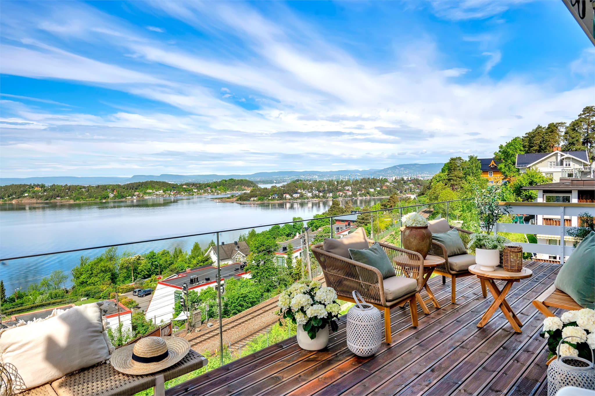 Entré - velkommen hjem! Leiligheten har en lys og innbydende entré som gir et godt førsteinntrykk. Entréen er romslig og praktisk utformet med enstavs eikeparkett på gulvet, som gir et helhetlig og elegant uttrykk. Veggene er malt i en lys og nøytral tone som skaper en varm atmosfære. Entréen har en skyvedørsgarderobe med speildører som både gir god oppbevaringsplass og bidrar til å forsterke romfølelsen. Denne løsningen er både stilren og funksjonell, og sørger for enkel organisering av yttertøy og sko. I taket er det montert downlights som gir jevn og behagelig belysning, og skaper et moderne preg. Stue: Leiligheten har en lys og moderne stue som fremstår som gjennomført etter en totaloppussing i 2022. Stuen har et stilrent interiør med enstavs eikeparkett på gulvet som gir et elegant preg. Veggene er malt i lyse, nøytrale farger som skaper en lun atmosfære. Store vindusflater gir mye naturlig lys og en fantastisk utsikt mot fjorden. Stuen har en åpen planløsning med plass til både sofagruppe og spisebord, og den moderne belysningen består av dekorative lamper og spotlights. Fra stuen er det direkte utgang til en romslig, vestvendt terrasse på 18 m² med stål- og glassrekkverk, noe som gjør terrassen til en naturlig forlengelse av oppholdsrommet. Rommet har varmefolie i gulvet, som gir jevn oppvarming og en behagelig bokomfort. Kjøkken: Leiligheten har et moderne og stilfullt kjøkken fra 2022, levert av HTH. Kjøkkenet har glatte, mørke skapfronter som gir et elegant og tidløst uttrykk. Benkeplatene i marmor tilfører en eksklusiv følelse, og den nedfelte oppvaskkummen med et greps armatur gir et funksjonelt og rent design. Kjøkkenet er godt utstyrt med god skapplass og har rikelig med benkeplass, som gjør det både praktisk og romslig. Det er fullt integrerte hvitevarer, inkludert oppvaskmaskin, mikrobølgeovn, stekeovn, induksjon koketopp, vinskap og kjøl-/fryseskap. Det er også montert både water-guard og komfyrvakt for ekstra sikkerhet. En integrert kullfilterventilator i koketoppen sørger for god ventilasjon uten behov for ekstern avtrekkskanal. Kjøkkenet er gjennomført med smarte løsninger som gjør det til et funksjonelt og stilfullt samlingspunkt i leiligheten. Soverom: Hovedsoverommet har en lys og harmonisk atmosfære med lyse, nøytrale vegger og store vindusflater som gir flott utsikt mot fjorden. Rommet har godt med plass til dobbeltseng, nattbord og oppbevaringsmøbler. Det er også en stor, åpen garderobeløsning med rikelig med skap- og hylleplass, som gir praktisk oppbevaring. Fra hovedsoverommet er det utgang til den vestvendte terrassen, som skaper en luftig følelse og gir mulighet til å nyte utsikten. Soverom 2 har en smart planløsning som legger til rette for en "walk-in"-garderobe. Det er god plass til seng og nattbord i rommets hoveddel, mens en egen avskjermet sone kan innredes som en praktisk garderobeløsning. Denne fleksible utformingen gjør rommet godt egnet som hovedsoverom nummer to, barnerom eller gjesterom. Store vinduer gir rikelig med dagslys og en åpen følelse. Soverom 3 er et koselig rom som også egner seg som barnerom eller gjesterom. Det har god plass til seng, kommode og eventuelt et mindre skrivebord. Rommet er preget av lyse vegger og store vinduer som slipper inn rikelig med lys. Baderom: Leiligheten har et eksklusivt og moderne baderom som ble totalrenovert i 2022. Opprinnelig bad og wc ble ribbet helt ned og bygget opp igjen med flislagte overflater og nytt sanitærutstyr. Badet har flislagte vegger med storformat fliser som gir et luksuriøst og helhetlig inntrykk. Hovedgulvet er dekket med store fliser, mens dusjnisjen har nedsenket gulv med mindre 10x10 fliser og fall mot rennesluk. Dusjnisjen er utstyrt med en dør i herdet glass som gir et moderne uttrykk. Baderommet er utstyrt med et lekkert frittstående badekar, samt en servant med skuffeinnredning som gir god oppbevaringsplass. Klosettet har en vegghengt skål og en innebygget sisterne for et ryddig og elegant utseende. Himlingen er utført med panelplater, og downlights er montert for god belysning. Det er varme i gulvet for ekstra komfort, og avtrekket fra baderommet er tilknyttet et felles mekanisk ventilasjonsanlegg. Vaskerom: Leiligheten har et funksjonelt og moderne vaskerom som ble etablert i en opprinnelig bod i 2022. Vaskerommet har flislagt gulv med storformat fliser som gir et rent og stilfullt uttrykk. Veggene er kledd med malte plater, mens taket er malt betong, noe som gir en helhetlig og praktisk innredning. Det er lagt opp vannopplegg for både vaskemaskin og vaskekum, og vaskemaskinen er plassert lett tilgjengelig. Det er også framført vannrør for eventuell montering av vaskekum. Membran og plastsluk med klemring er montert. Vaskerommet er ventilert via et felles mekanisk ventilasjonsanlegg, som sørger for god luftkvalitet. Rommet er effektivt utnyttet med god plass til både vask og oppbevaring, noe som gjør det praktisk i hverdagen.