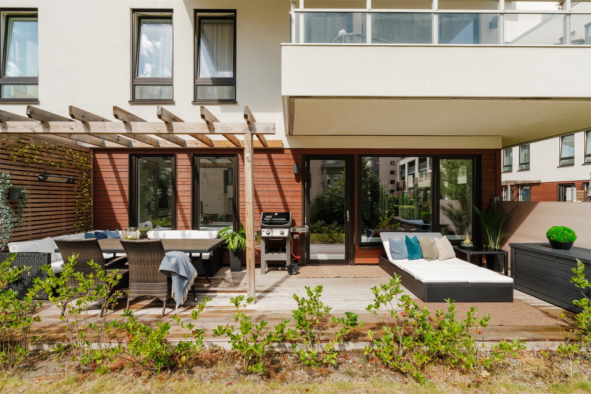 Entré Lys og innbydende entré med lekker eikeparkett og praktisk skyvedørsgarderobe som gir godt med oppbevaringsplass. Soverom 1 Romslig soverom med eikeparkett, garderobeskap og rene flater som gir et moderne uttrykk. Et behagelig rom som enkelt kan tilpasses både som hovedsoverom eller gjesterom. Soverom 2 Lyst og trivelig soverom med eikeparkett og god planløsning – perfekt som barnerom, kontor eller gjesterom. Bad Stilfullt bad med moderne fliser på både gulv og vegger, gulvvarme og innfellbare dusjvegger. Praktiske løsninger som vegghengt wc, innredning med skuffer, speil med lys og opplegg for vaskemaskin. Downlights i himling gir en elegant atmosfære. Kjøkken Tidsriktig kjøkken med mørk innredning, lys benkeplate og integrerte hvitevarer. Her har du en funksjonell arbeidsplass med et stilrent uttrykk. Stue Lys og luftig stue med eikeparkett, god takhøyde (2,6 m) og utgang til en solrik balkong på ca. 23 m² vendt mot sør/øst – perfekt for både morgenkaffen og lange sommerkvelder. Uteplass Romslig uteplass på ca. 23 m² med flott solforhold og god plass til både spisegruppe og lounge-møbler.