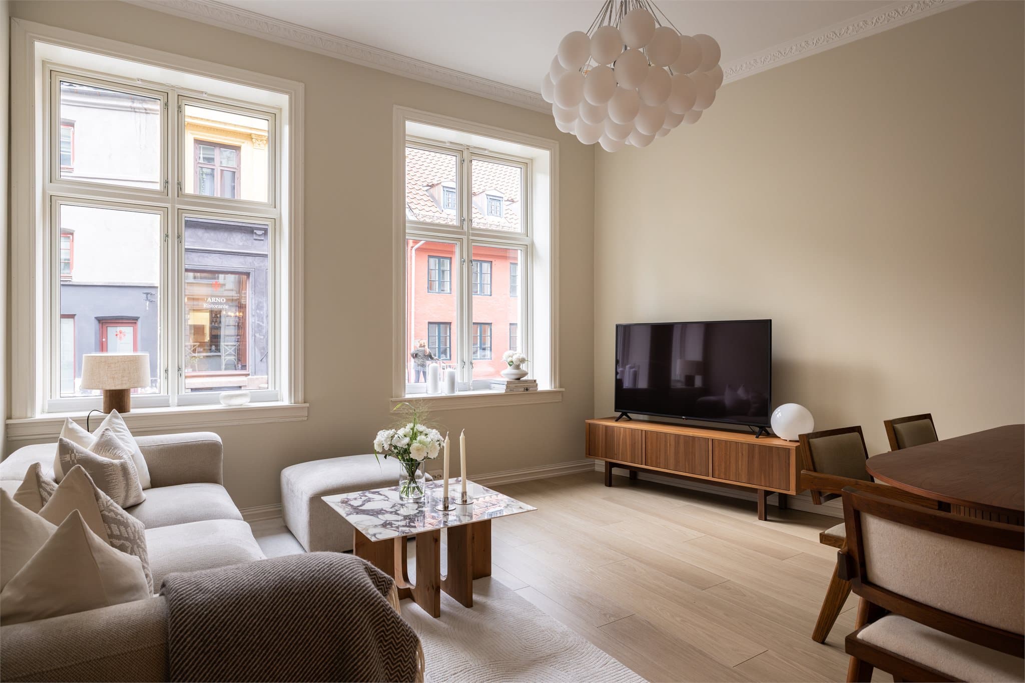Klassisk 2-roms med stukkatur og rosett, generøs takhøyde og moderne standard. Kjøkken 2024. Overflateoppusset 2024.