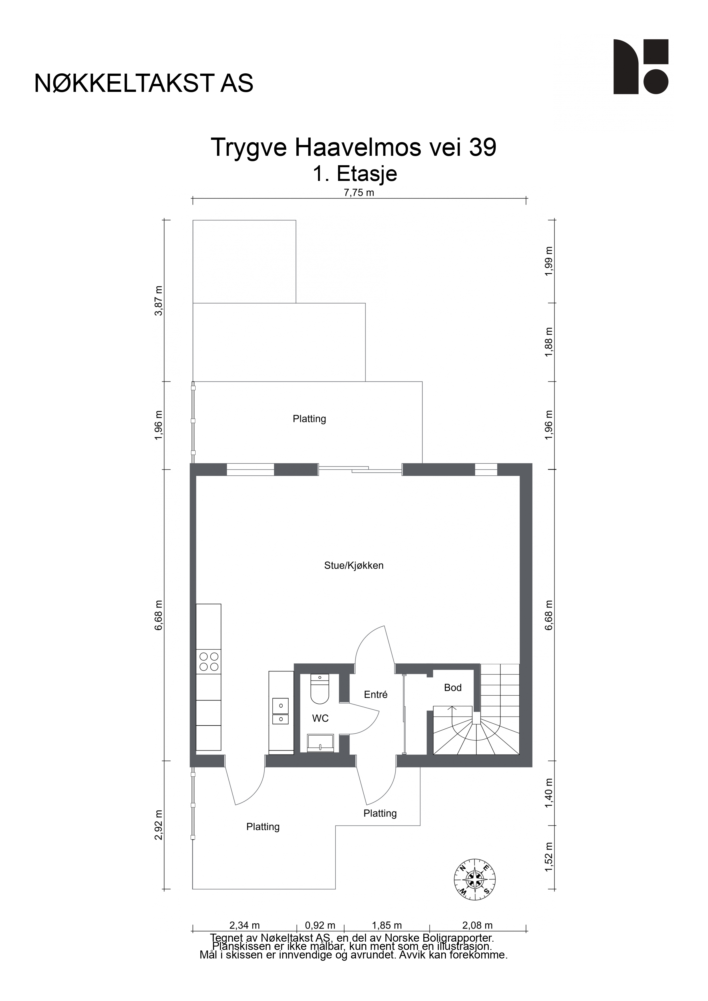 Boligen: 1. Etasje: Entré, stue, kjøkken og toalettrom 2. Etasje: Gang, 3 soverom, bod og bad Eiendommen har en biloppstillingsplass i carport. Mulighet for elbil lader. Det er bod i tilknytning til plassen. Selger har også benyttet seksjonert areal inntill boligen som biloppstillingsplass. Deler av terrassen er bygget utover seksjonert areal tilhørende eiendom. Arealet tilhører "kieller terrasse driftsforening". Arealet det er bygget på tilhører et større areal på totalt 4347 kvm, som brukes som området mellom rekkehusene/ boligene i området. Se vedlagt kart i prospekt.