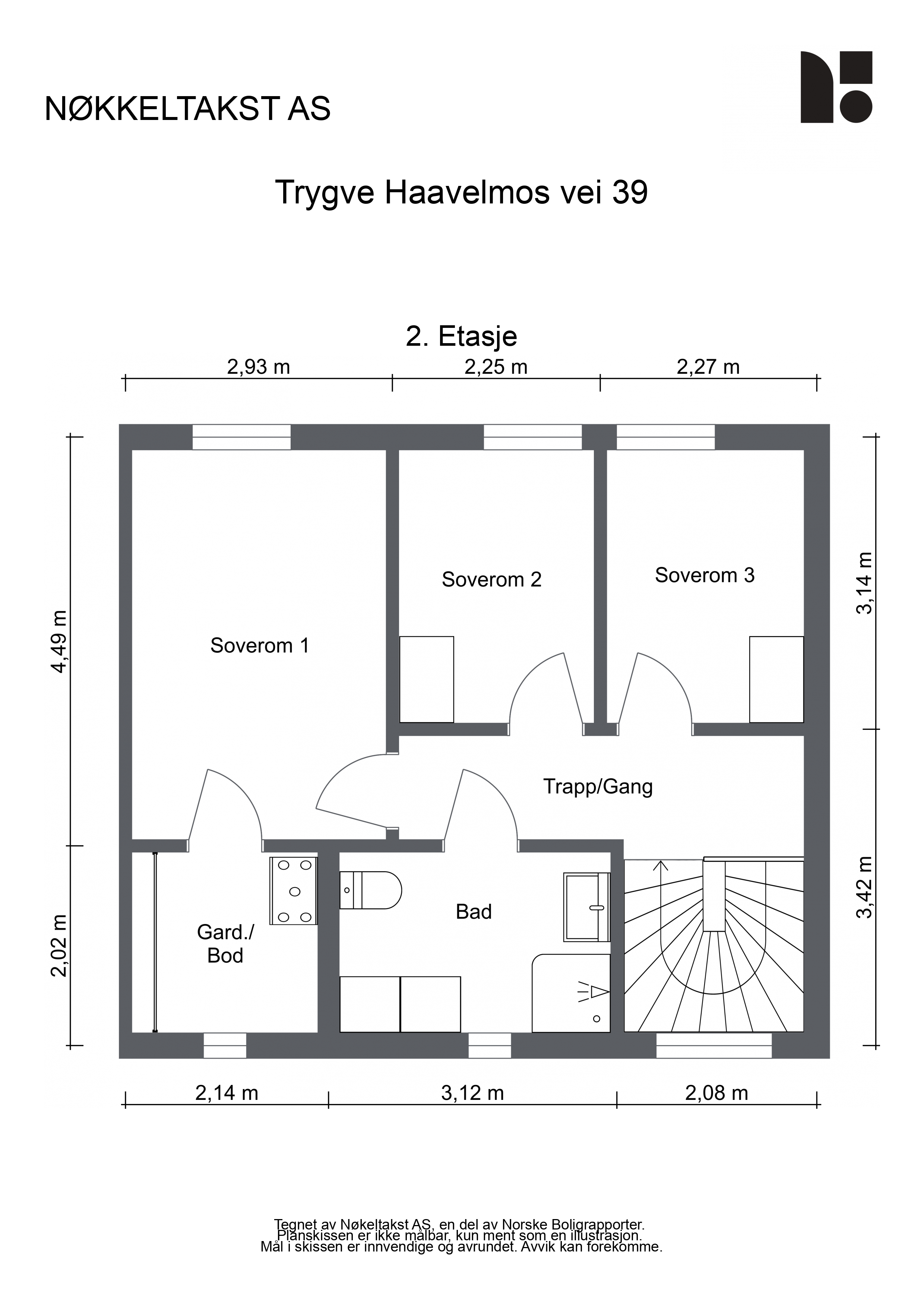 Boligen har en funksjonell og familievennlig planløsning over to plan. Entré med adkomst til bod og toalettrom,. Videre kommer man inn i en romslig og åpen stue- og kjøkkenløsning med gode møbleringsmuligheter for både sofagruppe og spiseplass. Kjøkkenet har innredning fra byggeår med glatte fronter, laminat benkeplate og integrerte hvitevarer. Fra stuen er det utgang til terrasse og uteplass. I denne delen av boligen finnes også et toalettrom med vegghengt toalett og servant. Den øvrige delen av boligen inneholder trappegang med adkomst til tre soverom, bad og garderobe/bod. Hovedsoverommet har god størrelse, mens de to øvrige soverommene egner seg godt som barnerom, gjesterom eller hjemmekontor. Badet er fra byggeår og har flislagte overflater, dusj på gulv, vegghengt toalett, servantinnredning og opplegg for vaskemaskin. Garderobe/bod gir praktiske oppbevaringsmuligheter. Boligen disponerer også terrasse og platting i tilknytning til stue og inngangsparti, samt en bod på ca. 5 kvm plassert bak carport.