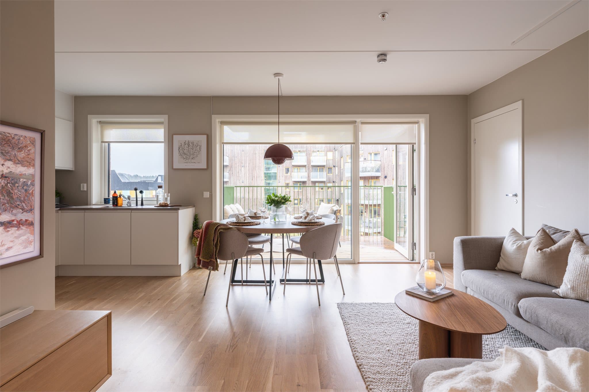 Velkommen inn i en arealeffektiv og moderne leilighet fra 2023. Boligen har en gjennomgående god standard med enhetlige overflater og en praktisk planløsning. Vannbåren gulvvarme i entré, stue og på bad gir en jevn og behagelig varme. Leiligheten består av en åpen stue- og kjøkkenløsning, et soverom, et separat kontor, bad og en romslig, sydøstvendt balkong. Entré: Entréen gir et godt førsteinntrykk med eikelaminat på gulv og downlights i himlingen. Her er det gulvvarme som sikrer en lun velkomst. Stue og kjøkken: Stuen og kjøkkenet utgjør et lyst og sosialt allrom. Kjøkkeninnredningen fra HTH har hvite, glatte fronter og en laminatbenkeplate. Alle hvitevarer er integrerte. Rommet har eikelaminat på gulv med vannbåren gulvvarme og god plass til både spisebord og sofagruppe. Store vindusflater og utgang til balkongen gir rikelig med naturlig lys. (Persiennen i stuen er ødelagt). Balkong: Fra stuen er det utgang til en sydøstvendt balkong på 9 m². Balkongen har tregulv og fungerer som en fin forlengelse av stuen på varme dager. Soverom: Soverommet har eikelaminat på gulv og plass til dobbeltseng. Et garderobeskap gir god oppbevaringsplass. Kontor: Leiligheten har et eget rom som egner seg godt som kontor eller hobbyrom. Rommet har eikelaminat på gulv og malte veggflater. Bad: Badet er flislagt med grå fliser på gulv og vegger, og har vannbåren gulvvarme. Innredningen består av en hvit servant med underskap, speil med belysning og et vegghengt toalett. Dusjsonen har innfellbare glassvegger og nedsenket gulv. Det er opplegg for vaskemaskin og mekanisk avtrekk. Overflater: Gulvoverflater: Gjennomgående eikelaminat i oppholdsrom. Grå 15x15 cm fliser på bad. Vegger: Malte gipsplater i lyse farger. Grå 30x60 cm fliser på bad. Himling: Hovedsakelig malte flater. Downlights i entré og på bad. Oppbevaring: Leiligheten disponerer en bod på 5 m² i kjelleren. Det er garderobeskap på soverommet. I tillegg medfølger en parkeringsplass i felles garasjeanlegg.