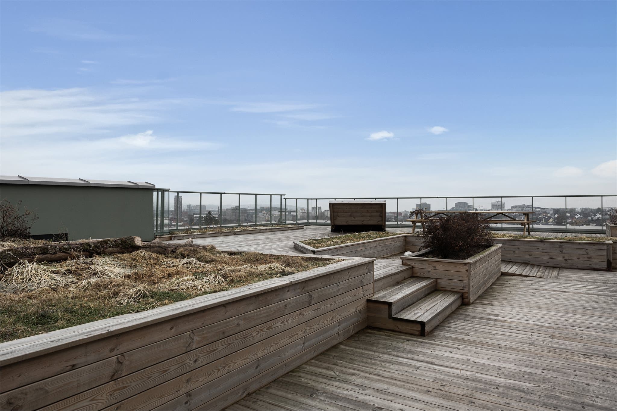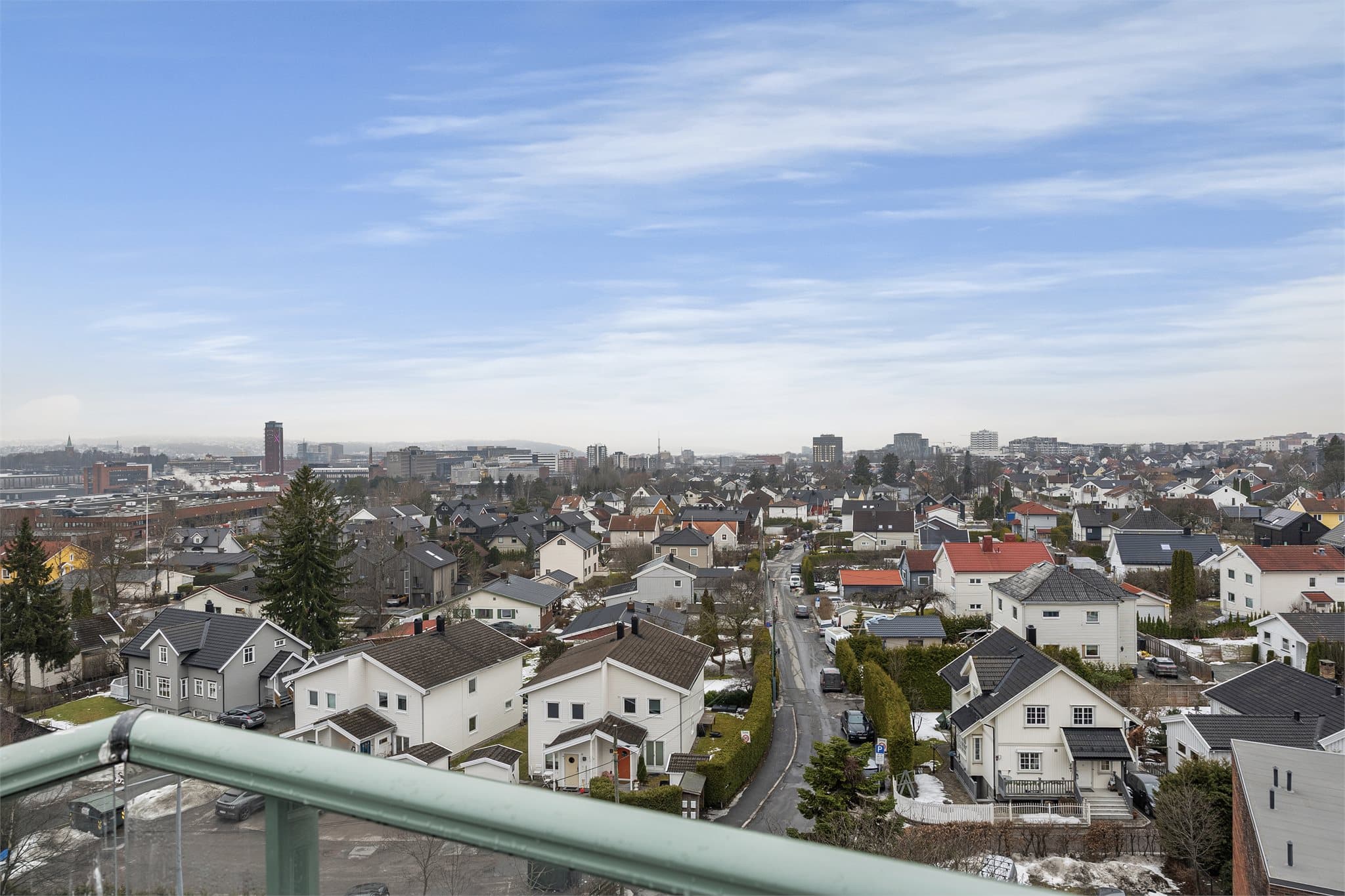 Dette er en ny, gjennomgående og arealeffektiv leilighet fra 2024 med en gjennomtenkt planløsning som skaper tydelige soner. Leiligheten ligger i bygningens 2. etasje, men adkomst til leiligheten skjer fra 1. etasje. Boligen holder en gjennomgående god standard med balansert ventilasjon og vannbåren varme. Entré: Leiligheten har en praktisk og innbydende entré, med gode oppbevaringsmuligheter for sko og yttertøy. I direkte tilknytning finner du en romslig innvendig bod, perfekt plassert for enkel og effektiv organisering i hverdagen. Stue og kjøkken: Leilighetens sosiale sone består av en luftig og stilren stue- og kjøkkenløsning på ca. 27 m², hvor åpne flater og en takhøyde på 2,50 meter gir en behagelig romfølelse. Det moderne kjøkkenet fra HTH (2024) fremstår både tidløst og funksjonelt, med glatte fronter og integrerte hvitevarer som platetopp, stekeovn, oppvaskmaskin og kombinert kjøl/fryseskap. Oppholdsrommet har plass til både sofagruppe og spisebord, noe som skaper en naturlig og harmonisk soneinndeling, perfekt for både hverdagsliv og hyggelige sammenkomster. Store, moderne vindusflater slipper inn rikelig med naturlig lys og bidrar til en lys og innbydende atmosfære. Balkong: Fra stuen er det utgang til en sørvendt og takoverbygget balkong på ca. 9 m². Overbygget gir ly og forlenger utesesongen. Balkongen har god plass til både utemøbler og grill, og blir en naturlig forlengelse av stuen under sommermånedene. Soverom: Soverommet er på ca. 13 m² og har plass til dobbeltseng og nattbord. En spesialtilpasset garderobeløsning med speilskyvedører og Pax-innredning gir rikelig med oppbevaringsplass. Bad/Vaskerom: Badet er lyst og moderne, levert som en prefabrikkert baderomskabin fra 2024. Rommet fremstår stilrent og funksjonelt, med downlights i taket som gir behagelig belysning. Her er det varmekabler i gulvet, vegghengt toalett, praktisk servantinnredning med speilskap og et dusjhjørne med elegante glassdører. Det er også opplegg for vaskemaskin, noe som gjør badet både komfortabelt og svært brukervennlig i hverdagen. Overflater: - Gulvoverflater: Laminat i tørre rom. Fliser på bad. - Vegger: Glatt malt utførelse i tørre rom. Fliser på bad. - Himling: Glatt malt utførelse i tørre rom. Plater med innfelte downlights på bad. Lagring: Leiligheten disponerer en innvendig bod på ca. 2 m² og en ekstern sportsbod på 5 m² i kjelleren. Takterrasse: Felles takterrasse med gode solforhold og flott utsikt over nærområdet. Her er det hyggelige sitteplasser, både åpent og under pergola, som gir fine rammer for sosiale sammenkomster og avslapning.