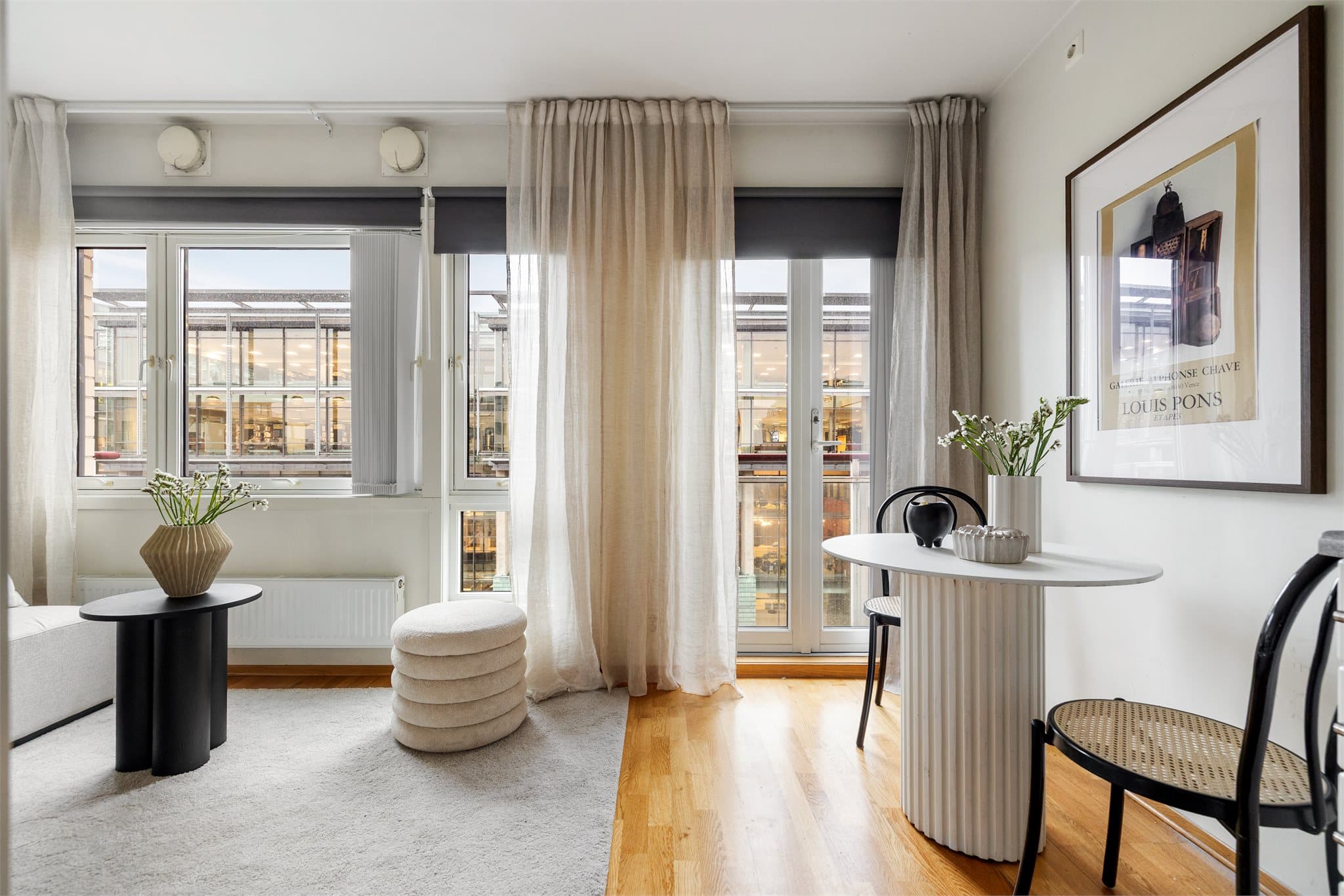 En arealeffektiv leilighet i 7. etasje med heisadkomst, beliggende i et moderne bygg fra 2007. Planløsningen er åpen og binder soveplass, stue og kjøkken sammen, noe som utnytter de 26 kvadratmeterne godt. Standard og overflater er hovedsakelig fra byggeåret. Entré: Lys og innbydende entré med gode oppbevaringsmuligheter i romslig garderobeløsning. Praktisk planløsning gir en ryddig og funksjonell velkomst, med naturlig flyt videre inn i boligen. Stue/kjøkken: Lys og innbydende stue med store vindusflater som slipper inn rikelig med naturlig lys og gir en luftig romfølelse. Stuen har en åpen og praktisk forbindelse til kjøkkenet, noe som skaper et sosialt og funksjonelt allrom. Med en takhøyde på ca. 2,51 meter oppleves rommet som romslig, og planløsningen gjør det enkelt å innrede med både sofagruppe og en hyggelig spiseplass ved vinduet. Det er også gode muligheter for å etablere en naturlig soneinndeling, slik som vist med egen plass til seng. Oppvarming skjer via radiator tilknyttet fjernvarme, som gir en jevn og behagelig innetemperatur. Kjøkkenet har en stilren innredning med glatte, folierte fronter som gir et tidløst uttrykk. Benkeplaten i laminat med nedfelt vaskekum gir gode arbeidsflater, og flislagt vegg over benk gjør både vedlikeholdet enkelt og helhetsinntrykket delikat. Det er tilrettelagt for oppvaskmaskin. Fra oppholdsrommet er det utgang via en tofløyet dør til en hyggelig luftebalkong, perfekt for å slippe inn frisk luft eller nyte morgenkaffen. Luftebalkong: Balkongen er en privat uteplass på ca. 0,7 m² med rekkverk i glass og metall. Bad/WC: Badet fremstår som lyst og funksjonelt, med flislagte overflater som gir et rent uttrykk. Gulvet er utstyrt med elektriske varmekabler som sørger for en behagelig temperatur. Dusjsonen er praktisk utformet som et nedsenket dusjhjørne med glassdører. Innredningen består av en romslig servant med underskap som gir oppbevaringsmuligheter, speil med belysning over samt et vegghengt toalett. Det er tilrettelagt for vaskemaskin. Overflater: Gulvoverflater: 3-stavs eikeparkett i oppholdsrom. Fliser på bad. Vegger: Malte flater i oppholdsrom. Fliser på bad. Himling: Prefabrikerte, malte himlinger. Lagring: Leiligheten disponerer en bod på cirka 5 m² i kjelleren.