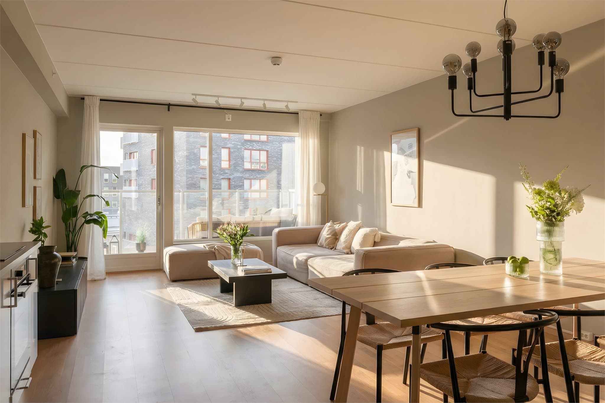 Bak inngangsdøren blir dere møtt av en lys og innbydende entré. Her er det god plass til garderobeløsninger og oppbevaring, og en praktisk utforming som gir et ryddig førsteinntrykk. Lyse overflater og parkettgulv bidrar til en moderne og behagelig atmosfære. Luftig og sosialt oppholdsrom Leiligheten har et lyst og stilrent oppholdsrom med åpen løsning mellom stue og kjøkken. Store vindusflater gir rikelig med naturlig lys og gir en luftig romfølelse. Det er god plass til både sofagruppe og stor spiseplass, og kjøkkenet har tidløs innredning med god kombinasjon av skap- og benkeplass. Dette er et rom som fungerer like godt til hverdags som til sosiale sammenkomster. Badet Badet byr på lyse fliser, innfelt belysning og moderne innredning. Det er dusjhjørne med glassdører, vegghengt toalett og god benke- og oppbevaringsplass. Praktisk opplegg for vaskemaskin gir en funksjonell og praktisk baderomsløsning. Separat toalettrom Praktisk separat toelttrom med vegghengt wc og moderne innredning. Hovedsoverom Hovedsoverommet fremstår lunt og innbydende med behagelige fargetoner og god plass til dobbeltseng. Store vindusflater gir rikelig med naturlig lys og en luftig følelse. Rommet har et eget walk-in, romslig garderobeløsning og direkte adkomst til en praktisk luftebalkong. Barnerom Barnerommet er lyst og trivelig med behagelige fargetoner. Rommet har en fin størrelse med plass til seng, oppbevaring og lek, og kan enkelt tilpasses ulike behov og livsfaser. Soverom 3 Det tredje soverommet fremstår lyst og funksjonelt med store vindusflater. Rommet har en praktisk utforming med plass til seng, garderobeløsning og arbeidsplass - perfekt som barnerom, gjesterom eller hjemmekontor.