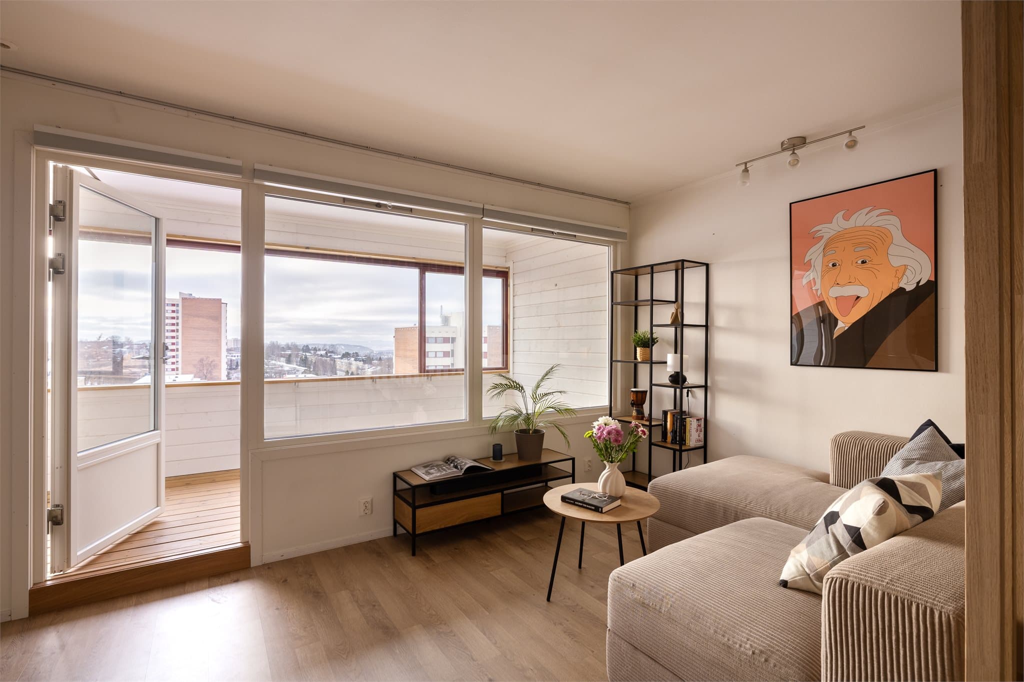 Velkommen til Tvetenveien 231! En pen leilighet som ligger høyt i 10. etasje med flott utsikt og en arealeffektiv planløsning. Dette er en smart og arealeffektiv leilighet, ideell for etablerere. Beliggenheten er sentral, men samtidig rolig og barnevennlig, med nærhet til både servicetilbud og marka. Med T-banen kun et par minutter unna blir hverdagen enkel. Nyt utsikten fra den store, innglassede balkongen som blir en naturlig forlengelse av stuen. Høydepunkter: Stor innglasset balkong på 10 m² med vidstrakt utsikt og gode solforhold Bad oppusset 2019 To boder for god lagringsplass Varmtvann ink. i fellesutgifter Kort vei til T-bane og turområder Velkommen til visning!
