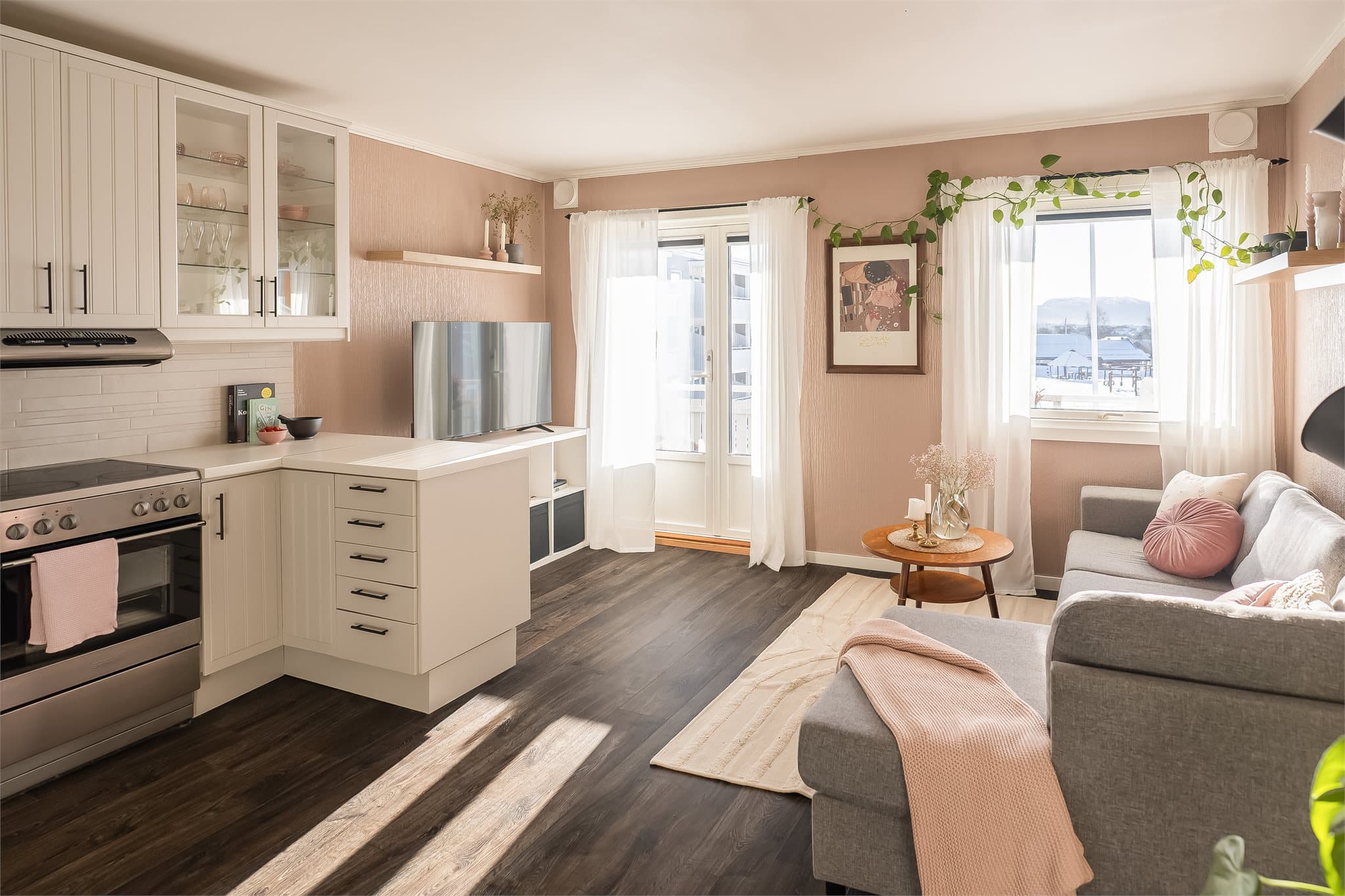 Velkommen hjem! Bak inngangsdøren møtes du av en lys og innbydende entré med plass til yttertøy og sko. Gangen binder leilighetens rom sammen på en praktisk måte og gir en naturlig flyt gjennom boligen. Leiligheten ligger i 2. etasje, ytterst i tunet, med en svært god beliggenhet. Herfra har du utsikt mot grønne fellesområder og Vassfjellet. Videre finner du et lyst og arealeffektivt bad med gulvvarme, som gir ekstra komfort på kalde dager. Sovealkoven er praktisk innredet med integrerte skap og skaper en skjermet soveplass uten at boligens romfølelse går tapt. Boligens midtpunkt er det lyse og trivelige oppholdsrommet, som inviterer til både avslapning og sosialt samvær. Stue og kjøkken har åpen løsning som gir lys og luftig romfølelse. Den gjennomtenkte planløsningen gir plass til både sofagruppe og spisebord, og gjør det enkelt å innrede flere hyggelige soner. Overflatene er holdt i moderne og lune farger, noe som gjør det enkelt å sette ditt personlige preg på boligen. Fra stuen er det utgang til en sørvendt og romslig balkong med sol fra morgen til kveld. Balkongen har flott utsikt over tunet og fellesområdene, og fungerer som en naturlig forlengelse av stuen på fine sommerdager. Kjøkkenet er lyst og tidløst med god lagringsplass i skap og skuffer. Den praktiske L-formen gir gode arbeidsflater og skaper et naturlig skille mellom stue og kjøkken, samtidig som åpenheten beholdes. Borettslaget har flotte, opparbeidede fellesområder med plen, gangveier og lekeplass. Leiligheten disponerer to eksterne boder som gir rikelig med lagringsplass, i tillegg til felles sykkelbod for beboerne i blokken. Denne leiligheten er ideell for førstegangskjøpere, studenter, par eller de som ønsker en praktisk og lettstelt bolig. Den er arealeffektiv, har en gjennomtenkt planløsning og rommer alt man trenger på en smart måte. Med lys, åpen stue/kjøkken-løsning, solrik balkong og god lagringsplass får du en praktisk og trivelig bolig med flott beliggenhet.