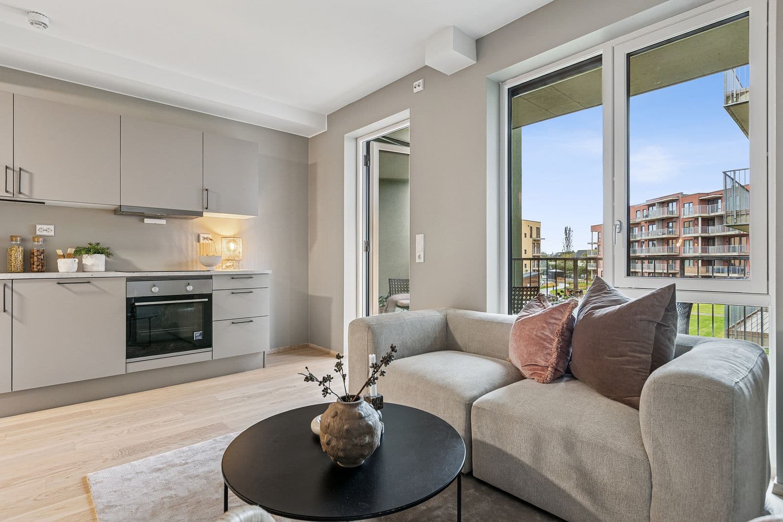 Velkommen hjem! Velkommen til en lekker og delikat 2-roms selveierleilighet fra 2024. Boligen har en gjennomtenkt planløsning med en sosial sone bestående av stue og kjøkken. Fra stuen er det utgang til en romslig balkong med utsikt mot velstelte fellesarealer. Balkongen blir en naturlig forlengelse av stuen på fine sommerdager. Gjennomgående høy standard og balansert ventilasjon gir en behagelig atmosfære, og oppvarming skjer via fjernvarme. Entré Du ønskes velkommen inn i en lys entré med parkett på gulvet og store vindusflater som gir et innbydende førsteinntrykk. Her er det plass til å møblere med ulike oppbevaringsløsninger. Stue Stuen er et lyst og åpent rom med parkett og vegger i nøytrale, behagelige farger. Rommet har god plass til sofagruppe og fungerer som et naturlig samlingspunkt for både hverdag og besøk. Kjøkken Kjøkkenet har en stilren og delikat innredning fra HTH med glatte fronter og laminat benkeplate. Det er utstyrt med integrerte hvitevarer, inkludert koketopp, stekeovn, oppvaskmaskin og kombi kjøl/frys, og er plassert slik at det fremmer både sosialt samvær og effektiv matlaging. Baderom Boligen har et moderne, flislagt baderom med dusjhjørne med innfellbare dører, vegghengt toalett, servantinnredning fra HTH, speil med lys og opplegg for vaskemaskin. Rommet har gulvvarme og downlights i taket, som gir både komfort og en moderne utførelse. Soverom Soverommet er lyst og innbydende, med plass til både seng og garderobeløsning. Den store vindusflaten sikrer rikelig med naturlig lys og en behagelig atmosfære. Ekstra lagringsplass Leiligheten disponerer en egen kjellerbod som gir godt med lagringsplass og praktisk oppbevaring.