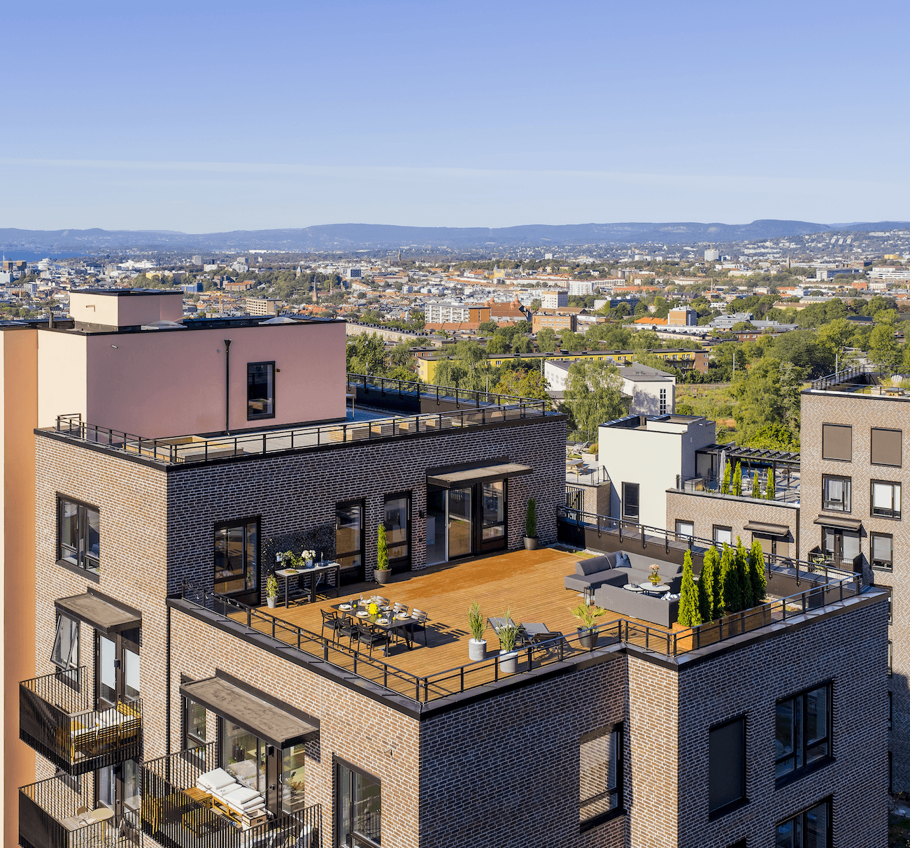 I byggets 7. etasje, som også er toppetasjen, finner du denne lekre leiligheten med moderne løsninger, gjennomtenkt planløsning og høy kvalitet i materialvalg. Boligen fremstår som velholdt og innbydende, og byr på både balkong og en stor privat takterrasse - perfekt for sosiale sammenkomster og hverdagsnytelser. Planløsning og romfordeling Leiligheten har en funksjonell entré med gode oppbevaringsmuligheter, samt callinganlegg som gjør det enkelt å slippe inn gjester. Her får man et godt førsteinntrykk! Videre finner man fire soverom, åpen stue- og kjøkkenløsning, samt to baderom - ett ved entré og ett tilknyttet soveromsdelen. Stue og kjøkken Den åpne stue- og kjøkkenløsningen har en romslig og luftig atmosfære med målt takhøyde på ca. 2,59 m. Fra stuen er det utgang både til en balkong på ca. 10 m² og en unik privat takterrasse på hele ca. 104 m². Terrassen har samme solide utførelse som balkongen, med malt/beiset tregulv og i tillegg etablert utekjøkken. Her kan man virkelig nyte solrike dager og lange sommerkvelder i et romslig og privat uteområde. Kjøkkenet er fra Sigdal (byggeår), med glatte, folierte fronter og laminert benkeplate med nedfelt kum i rustfritt stål. Innredningen fremstår som moderne og vedlikeholdt, og har kjøkkenøy i samme utførelse som øvrig innredning. Kjøkkenet er tilrettelagt med platetopp, oppvaskmaskin, stekeovn og kombi kjøl/frys. Komfyrvakt samt aquastop/lekkasjevarsler med sensorer og magnetventil er installert. Belysning er elegant løst med downlights under overskap. Baderom Begge badene er prefabrikkerte våtromskabiner fra byggeåret og oppført etter teknisk forskrift 2017. Bad ved soverom: Flislagt med gulvvarme, servantskap med glatte fronter og heldekkende servant, speil og lysarmatur, dusjhjørne med svingdører og håndholdt dusj, samt veggmontert toalett. Bad ved entré: Flislagt med gulvvarme, servantskap med glatte fronter og heldekkende servant, speil med belysning, opplegg for vaskemaskin, dusjhjørne med svingdører og veggmontert toalett. Begge bad har balansert ventilasjon, avtrekksventil i himling, samt tilluft via spalte ved terskel. Soverom Leiligheten har totalt fire soverom av god størrelse. Alle med generøs størrelse og gjennomtenkte løsninger, tilrettelegger for både barn, gjester eller hjemmekontor. Soverom 1 Hovedsoverommet er romslig med god plass til dobbeltseng og medfølgende garderobeskap hvor du har plass til alt av tøy og diverse. Et soverom med ekte New York-feeling. Her våkner du til en sinnssyk utsikt som strekker seg langt utover horisonten, både på dagtid og når byen glitrer om kvelden. Harmoniske fargetoner og stilrene overflater skaper en rolig atmosfære. Soverom 2 Et romslig soverom med god plass til dobbeltseng og kontor om ønsket. Dette rommet kan også benyttes som ekstra tv-stue. Her er det godt tilrettelagt for både store og små familier! Soverom 3 Dette er det typiske barne-/gjesterommet med plass til seng og ønsket skapinnredning. Soverom 4 Enda et romslig soverom som i dag er benyttet som kontor. Her har man også plass til dobbeltseng og en garderobeløsning om ønskelig. Her fra har man også en nydelig utsikt over nærområde. Øvrige fasiliteter Leiligheten disponerer en bod i kjeller på ca. 6,5 m² samt en privat garasjeplass. I tillegg har sameiet felles sykkelbod med sykkelvask i kjeller, samt en spektakulær takterrasse i 8. etasje. Et sosialt samlingspunkt med sinnssyk utsikt over byen og landskapet. Selvaag har i tillegg bemerket følgende: "I fremtidige hus B planlegger vi et fellesareal for beboerne med oppholdsrom, kjøkken og arbeidsrom. Det vil også etableres to «hotellrom» som beboerne kan benytte til sine gjester." + "topp- og endeleilighet med storslagen utsikt over by og fjord. Lys fra tre sider." Bygg og fasade Bygningen har en moderne og solid utførelse med fasade i sprekkmurt teglstein og fasadeplater. Både balkong og terrasse er utstyrt med utvendig stikkontakt og lysarmatur, og alle konstruksjoner er utført i stål og betong for varig kvalitet. Avtrekk: Kjøkkenventilator over stekesone, med tilknytning til det balanserte ventilasjonsanlegget. Eventuelle filter i kjøkkenventilatoren bør rengjøres/skiftes regelmessig for å unngå at fett fester seg og skaper brannfare. Ventilasjon: Leiligheten er basert på balansert ventilasjon med varmegjenvinning. Elektrisk anlegg: Sikringsskap lokalisert i skap i entré. Automatsikringer med jordfeilbrytere. Hovedsikring og 9 fordelingskurser. Selvavlesende strømmåler er installert i felles tavle. Det foreligger kursfortegnelse i skap. Branntekniske forhold: Brannslukkingsapparat i leiligheten. Røykvarslere er installert. Vannledninger: Vannførende rør i plast (rør i rør opplegg). Rørstokk er lokalisert i fordelerskap i vegg på begge baderommene. Fordelerskapene har overløp med avrenning til bad (rom med sluk). Avløpsrør: Interne og synlig avløpsrør i plast. Øvrige avløpsrør er felles for bygningen og ikke inspisert/vurdert I forbindelse med salget er det utarbeidet en tilstandsrapport fra bygningssakkyndig. Rapporten gir en teknisk vurdering av boligen og påviser eventuelle avvik. Det er viktig å merke seg at forhold som er vurdert med TG2 og TG3 bør gjennomgås nøye, ettersom disse indikerer avvik fra normal slitasje eller høy alder, og kan medføre behov for utbedring. Bygningsdeler vurdert med TGIU er ikke blitt undersøkt av takstmann. Bygningsdeler som ikke er undersøkt (TGIU): - Våtrom > 7. Etasje > Bad v/entré > Tilliggende konstruksjoner våtrom - Våtrom > 7. Etasje > Bad v/sov > Tilliggende konstruksjoner våtrom Tilstandsrapporten for boligen er vedlagt salgsoppgaven. For mer detaljert informasjon om tilstandsgradene, vennligst se rapporten.