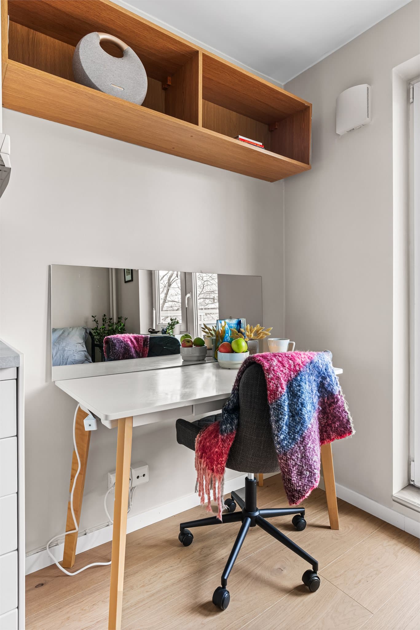 Dette er en arealeffektiv og praktisk 1-roms leilighet i 3. etasje. Leiligheten har en åpen løsning som utnytter plassen godt, og en egen balkong på ca. 3 m². Vinduene og balkongdøren ble produsert i 2008. Entré: Leiligheten har en brann- og lydklassifisert dør (B-30/35dB). Plassen er godt utnyttet med et plassbygd garderobeskap for oppbevaring. Kjøkken/stue: Kjøkkeninnredningen er praktisk plassert langs én vegg, noe som gir en effektiv arealutnyttelse og god gulvplass i rommet. Innredningen fremstår moderne med glatte, hvite fronter, laminat benkeplate og flislagt vegg over arbeidsområdet. Kjøkkenet er utstyrt med nedfelt oppvaskkum i rustfritt stål samt ventilator over kokesonen. Rommet fremstår som lyst og arealeffektivt, med en åpen løsning som kombinerer stue, soveplass og kjøkken på en funksjonell måte. Takhøyden på ca. 2,47 meter bidrar til en luftig romfølelse til tross for det kompakte arealet. Store vindusflater sørger for rikelig med naturlig lys. Rommet er enkelt å innrede og gir naturlig plass til både sovesofa og en mindre arbeidsplass. Oppvarming skjer via radiatorer tilknyttet byggets fellesanlegg. Balkong: Fra stuen er det utgang til en hyggelig balkong på ca. 3 m². Balkongen har plass til et lite kafésett og fungerer som en fin forlengelse av oppholdsrommet på varme dager, med gode muligheter for å nyte utearealet i rolige omgivelser. Bad: Badet er delikat flislagt og har elektriske varmekabler i gulvet, noe som gir god komfort. Rommet er utstyrt med dusjløsning på gulv, servant med underskap samt vegghengt toalett med innebygget sisterne. Rommet har mekanisk avtrekk. Vannrørene er lagt i et rør-i-rør-system, med fordelerskap og hovedstoppekraner plassert på badet. Badet er fra 2008 og har et oppgraderingsbehov. Overflater: Gulv: Laminat. Fliser på bad. Vegger: Sparklede og malte overflater. Fliser på bad. Himling: Pussede og malte overflater. Lagring: Leiligheten disponerer en ekstern bod på ca. 1 m² i kjelleren. I tillegg er det et garderobeskap i entréen.