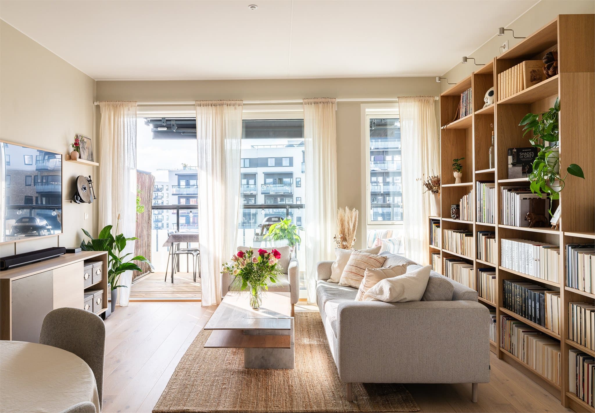 Våtrom - To fullverdige bad Leiligheten har to plassbygde baderom med flislagte overflater og vannbåren gulvvarme. Begge badene fremstår moderne og delikate med innfellbare dusjdører, vegghengt toalett og innredning med glatte fronter. Hovedbadet er romslig og har i tillegg opplegg for vaskemaskin og tørketrommel, samt god plass til oppbevaring. Kjøkken Lekkert kjøkken med innredning med glatte skapfronter, benkeplate av stein og integrerte hvitevarer. Kjøkkenet har god skap- og benkeplass, åpen løsning mot stuen, samt plass til spisebord. Kvalitetsmessig fremstår kjøkkenet påkostet med moderne løsninger. Soverommene Leiligheten har tre soverom av god standard. Alle rommene har god plass til seng, garderobeløsning og ønsket møblement. Hovedsoverommet er romslig og har direkte adkomst til eget bad, samt utgang til privat balkong. Det er installert utvendig solskjerming på alle soverommene. Stue Lys og åpen stue med store vindusflater som gir rikelig med naturlig lysinnslipp. Stuen har god plass til både sofagruppe og spiseplass, og har utgang til en av leilighetens solrike balkonger. Balkonger Leiligheten har to solrike balkonger vendt mot vest. Balkongene er på henholdsvis ca. 4 kvm og ca. 10 kvm, og gir gode muligheter for både avslapning, grilling og sosiale sammenkomster. Entré Innbydende entré med plass til garderobeløsning og oppbevaring. Rommet fremstår lyst og praktisk, og gir et godt førsteinntrykk av boligen.