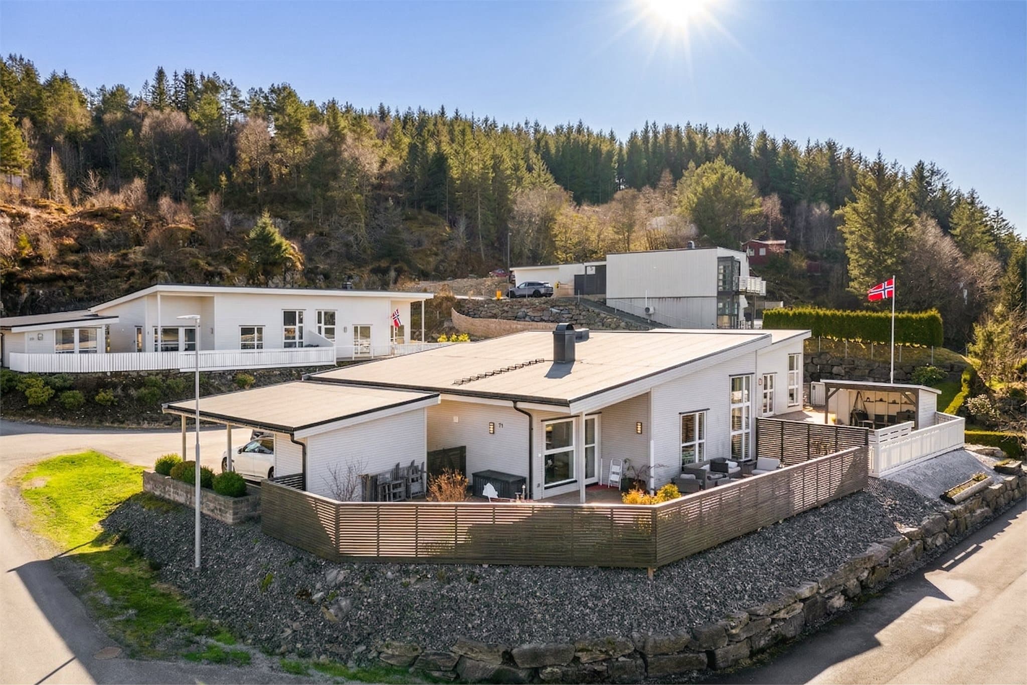 Alt på ett plan: Enebolig fra 2016 i naturskjønt boligområde m/nærhet sjø. 80 m² terrasse, carport & trappefri tilkomst