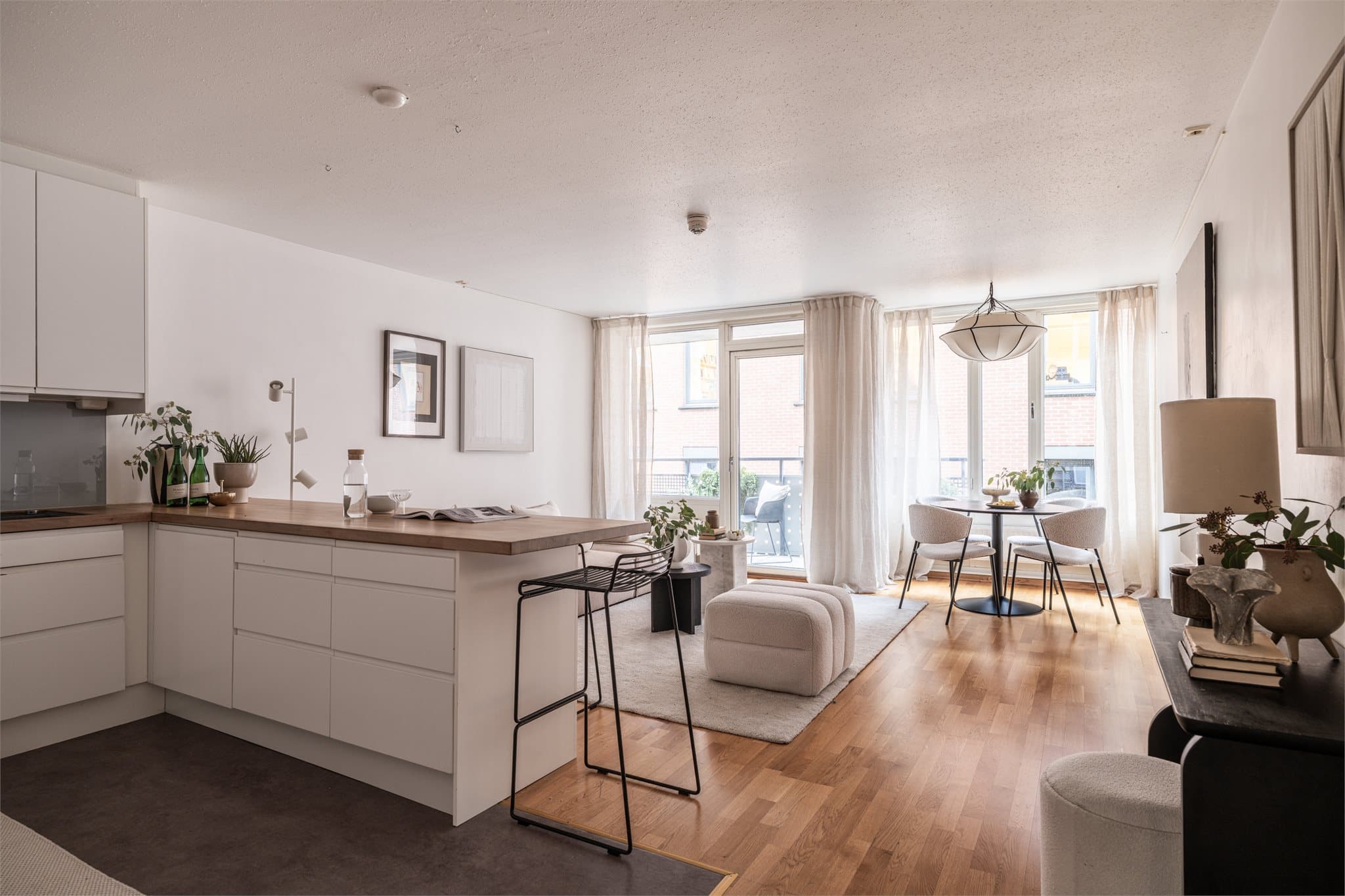 Entré Leiligheten åpner seg i en lys og romslig entréhall med dørcalling som umiddelbart gir en følelse av god plass. De lyse overflatene og den gjennomgående parketten skaper et behagelig førsteinntrykk, samtidig som utformingen gir en naturlig flyt videre til både oppholdsrom og soverom. Her får du en velorganisert start på leiligheten, med plass til yttertøy og oppbevaring uten at rommet oppleves trangt. Stue Stuen fremstår som et elegant og innbydende oppholdsrom med store vindusflater som slipper inn rikelig med naturlig lys. Rommet gir gode muligheter for fleksibel møblering og personlig styling. Den åpne forbindelsen mot kjøkkenet skaper et sosialt oppholdsareal som fungerer som hjemmets naturlige samlingspunkt. Her får du et oppholdsareal som lett kan tilpasses ulike livssituasjoner og ønsker. Kjøkken Kjøkkenet ble oppgradert i 2015 og er levert av Epoq, kjent for tidløse uttrykk og gode funksjonelle løsninger. Innredningen består av glatte fronter og en heltre benkeplate som gir varme og karakter til rommet. Den planlimte kummen og glassplaten over benken gir en moderne og ren finish. En integrert barløsning bidrar til ekstra arbeidsplass og fungerer som et naturlig knutepunkt mellom stuen og kjøkkenet, perfekt for både matlaging og hyggelige samtaler. Kjøkkenet har integrerte hvitevarer og er godt tilrettelagt for både hverdagsbruk og selskaper. Baderom Baderommet har en klassisk og funksjonell utforming med fliser på vegger og gulv. Det er utstyrt med badekar med dusjløsning, vegghengt toalett og opplegg for vaskemaskin. Varmekabler i gulvet gir god komfort, og planløsningen gjør rommet enkelt å bruke og innrede. Badets mosaikkpreg gir rommet ett uttrykk med personlighet. Hovedsoverom Hovedsoverommet ligger skjermet til i boligens mest private del og har en svært god planløsning. Rommet byr på en egen, lett tilbaketrukket nisje med vindu mot den pene og rolige bakgården, perfekt for en arbeidsplass, sminkebord eller en liten lesesone. Den naturlige inndelingen av rommet gjør det enkelt å skape både en soveavdeling og en funksjonell ekstra sone uten at rommet føles trangt. De lyse overflatene og det fine utsynet gir en behagelig ro, og rommet fremstår som et ideelt sted for avkobling og privatliv. Soverom Det andre soverommet har en god størrelse og en praktisk utforming som gjør rommet svært fleksibelt i bruk. Her er det plass til seng, garderobe og øvrig innredning, samtidig som rommet egner seg like godt som kontor, gjesterom eller hobbyrom. Garderobeløsningen som står i begge soverommene følger med, og gir rommet gode oppbevaringsmuligheter fra første stund. Innvendig bod En romslig innvendig bod gir gode og praktiske oppbevaringsmuligheter i hverdagen. Det medfølger også en ekstern bod i kjeller på ca. 5 m², perfekt til sesongutstyr og øvrige eiendeler. Balkong Den fine balkongen på ca. 7 m² blir raskt et favoritthjørne i hjemmet. Her er det god plass til både sittegruppe og planter, og beliggenheten gir et luftig og trivelig uteområde hvor man kan nyte rolige stunder. Balkongen ligger skjermet fra direkte trafikk, noe som gir en behagelig atmosfære og et mer privat preg. Øvrig informasjon: Innvendige overflater Boligen har gjennomgående trestavsparkett som gir et varmt og moderne uttrykk. Veggene er lyse og nøytrale, noe som forsterker romfølelsen og gir gode muligheter for personlig styling. Himlingen er jevn og malt i lys tone, som gjør rommene enda mer åpne og luftige. Vinduer Vinduer og balkongdør med isolerglass sørger for godt lysinnslipp og et behagelig inneklima gjennom året. Dører Entrédøren er brann- og lydklassifisert, mens de innvendige dørene har en glatt og moderne utførelse som harmonerer med boligens øvrige stil.