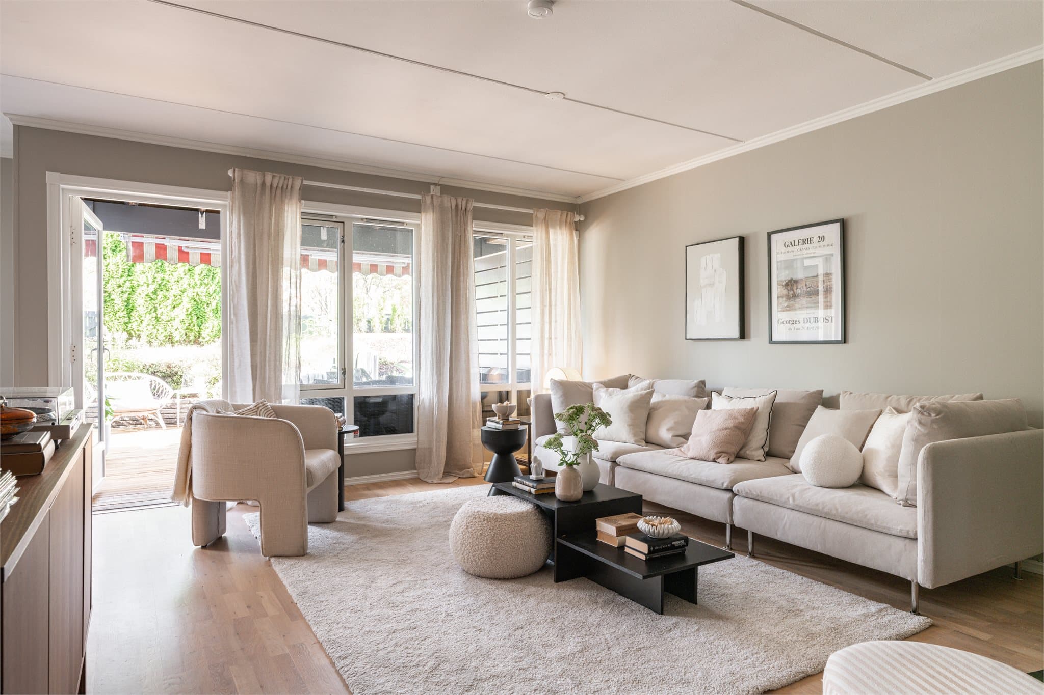 Entré og hall: Leiligheten har adkomst via svalgang, og rett ved inngangspartiet finner du en praktisk utvendig bod. Innenfor møtes du av en lys entré med flislagt gulv samt oppbevaringsmuligheter for sko og yttertøy bak skyvedørsgarderobe. Fra hallen er det tilgang til alle rom, samt en innvendig bod som gir ekstra oppbevaringsplass. Stue og kjøkken: Boligen har en åpen løsning mellom stue og kjøkken, men med naturlig inndelte soner. Her er det god plass til både sofakrok og spisebord. Stuen har store vindusflater som slipper inn rikelig med lys, og en vedovn skaper en varm og hyggelig atmosfære på kalde dager. Fra stuen har du direkte utgang til en stor terrasse og hage, en naturlig forlengelse av oppholdsrommet. Kjøkkenet er fra Ikea og har profilerte fronter. Her er det laminat benkeplate med oppvaskkum og 1-greps blandebatteri, samt fliser og belysning over benk. Innredningen er utstyrt med integrert oppvaskmaskin, frittstående komfyr og plass til kjøl/fryser. Soverom: Leiligheten har to soverom. Hovedsoverommet er romslig med plass til dobbeltseng og garderobe, og har 3-stavs eikeparkett. Det andre soverommet har laminatgulv, og passer perfekt som barnerom, gjesterom eller hjemmekontor. Bad: Badet fremstår tidløst og innbydende, med flislagte vegger og gulv. Det er innredet med dusjhjørne med innfellbare glassdører, servantinnredning med heldekkende servant, speil med belysning, frittstående toalett og opplegg for vaskemaskin. Terrasse og hage: Fra stuen går du rett ut på en vest-sydvestvendt markterrasse på ca. 36 m² i trekonstruksjon, lagt med terrassebord. Her er det montert både lys, stikk og markise, som gjør terrassen til et perfekt sted å nyte lange sommerkvelder. Utenfor terrassen ligger en grønn og pent opparbeidet hage, ideell for både lek og avslapning.