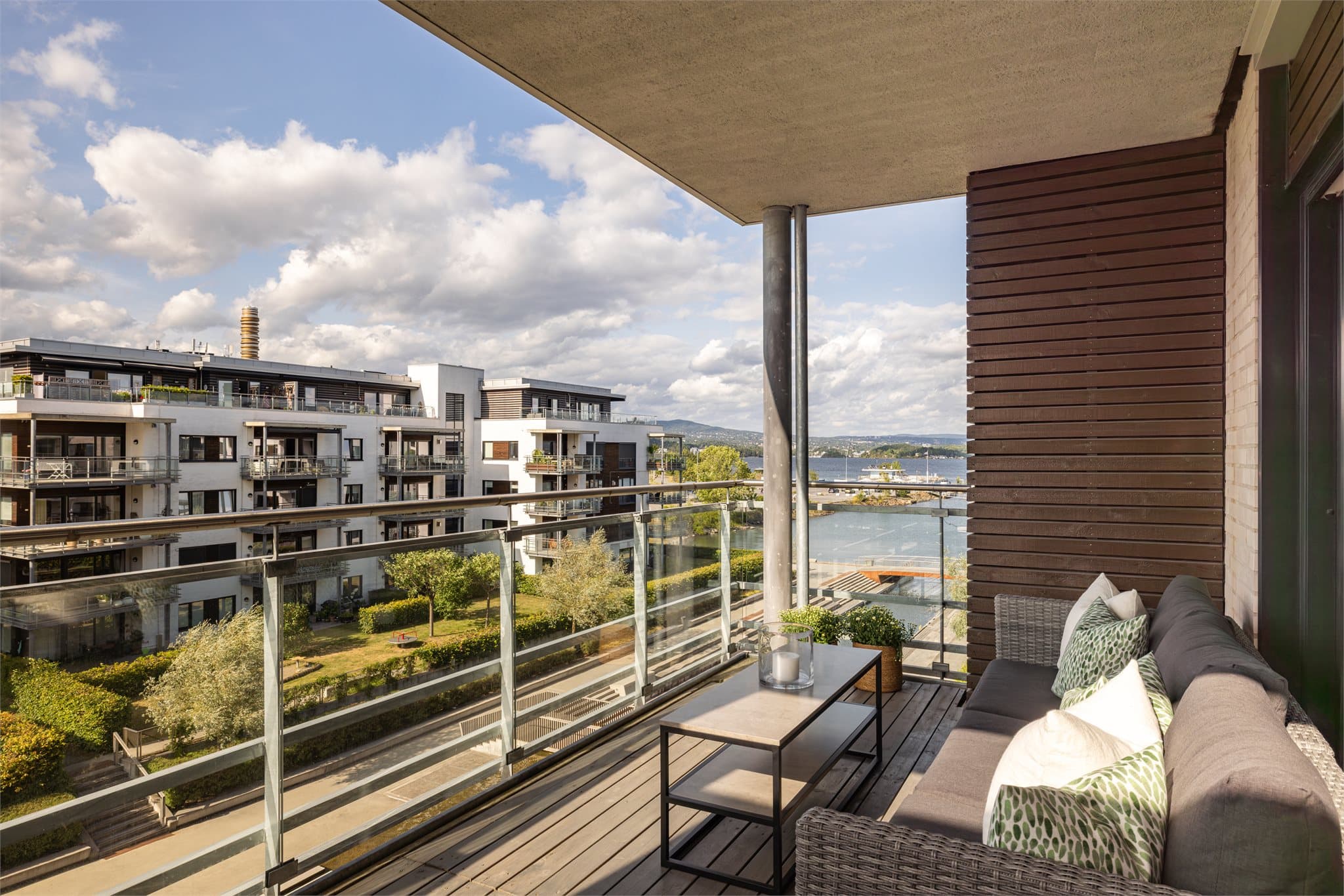Entrè: Innbydende og romslig entré med god plass til oppbevaring av sko og yttertøy. Glassdøren mot oppholdsrommet slipper inn rikelig med naturlig lys, noe som gir en åpen og luftig følelse. Den gjennomgående parketten, med unntak av våtrom, skaper en elegant og helhetlig stil i hele boligen. Stue og kjøkken: Stuen oppleves lys og romslig, og har en åpen planløsning mot kjøkken. Det er god plass til både sofagruppe, TV-møbel og spisebord. Vannbåren gulvvarme fra sentralfyring (fjernvarme) sørger for behagelig og jevn temperatur, samtidig som strømforbruket holdes nede. Store vindusflater gir rikelig med dagslys og bidrar til en innbydende atmosfære. En sjarmerende gasspeis tilfører både varme og hygge på kjølige høst- og vinterdager. Fra stuen er det utgang til en balkong. Kjøkkenet er delikat og inneholder godt med skuff- og skapplass samt fine arbeidsflater. Rommet inneholder glatt innredning og benkeplate i tre med oppvaskkum, integrert platetopp (induksjon), stekeovn, oppvaskmaskin, kjøl- og fryseskap. Videre er kjøkkenet utstyrt med ventilator over platetopp og lys under overskap. Komfyrvakt er installert. Bad: Lyst og tidløst flislagt bad med vannbåren gulvvarme samt malt innvendig himling med downlights. Baderommet er innredet med heldekkende servant på benkeseksjon med høyglans fronter fra 2023, speil m/lys, høyskap, vegghengt toalett og dusj i hjørnet bak svingbare glassvegger. Badet har også opplegg for vaskemaskin. Soverom: Leiligheten har en planløsning som inkluderer to soverom. Hovedsoverommet er romslig, med plass til dobbeltseng, nattbord på begge sider samt garderobeskap. Det andre soverommet egner seg godt som barnerom, gjesterom, kontor eller hobbyrom. Bod: Leiligheten har en praktisk innvendig bod tilknyttet entreen, ideell for oppbevaring av yttertøy, sko og diverse utstyr. I tillegg medfølger en kjellerbod som gir ekstra lagringsplass til sesongutstyr, sportsartikler eller annet man ønsker å oppbevare utenfor selve leiligheten. Balkong: Nordvestvendt balkong på 14 m² med glassrekkverk og tregulv. Balkongen har god plass til møblering etter ønske, og byr på utsikt over et pent opparbeidet fellesområde med vannspeil, beplantning og sjø.