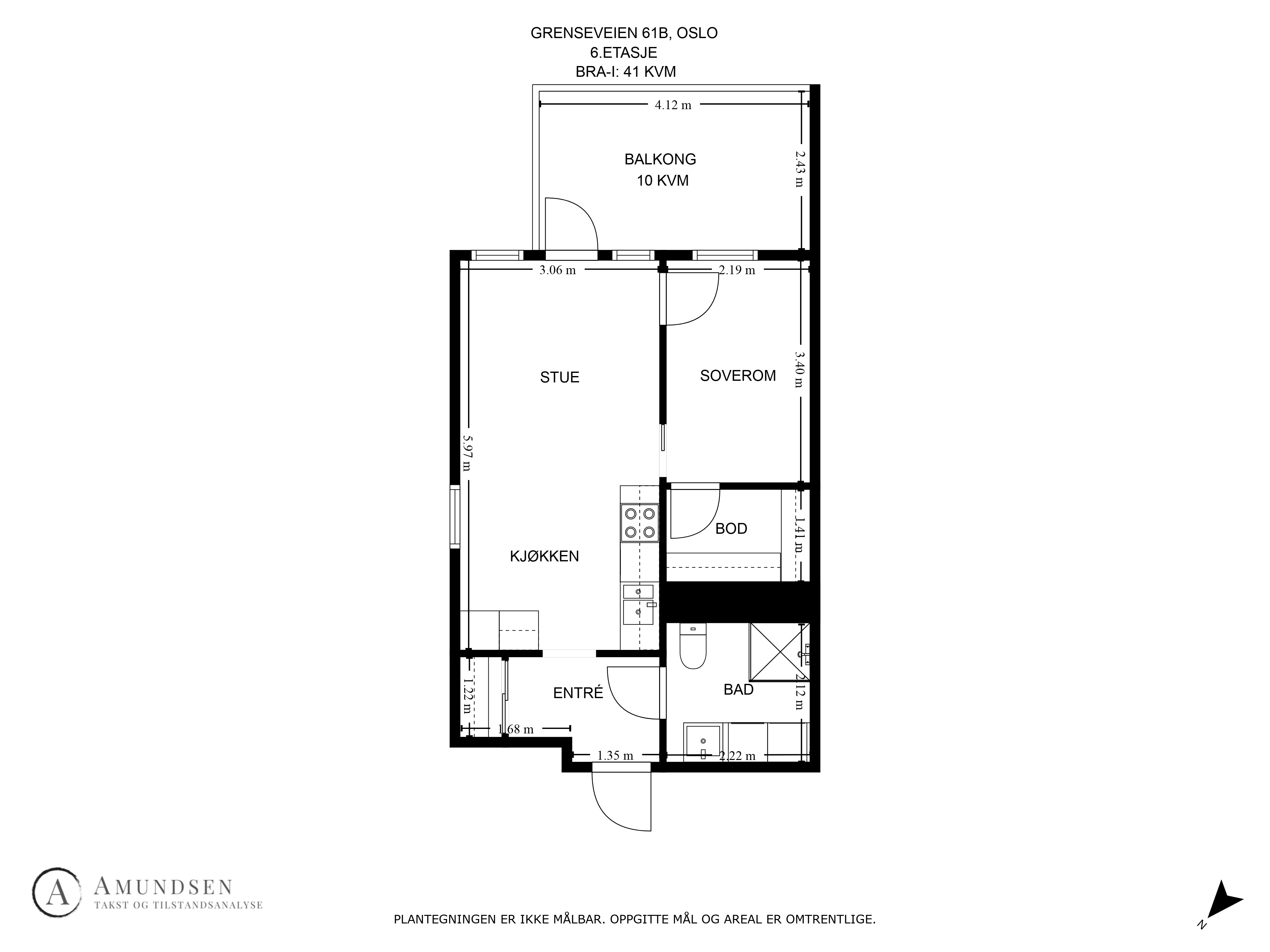 BRA-I: 41 m² Entré, Stue/kjøkken, Bad, Soverom, Bod