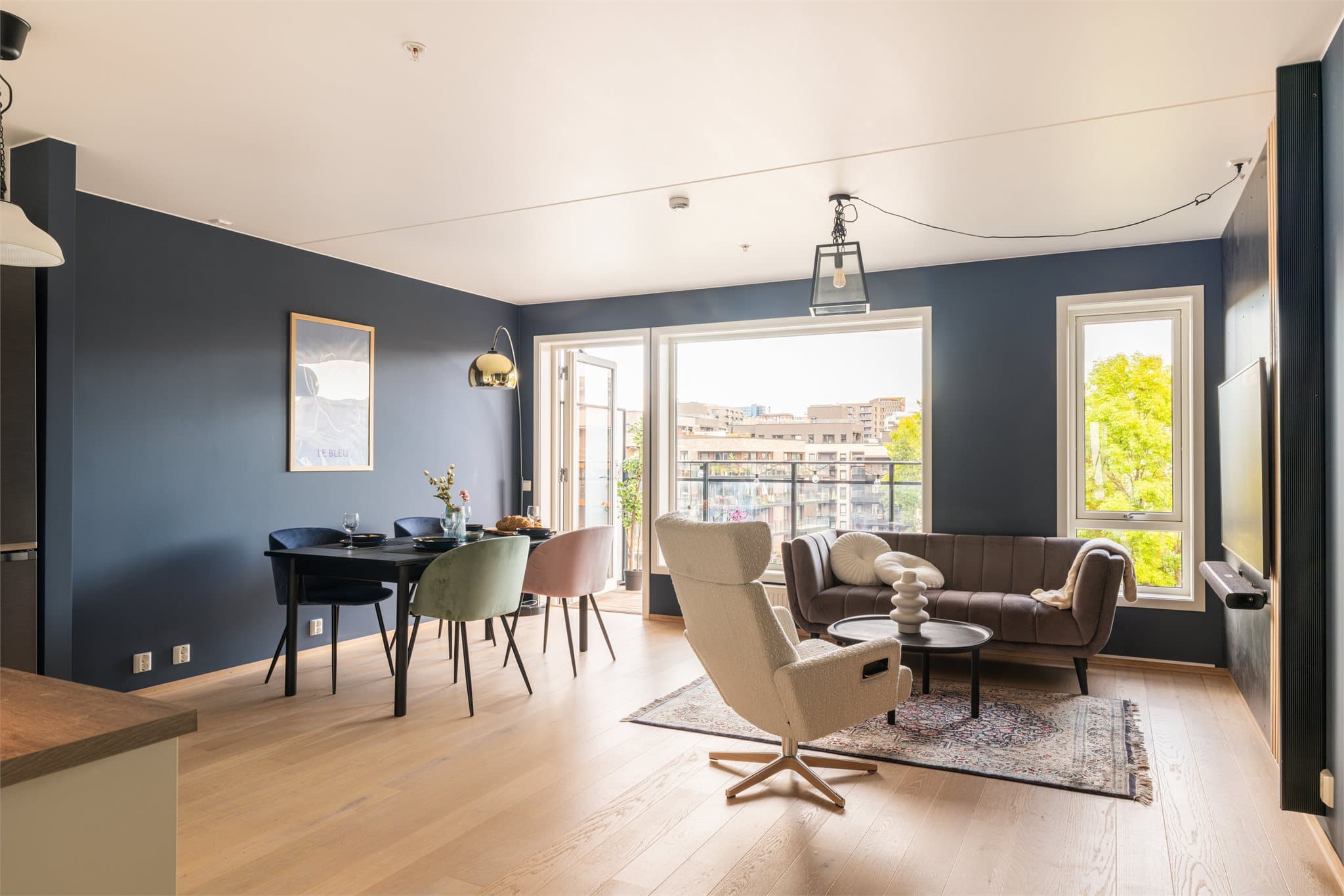 Entré Lys og praktisk entré med plass til å henge fra seg yttertøy og sette fra seg sko. Fra entréen er det direkte tilgang til en innvendig bod, noe som gir ekstra oppbevaringsmuligheter og bidrar til en ryddig hverdag. Oppholdsrommet Lys og moderne stue med kjøkken i åpen løsning. Her er det god plass til både spisebord og sofagruppe. Kjøkkenet har integrerte hvitevarer (frittstående kjøleskap) og godt med skap- og benkeplass. Store vindusflater gir rikelig med naturlig lys, og det er utgang til en solrik balkong. Baderom 1 Stort, delikat baderom med flislagte overflater og varme i gulvet. Badet er innredet med servant med skuffeinnredning, vegghengt toalett og dusjplass bak innfellbare dører i herdet glass. Badet har opplegg til både vaskemaskin og tørketrommel. Baderom 2 Lyst, flislagt baderom med varme i gulvet. Badet er innredet med servant med skuffeinnredning, vegghengt toalett og dusjplass bak dusjvegg i herdet glass. Soverom Leiligheten byr på totalt tre gode soverom. Hovedsoverommet er luftig med plass til stor dobbeltseng og utgang til en balkong. De to andre soverommene egner seg ypperlig som barnerom, gjesterom eller kontor. Alle soverommene har gode garderobeløsninger som gir mye oppbevaringsplass. Leilighetens innvendige overflater Gulvene er lagt med en lekker 1-stavs eikeparkett. Veggene består av malt mur og plater. Taket er hovedsaklig betongelenmenter, mens entréen har nedsenket tak med malte plater. Balkong Leiligheten byr på to romslige balkonger, en på hver side av leiligheten. Det er god plass til utemøbler på begge balkongene, samt mulighet for grill så lenge den er elektrisk eller drevet av gass. Pent utsyn mot hyggelige fellesområdet og et trivelig nabolag. Tilstandsrapporten for boligen er vedlagt salgsoppgaven. For mer detaljert informasjon om tilstandsgradene, vennligst se rapporten.