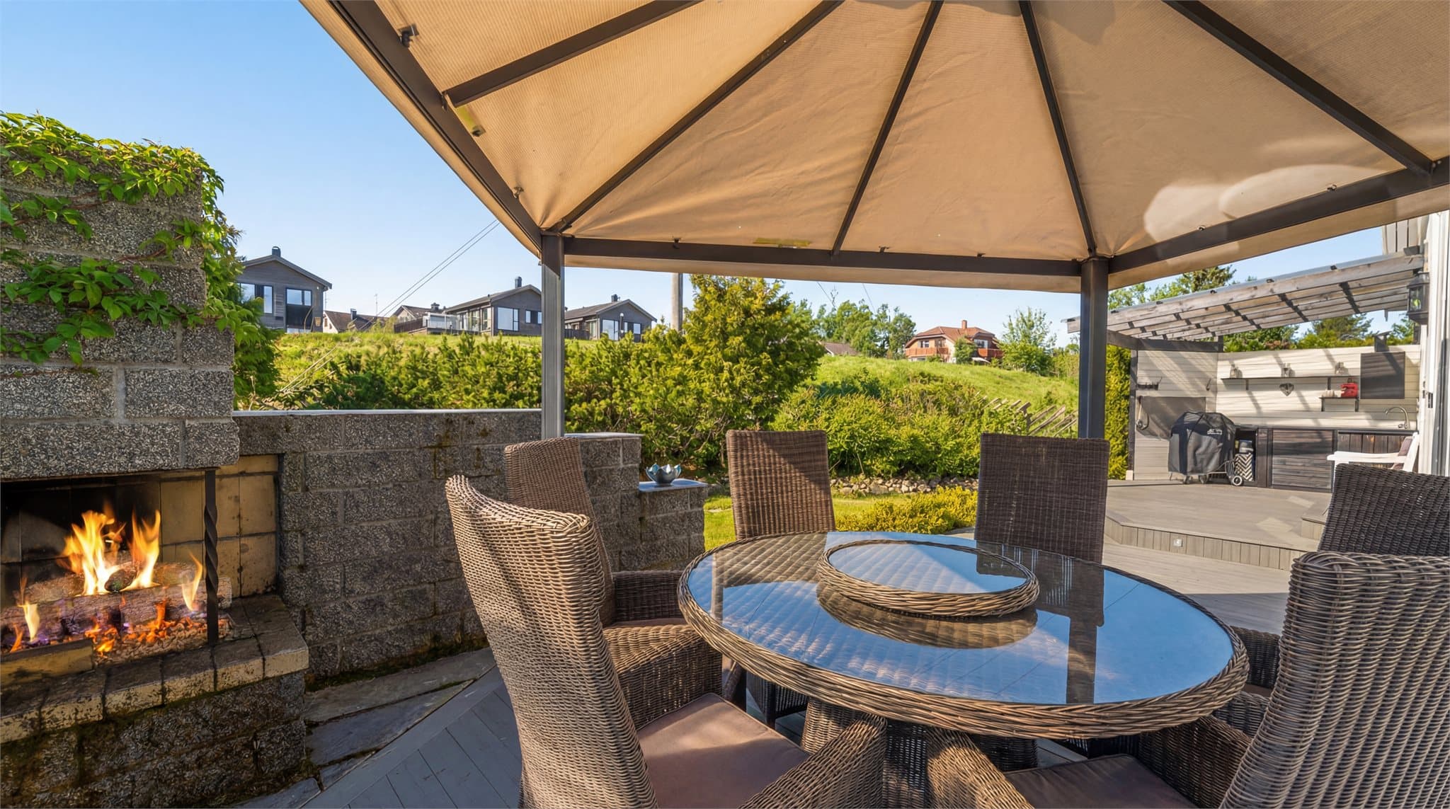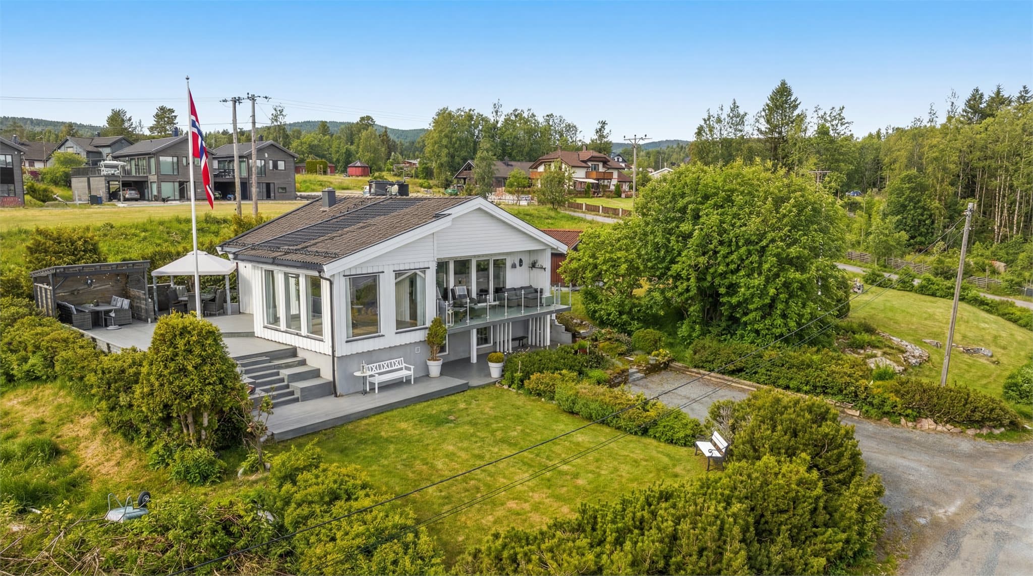Tomten er pent skjermet med prydbusker. Gårdsplassen er opparbeidet med grus og støttemur. Svært gode parkeringsmuligheter. Hagen har rikelig med plass til rekreasjon for store og små. Den er dessuten nydelig beplantet i koselige miljøer med både diverse beplantning og steinkanter. Her kan man nyte fine dager i fred og ro, svært godt skjermet. Fra stue/spisestue er det adkomst til en herlig østvendt balkong, med fantastisk utsikt mot Hurdalssjøen. Det er også adkomst til en romslig, sydvendt markterrasse som slynger seg rundt bolig mot vest. Terrassen fungerer ypperlig som en forlengelse av stuen i sommerhalvåret. Her er det utekjøkken, pergola og godt lagt til rette for møblering i ulike soner. Ellers er det en steinbelagt frokostplass mot syd. Uteplasser langs tre husvegger sørger for optimale solforhold året rundt.