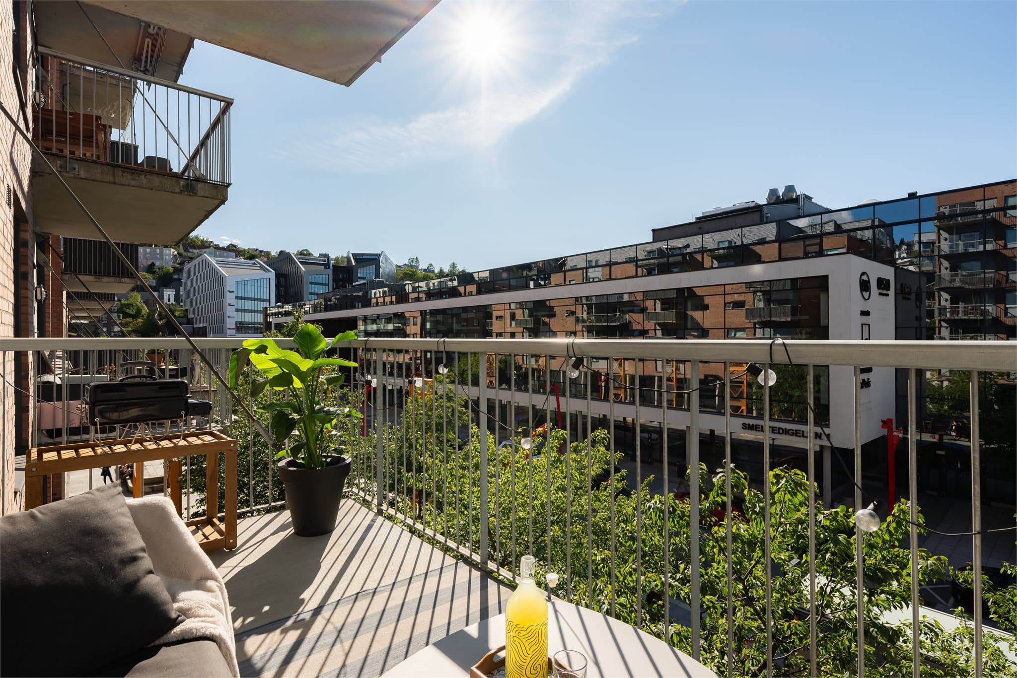 Beliggenhet Leiligheten ligger i et attraktivt og sentralt boligområde i Kværnerbyen, Oslo. Bydelen er utviklet på den tidligere Kværner Brug-tomten, og har en ideell beliggenhet med kort vei til både Gamlebyen, Bjørvika og Oslos nye finansdistrikt. Området er i stadig utvikling, og de neste årene vil det komme nye bulevarder, butikker og restauranter. Innen få minutters gange finner du blant annet Ladegården Café med italiensk steinovnsbakt pizza og hyggelig uteservering. Det er gangavstand til Bjørvika og Sørenga med et bredt utvalg av restauranter som Vaaghals, Nodee Barcode og Nodee Sky, samt treningssenter, kafeer og butikker. På Sørenga kan du om sommeren nyte både strandliv og restauranter langs bryggen. Tøyen torg og Grønland, kjent for sitt livlige miljø, spennende serveringssteder og unike butikker, nås også til fots. Kværnerbyen byr på treningssenter, idrettshall og nærhet til Jordal sportspark med fotballbane, skøytehall, skatepark og andre fasiliteter. Området er pent opparbeidet med grøntarealer, vannspeil og hyggelige møteplasser. I gangavstand finner du flere populære rekreasjonsområder som Ekebergparken, Klosterenga kulturpark, Middelalderparken og Tøyenparken med Tøyenbadet og Botanisk hage. Langs Alnaelva kan man gå inn i Svartdalen og Svartdalsskogen – Oslos siste urskog – som byr på flotte turstier og fine joggemuligheter. Gjennom Kværnerbyen renner også en liten kanal med dam, som om vinteren kan brukes til skøyter, og om sommeren som et naturlig samlingspunkt. Servicetilbud I Kværnerbyen finner du dagligvarebutikker som Kiwi, Coop Extra og kort vei til Rema 1000 på Vålerenga. Her ligger også treningssenteret Fitnessroom, apotek, frisør, neglesalong og renseri. Post i butikk finnes på Coop Prix i St. Halvards gate. Restaurant Kraft har etablert seg som en hyggelig nabolagsrestaurant, mens Åpent Bakeri og Kruttverket – et levende område med badstue, kafe, pub og kreative verksteder – bidrar til et sosialt nabolagsmiljø. I tillegg ligger Smia Galleri, en skjult perle med gourmetmat, like ved Vålerengaparken. For et større servicetilbud er det kort vei til Bjørvika/Barcode, Oslo City, Byporten, Aker Brygge og Grønland Basar, som alle byr på et bredt utvalg av butikker, restauranter, barer og kafeer. Offentlig kommunikasjon Området har gode kollektivforbindelser. Fra Kværnerbyen går buss 54, som bruker ca. 6 minutter til Bjørvika og også kjører som nattbuss i helgene. Fra Konows gate går bussene 34, 70 og 74, med enkel adkomst via "Kværnertrappa". Fra Galgeberg går buss 20 og 37, og fra St. Halvards plass trikk 18 og 19. Galgeberg har døgnåpen bussrute, og nattbusser stopper også ved Kværner. I tillegg finnes både bysykkel- og elsykkelstativ, samt tilgang til elsparkesykler, noe som gjør det enkelt å komme seg raskt rundt i byen. Med bil tar det ca.: 1 min til E6 og E18 3 min til Gamlebyen 4 min til Oslo S 8 min til Grünerløkka 8 min til Majorstuen 31 min til Oslo Lufthavn
