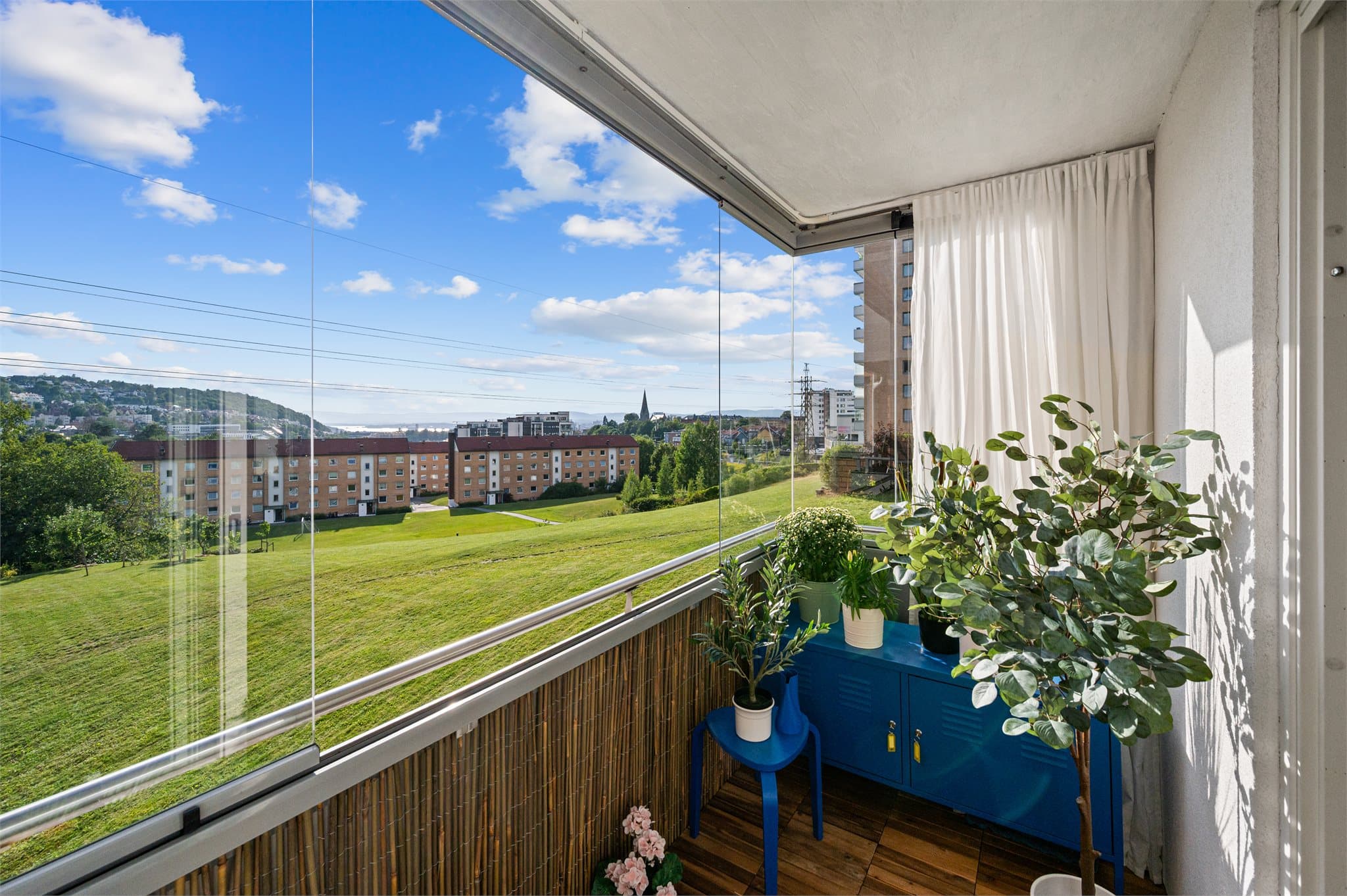 I attraktive omgivelser presenteres denne moderne og innholdsrike leiligheten, som kombinerer smarte løsninger med en varm og gjennomført stil. Boligen har en svært god planløsning, med lyse og luftige oppholdsrom, god lagringsplass og smakfulle materialvalg gjennomgående. Her får du blant annet et romslig og lyst oppholdsrom med utgang til sydvestvendt innglasset balkong, to gode soverom, et praktisk kjøkken med integrerte hvitevarer, samt et pent og funksjonelt baderom med opplegg for vaskemaskin og tørketrommel. Én-stavs parkett og nøytrale overflater skaper en helhetlig og behagelig atmosfære. Beliggenheten gir gode solforhold fra tidlig vår til sen høst, og leiligheten vender mot rolige og grønne omgivelser. Her bor du komfortabelt, med alle nødvendige fasiliteter innen kort avstand. Entré: Entréen ønsker velkommen med lyse flater og én-stavs parkett som går igjen i resten av boligen og skaper en helhetlig og moderne atmosfære. Rommet er innredet med en lang veggseksjon bestående av praktiske, plassbygde skoskap som gir rikelig med oppbevaringsplass uten å oppta unødvendig gulvareal. Flere knagger og speil på vegg gir både funksjonalitet og romfølelse, og det er godt med plass til å henge fra seg yttertøy. Entréen fremstår som ryddig, effektivt utnyttet og godt tilpasset en aktiv hverdag. Stue: Stuen er romslig og innbydende med god plass til både sofagruppe og spisebord. Store vindusflater gir rikelig med naturlig lys og bidrar til en åpen og luftig atmosfære. Gulvet er belagt med elegant én-stavs parkett som gir et eksklusivt og helhetlig uttrykk, mens veggflatene er malt i lyse, nøytrale toner som enkelt lar seg kombinere med ulike interiørstiler. Leiligheten har svært gode solforhold med morgensol fra øst og kveldssol fra vest i perioden februar til november. Alle vinduer er utstyrt med rullegardiner som gir både skjerming og komfort. Fra stuen er det direkte utgang til en sydvestvendt innglasset balkong på ca. 5 kvm. Balkongen har gulv i akasieplater og fungerer som et lunt og skjermet uterom, perfekt for avslapning store deler av året. En gjennomført og behagelig stue som fungerer som boligens naturlige samlingspunkt. Kjøkken: Kjøkkenet er funksjonelt og velholdt, med innredning fra 2017. Det har hvite, glatte skapfronter som gir et tidløst og moderne uttrykk, og benkeplater i heltre eik som tilfører varme og karakter til rommet. Mellom benk og overskap er det montert praktiske plater som forenkler rengjøring og beskytter veggen. Kjøkkenet er utstyrt med nedfelt rustfri oppvaskkum og ettgreps armatur. Integrerte hvitevarer som stekeovn med keramisk topp og oppvaskmaskin sørger for en sømløs helhet. Ventilasjon ivaretas av kullfilterventilator samt ventil i både yttervegg og vegg til felles ventilasjonskanal. En effektiv og stilren kjøkkenløsning som egner seg godt for både daglig bruk og sosiale sammenkomster. Kroken ved kjøkkenet har en smart skyvedørsløsning som gir fleksibel bruk som spisestue, kontor eller gjesterom. Baderom: Baderommet fremstår som moderne og praktisk, med flislagte vegger og malte himlingsplater. I himlingen er det montert downlights som gir god og jevn belysning. Gulvet er belagt med 20x20 cm fliser og har fall mot sluk i dusjsonen. Dusj på gulv med dusjforheng gir fleksibel bruk og enkel tilgang. Rommet er innredet med servant med skuffeinnredning som gir godt med oppbevaringsplass, og vegghengt toalett med innebygget sisterne for en ren og strømlinjeformet utførelse. Det er opplegg for både vaskemaskin og tørketrommel, som gjør baderommet svært funksjonelt for daglig bruk. Naturlig ventilering ivaretas via ventil i yttervegg. Et gjennomført og brukervennlig bad med moderne standard og praktiske løsninger. Soverom: Leiligheten har to gode soverom, begge med pene overflater, én-stavs parkett og nøytrale fargevalg som gir et moderne og rolig uttrykk. Rommene har gode vindusflater som gir flott dagslys og utsyn mot grønne omgivelser. Hovedsoverommet er innredet med en stor, plassbygd garderobeløsning med slette fronter og stilrene lærhåndtak, som gir rikelig med oppbevaringsplass. Rommet har også plass til både dobbeltseng og hjemmekontor eller lesekrok. Det andre soverommet er fleksibelt innredet og egner seg godt som barnerom, gjesterom eller kontor. Her er det smart lagringsplass, praktiske løsninger og godt med gulvareal for lek eller arbeid. Begge rom fremstår som lyse, lune og funksjonelle, med muligheter for å tilpasses ulike behov.
