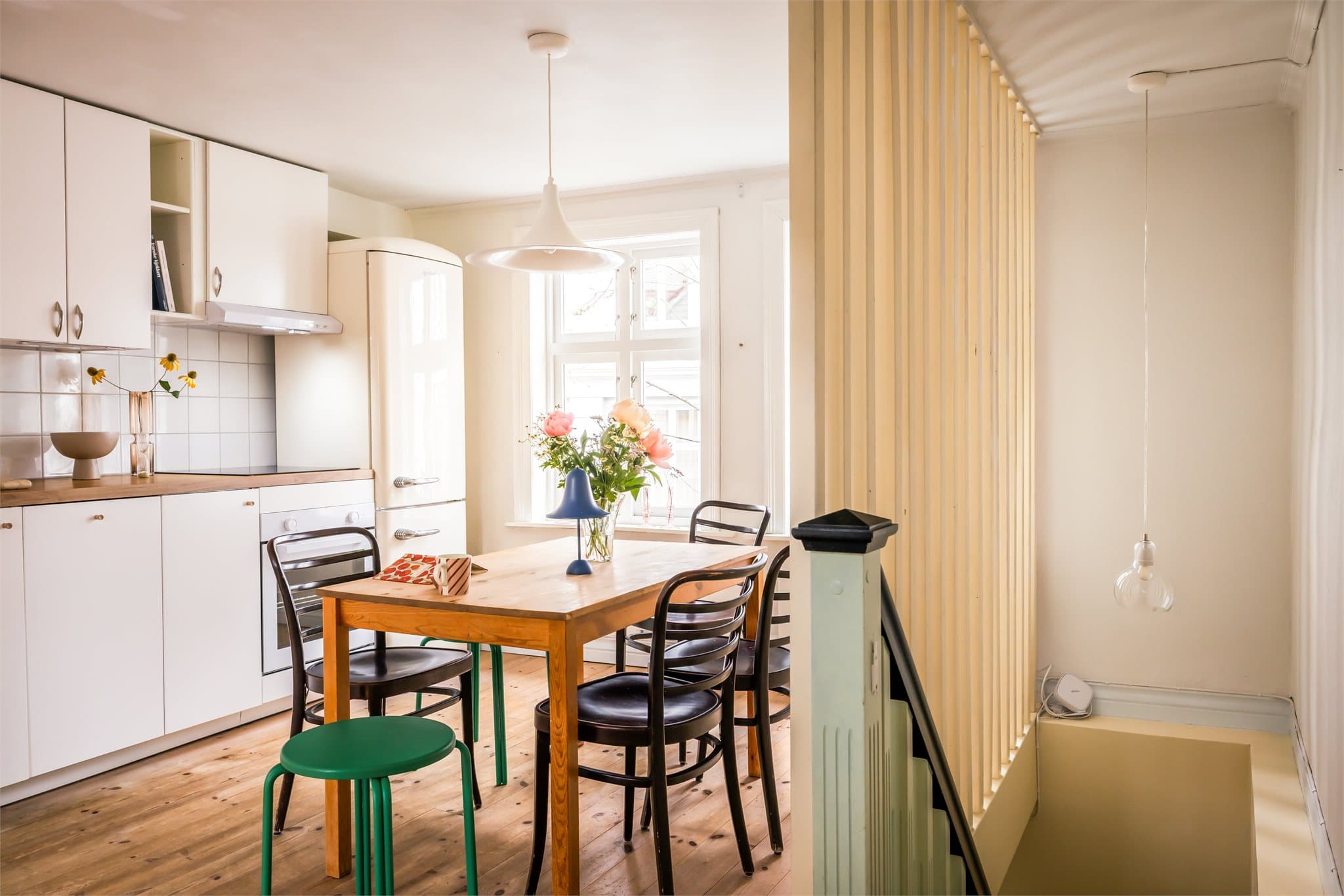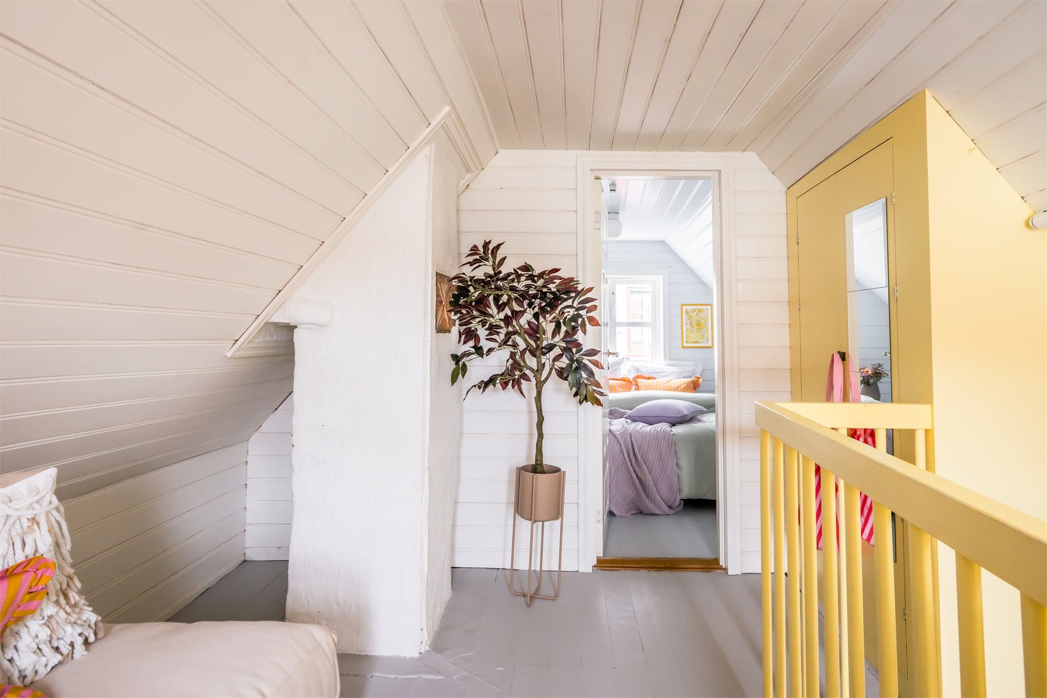 Et nydelig, forsegjort bergenshus med sjarm, sjel og flotte lysforhold. Dagens eier har lagt ned et betydelig arbeid i å modernisere og oppgradere bygningsmassen, samtidig som de har vært opptatt av å bevare husets karekteristika og særtrekk. Resultatet må sies å være svært vellykket! Dette er et hus som skiller seg fra mange andre boliger, med farger, lys og sjarmerende løsninger, samtidig som dagens krav til standard og komfort er ivaretatt. Før Stine Robin og Christian, dagens eiere, kjøpte huset, var det i mange år brukt bare som vevstue, uten at noen bodde fast i huset, og innredningen var ganske spartansk. Nå er huset på alle måter tilpasset og oppgradert til. imøtekomme de fleste behov, både barnefamilier, unge par eller voksne, som ønsker en sjelfull bolig, midt i byen! Fra det nydelige, brosteinslagte gatetunet utenfor, kommer du inn i en romslig entré i hovedetasje, hvor det også er adkomst til praktisk gjestetoalett, innredet med toalett og servant. Hele planet er åpnet opp, for å dra best mulig nytte av de fine lysforholdene, fra vinduene på både for- og bakside. Gulvene er heltregulv, hvor noe er malt, mens andre er ubehandlet. Rustikt og fint! Kjøkkenet er blitt flyttet ut i det store rommet (det var tidligere plassert under trappen), mens det er laget til god plass til sittegruppe. TV-krok i delen av stuen mot vest. Det er også montert ny peisinnsats, perfekt for kalde høst- og vinterdager! Kjøkkenet er innredet med tidløs, klassisk, hvit innredning, har god skap- og benkeplass og intergret stekeovn/koketopp, oppvaskmaskin og avtrekk. Frittstående kjøleskap. Her er det god plass til både venner og familie riundt spisebordet! Fra spisestuen går det nå trapp ned til soverom, bad og bodrom i underetasje. Tidligere var trappen plassert midt i rommet, men dette er utvilsomt en bedre løsning, for å utnytte kvadratmeterne til det fulleste. I underetasje er det et romslig soverom, med god garderobeplass og lagringsplass under trappen. Det er malte skiferheller på gulv med varmekabler. Videre adkomst til nytt bad, fullt utstyrt med dusj, baderomsinnredning og toalett, utført av fagfolk. Badet er meget pent innredet, med fliser på gulv og vegg, varmekabler, og fint, naturlig lys fra vindu mot gatetunet. I kjeller er det også egen inngang, og stort, praktisk bodrom/yttergang - perfekt til yttertøy, sykler, barnevogner og mye, mye mer. Den sjarmerende trappen fra hovedetasjen tar deg opp til loftet, hvor det er innredet to soverom. Hovedsoverommet ligger innerst, vendt mot Sydneskleiven, og har god plass til stor seng og annen innredning. Skråveggene er smart utnytt til lagringsplass. Soverommet på toppen av trappen kan fungere både som et soverom, eller som en liten loftsstue, alt etter behov! Her er det også laget smarte oppbevaringsløsninger i knevegger. Totalt sett er dette et svært sjarmende bergenshus, som det utvilsomt vil være en glede å bo i!
