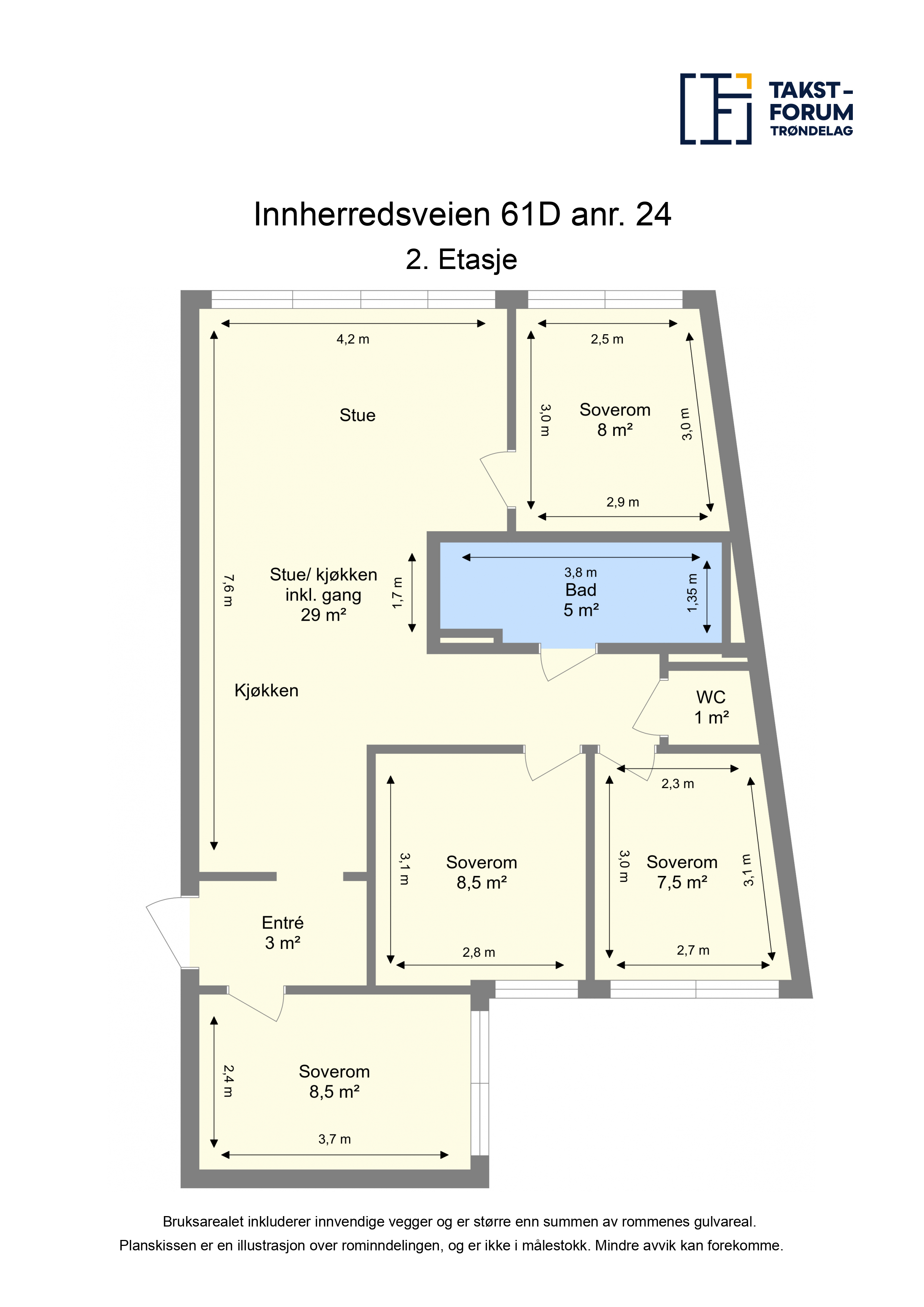 BRA-I: 76 m² Entré, 4 soverom, bad og stue/ kjøkken.