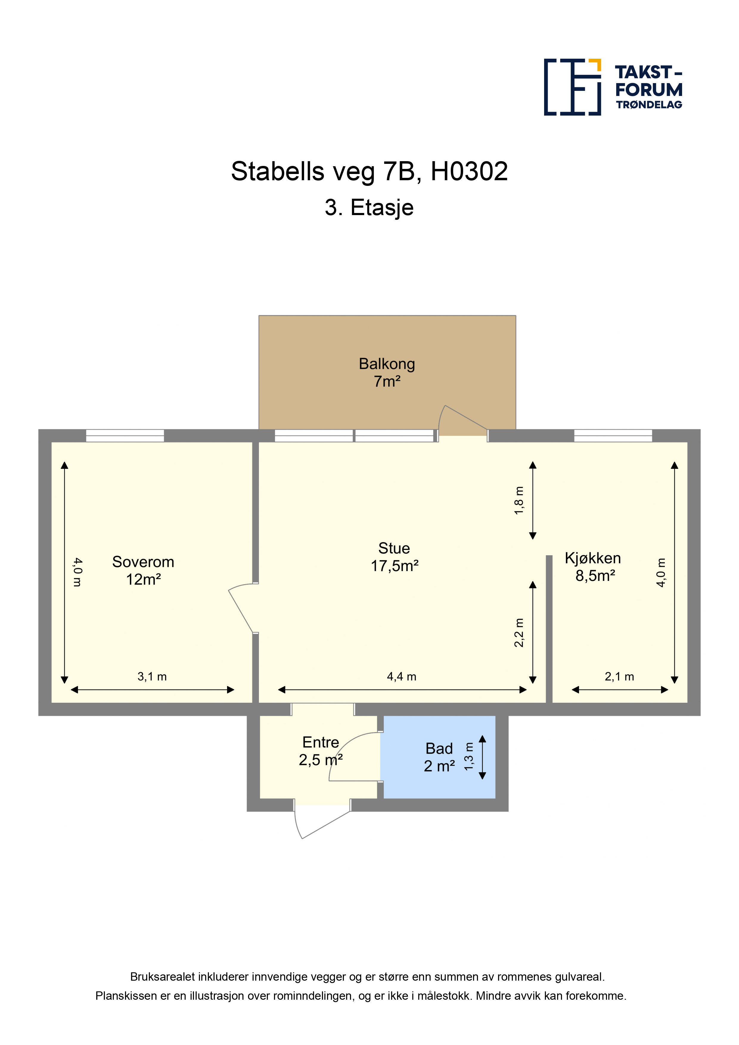 Leiligheten ligger i 3. etasje og består av følgende rom: Entré, bad, soverom, stue og kjøkken. Balkong på 7 m². Leiligheten disponerer to boder i kjeller på totalt 5 m² og én bod på loft på ca. 6 kvm gulvareal (skråtak).