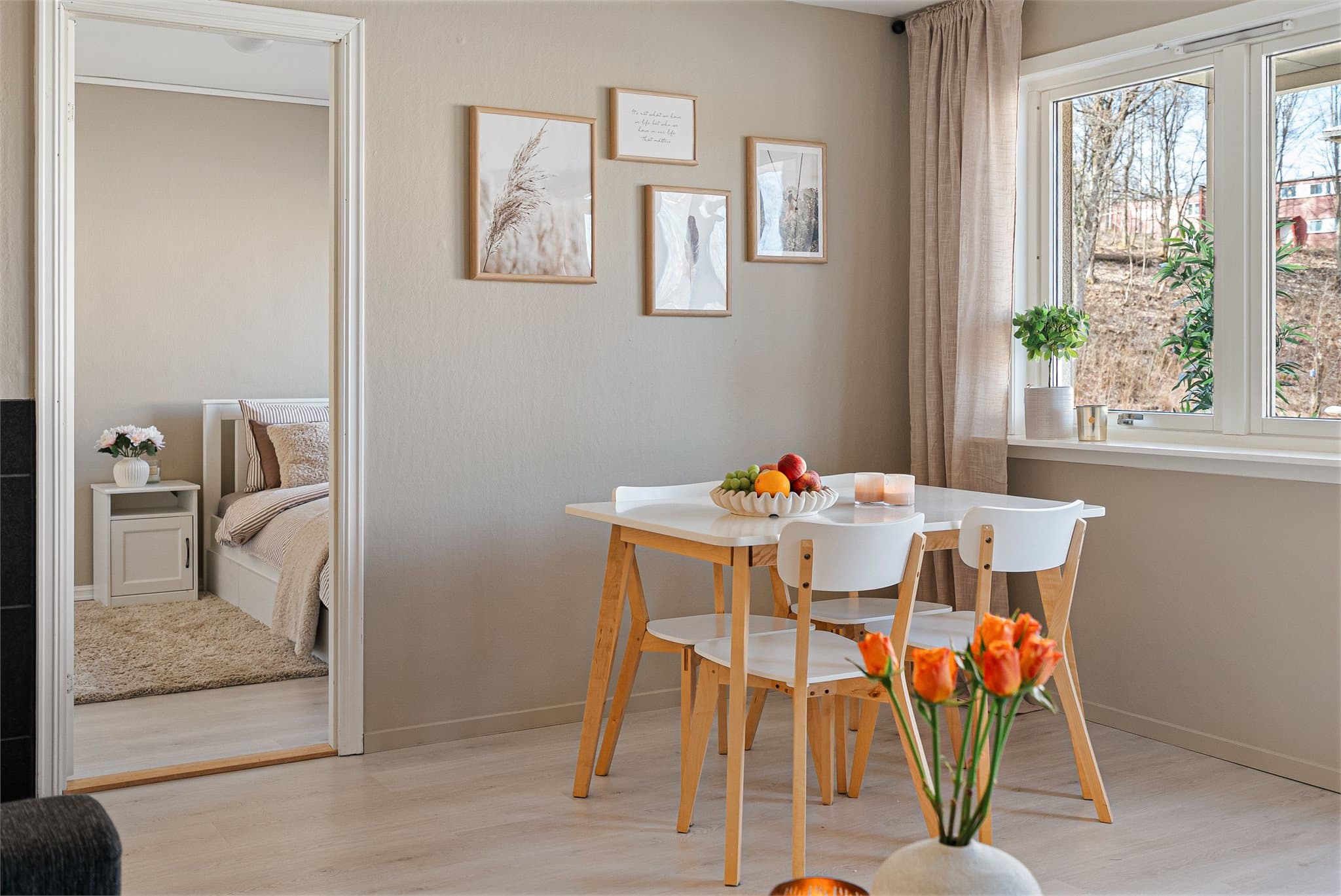 Velkommen hjem! Entré Leiligheten ønsker deg velkommen med en praktisk entré med god plass til oppbevaring av yttertøy og sko. Entréen gir et ryddig førsteinntrykk og leder videre inn i leilighetens oppholdsrom. Stue Lys og hyggelig stue med store vindusflater som sørger for rikelig med naturlig lysinnslipp. Stuen har god plass til både sofagruppe og spiseplass, og det er peisovn som varmer godt på kaldere dager. Kjøkken og stue ligger i delvis åpen løsning og utgjør totalt ca. 26 kvm, noe som gir en god og luftig romfølelse. Fra stuen er det utgang til en herlig vestvendt balkong på ca. 7 kvm. Balkongen er overbygd og har gode solforhold, samt god plass til utemøbler. Her ligger forholdene godt til rette for å nyte fine sommerkvelder. Fra balkongen har man utsikt mot borettslagets fellesarealer med plen og lekeplass. Kjøkken Lyst og tidløst kjøkken med hvite fronter og benkeplate i tre som gir et varmt og innbydende uttrykk. Kjøkkenet byr på god skap-, skuff- og benkeplass, og gir en praktisk og funksjonell arbeidsflate i hverdagen. Soverom Stort og romslig soverom på ca. 12 kvm med god plass til dobbeltseng og garderobeløsning. Rommet er malt i lune og behagelige farger, og fremstår som lunt og innbydende med gode møbleringsmuligheter. Bad Flislagt baderom utstyrt med servantinnredning, toalett og dusjhjørne. Badet har varme i gulv og fremstår lyst og tidløst. Bod og parkering Leiligheten disponerer to boder i kjeller samt én bod på loft, noe som gir gode oppbevaringsmuligheter.