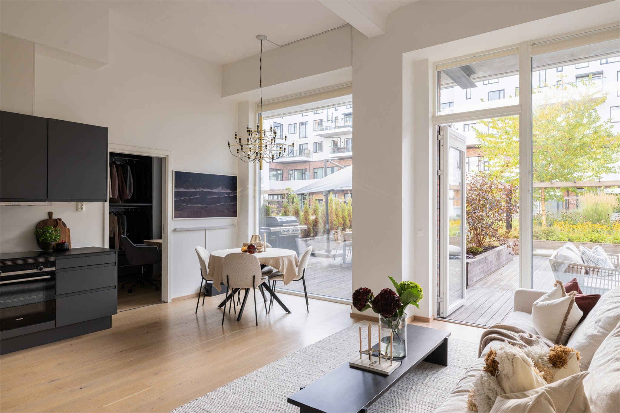 Entré: Lys og romslig entré med flislagt gulv og god takhøyde på ca. 3,0 m. Oppgradert garderobeløsning fra 2024 gir rikelig oppbevaring. Gulvet har vannbåren gulvvarme, noe som er gjennomgående for hele leiligheten. Stue / kjøkken: Åpen og luftig stue/kjøkkenløsning med ca. 3,7 m takhøyde og store vinduer med spesialtilpasset solskjerming fra 2024. Leiligheten har et moderne Sigdal kjøkken med glatte fronter, laminat benkeplate og underlimt vask. Integrerte hvitevarer som medfølger er induksjonstopp, stekeovn, oppvaskmaskin og kjøl/fryseskap. Gulvet er lagt med 1-stavs parkett, noe som er gjennomgående for alle oppholdsrom. Oppholdsrommet leder ut til en stor markterrasse, noe som vil være en naturlig forlengelse av leiligheten under sommermånedene. Markterrasse: Fantastisk, solrik og sydøstvendt markterrasse på ca. 73 kvm vendt mot lukket atrium. Terrassen er bygget i trekonstruksjon med integrerte blomsterkasser som rammer inn sonene. Uteplassen er delvis takoverbygget. Soverom: Leiligheten har to soverom. Hovedsoverommet er lyst og innbydende med malt veggfarge fra 2024, spesialtilpassede gardiner og ny garderobeløsning med god lagringsplass. Her er det plass til dobbeltseng, ønsket nattbordsløsning og tv-møblement. Det minste soverommet er per i dag innredet som kontor med plassbygget garderobeløsning. Rommet egner seg også som bl.a. barnerom eller gjesterom. Bod: Fra det minste soverommet er til tilgang til en praktas innvendig bod. Bad: Lekkert og romslig bad med flislagte vegger og gulv, downlights og vannbåren gulvvarme. Vegghengt toalett, moderne servant med innredning, speil med lys, dusjhjørne med glassdører og opplegg for vaskemaskin.