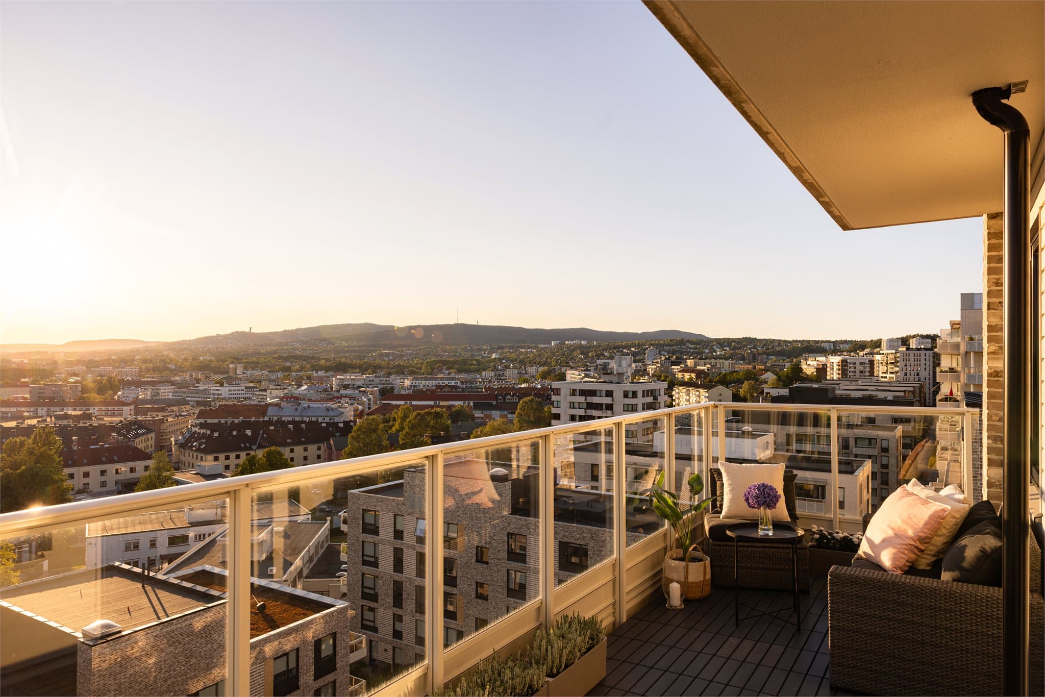 Rålekker 2-roms toppleilighet | 10. etasje | FANTASTISK utsikt over hele byen | Solrik balkong på hele ca. 13 kvm