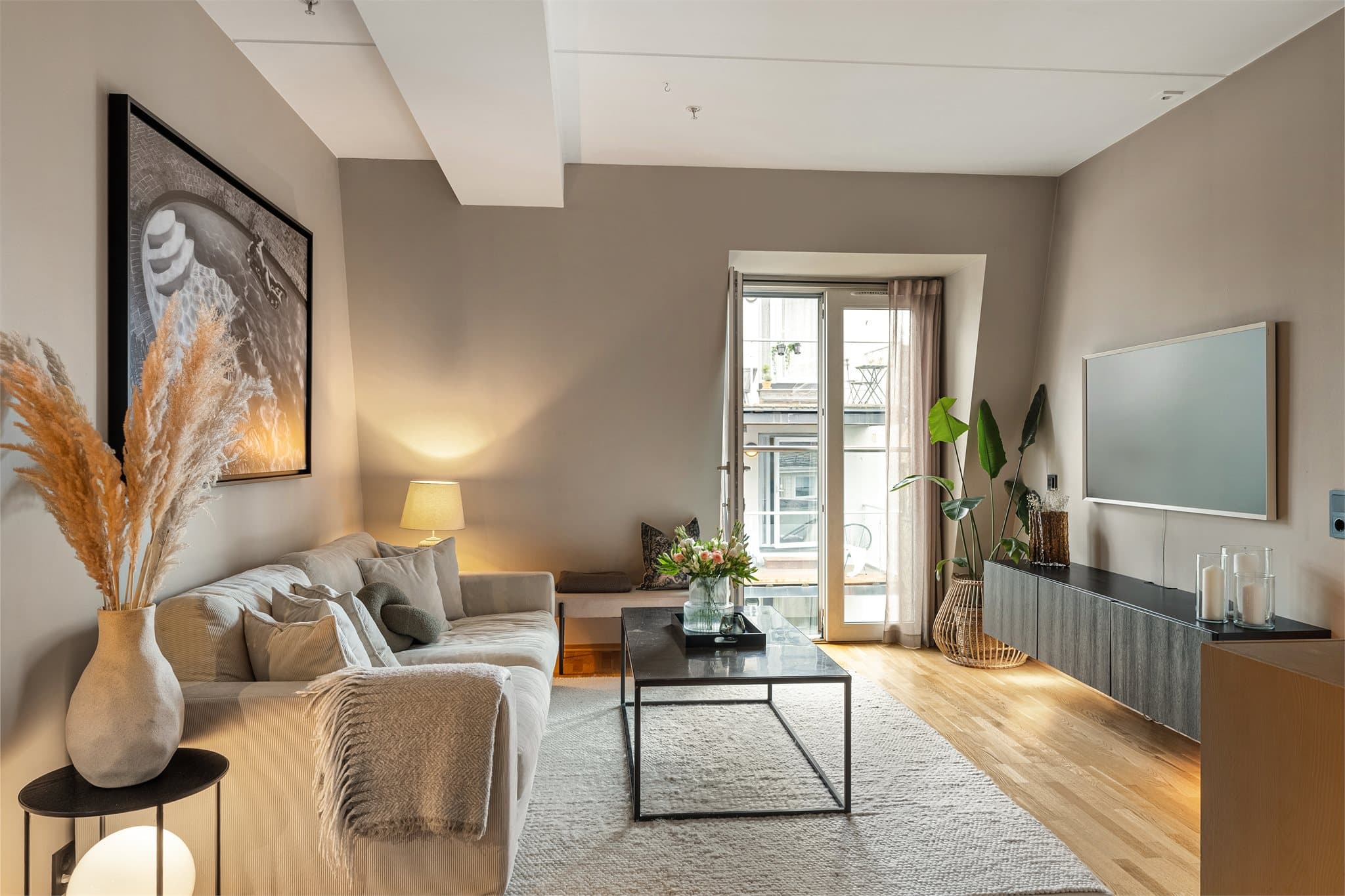 Leilighet beliggende i 5. etasje i et moderne bygg fra 2012 med heis. Boligen har en arealeffektiv planløsning med to soverom, hvorav ett disponerer egen walk-in-garderobe. Videre byr leiligheten på et lyst, flislagt bad samt en åpen stue- og kjøkkenløsning som skaper gode oppholdsrom. Fra stuen er det fransk balkong. Takhøyden er målt til 2,65 i stuen. Bygget har også en romslig, felles takterrasse med gode solforhold og fin utsikt. Det er behagelig gulvvarme i alle rom, med unntak av walk-in-garderobe (bod). Entré: Innbydende entré med en lys og luftig løsning, og oppbevaringsmuligheter for sko og yttertøy. Entréen leder naturlig videre inn mot kjøkken og oppholdsrom. Dekorativ spilevegg tilfører rommet karakter og bidrar samtidig til forbedret akustikk. Kjøkken/Stue: HTH Kjøkkenet fra 2022 fremstår som moderne og funksjonelt utformet, med en praktisk kjøkkenøy som gir både ekstra oppbevaringsplass, gode arbeidsflater og en naturlig spiseplass. Kjøkkenøyen med sitteplasser bidrar samtidig til en naturlig avgrensning mot entré og stue. Innredningen har et stilrent uttrykk med slette, lyse fronter kombinert med overskap i varm trestruktur, som skaper en lun og gjennomført helhet. Det er integrerte hvitevarer samt rikelig med skap- og benkeplass. Den lyse benkeplaten videreføres sømløst i en matchende bakvegg, som understreker det gjennomførte designet. Kjøkkenet har en stilren benkeplate i lys kompositt som sømløst videreføres i matchende bakvegg. Den gjennomgående materialbruken gir et eksklusivt og rolig preg, samtidig som den spraglete strukturen tilfører liv og dybde. Benk og vegg fremstår som en helhetlig flate uten visuelle brudd, noe som understreker det moderne og gjennomførte designet. Stuen ligger i åpen løsning med kjøkkenet og oppleves som lys og innbydende, med god plass til både sofagruppe og TV-seksjon. Parkettgulv og malte, slette vegger danner et tidløst og nøytralt utgangspunkt for møblering. Store, doble dører leder til en fransk balkong slipper inn rikelig med dagslys og gir gode luftemuligheter, noe som ytterligere forsterker romfølelsen. Soverom: Boligen byr på to gode soverom. Hovedsoverommet har plass til dobbeltseng med tilhørende nattbord på begge sider. Tilstøtende walk-in-garderobe gir rikelig med oppbevaringsplass, og er innredet med et fleksibelt hyllesystem som utnytter arealet godt uten å beslaglegge gulvplass i selve soverommet. Det andre soverommet fremstår som et allsidig rom, velegnet som barnerom, gjesterom eller hjemmekontor. Her er det plass til seng samt en praktisk arbeidsplass ved vinduet. Bad: Badet fremstår som moderne og helhetlig, med flislagte gulv og vegger samt komfortable varmekabler i gulvet. Rommet er utstyrt med vegghengt toalett, dusjhjørne med innfellbare glassdører og servant med tilhørende underskap som gir gode oppbevaringsmuligheter. Det er opplegg for vaskemaskin. Downlights i himling sørger for et behagelig og funksjonelt lys. Felles takterrasse: Bygget har en stor, felles takterrasse med gode solforhold og utsikt over byen og nærområdet. Terrassen vil bli møblert med nye møbler fra juni 2026 og er et flott sted for sosiale sammenkomster eller for å nyte rolige dager utendørs. Overflater: Gulv: Parkett i alle oppholdsrom og intern bod. Fliser på bad. Vegger: Sparklede/pussede og malte overflater. Fliser på bad. Himling: Sparklede/pussede og malte overflater. Lagring: Leiligheten disponerer en intern bod, samt en ekstern kjellerbod på ca. 4 m² merket med nummer 502. For fullstendig teknisk informasjon om boligen, se punktet Byggemåte i salgsoppgaven.