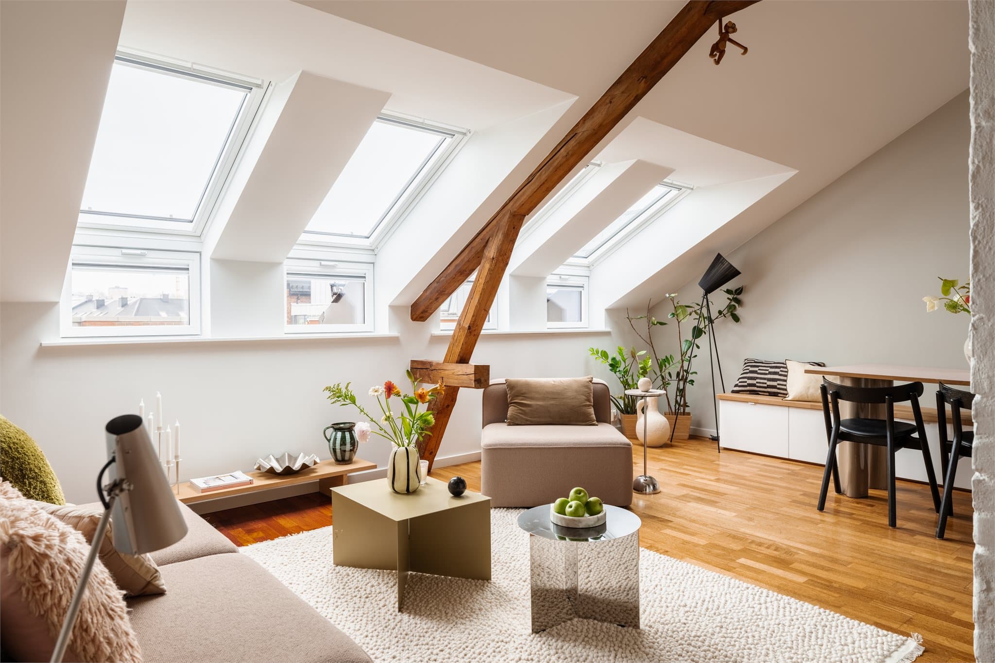 Entré - velkommen hjem! Innbydende entré med en ryddig og oversiktlig utforming. Det er plass til oppbevaring av yttertøy og sko, og området har en naturlig sone for sittebenk eller garderobeløsning. Stue med kjøkken i åpen løsning Et særegent og luftig oppholdsrom med skråtak, store takvinduer og synlige takbjelker som gir boligen karakter og en spennende romfølelse. De mange vindusflatene slipper inn rikelig med dagslys og understreker den åpne atmosfæren. Rommet kan enkelt innredes med en tydelig stuesone med sofa og sittegruppe, mens kjøkkenet ligger i delvis åpen løsning. Spisebordet fungerer som et naturlig skille mellom sonene og skaper en god flyt i rommet. Kjøkkenet har glatte, moderne fronter kombinert med benkeplater i eik og nedfelt oppvaskkum. Det er integrerte hvitevarer som oppvaskmaskin, stekeovn, induksjonstopp og kjøl-/fryseskap. Ventilator er tilkoblet boligens ventilasjonsanlegg, og både waterguard og komfyrvakt er montert. Bad med vindu Flislagt baderom med elektrisk gulvvarme og downlights i himling som gir behagelig belysning. Badet har dusjnisje bak dusjdører i herdet glass, servant med praktisk skuffeinnredning og frittstående toalett. Det er opplegg for vaskemaskin, og avtrekk er tilkoblet boligens mekaniske ventilasjonsanlegg. Hovedsoverom Romslig hovedsoverom med skråtak, takvinduer og synlige bjelker som gir rommet et lunt og særpreget uttrykk. Det er god plass til dobbeltseng og tilhørende møbler, og skyvedørsgarderobe sørger for praktisk oppbevaring. En rolig og innbydende sone med behagelig atmosfære. Soverom 2 Soverommet er lyst og innbydende med vindu som gir godt med naturlig lys. Rommet har plass til seng og garderobeløsning, og kan enkelt innredes som barnerom, gjesterom eller hjemmekontor etter behov. Hems Leiligheten har en lun og innbydende hems med skråtak og synlige takbjelker. Gulvarealet er godt utnyttet, med naturlig plass til seng og mindre møblement. Hemsens utforming gjør den velegnet som ekstra soveplass, gjesterom eller en skjermet sone for avslapning. En fleksibel tilleggsdel som gir boligen det lille ekstra.