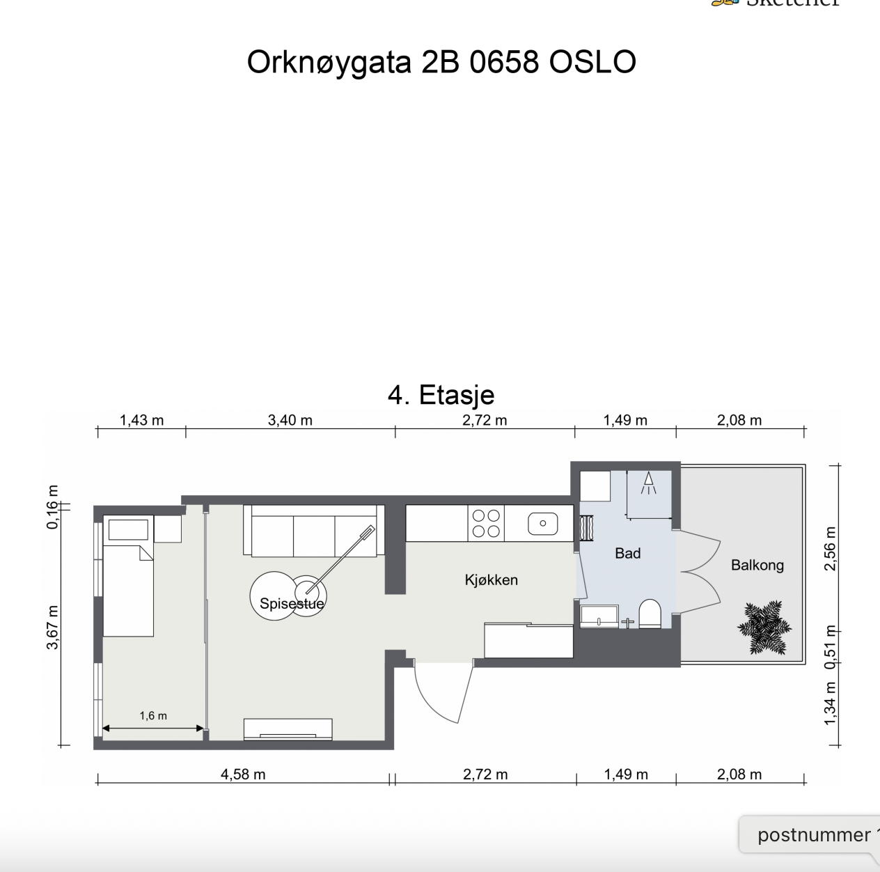 Entré Innbydende inngangsparti med eikelaminat på gulv, malte gipsvegger og himling med downlights. Garderobeløsning med speildør. Bad Lekkert bad med grå 60x60 fliser på gulv med varme og kombinasjon av grå og hvite fliser på vegger. Utstyrt med innfellbare dusjvegger, hvit servant med møbel under, speil, innebygd toalett, opplegg for vaskemaskin og mekanisk avtrekk. Fra badet er det utgang til en østvendt balkong på ca. 4 m². Kjøkken Moderne Kvik-kjøkken i mørk utførelse med 10 mm kompositt benkeplate og integrerte hvitevarer. Avtrekk med kullfilter over koketopp. Stue med sovealkove Romslig stue med plass til både sofagruppe og spisebord. Eikelaminat på gulv, malte vegger og himling. Panelovn for oppvarming. Praktisk sovealkove. Øvrig: Utebod i kjeller på ca. 4 m² Oppvarming med panelovn og gulvvarme på bad Sikringsskap i oppgangen