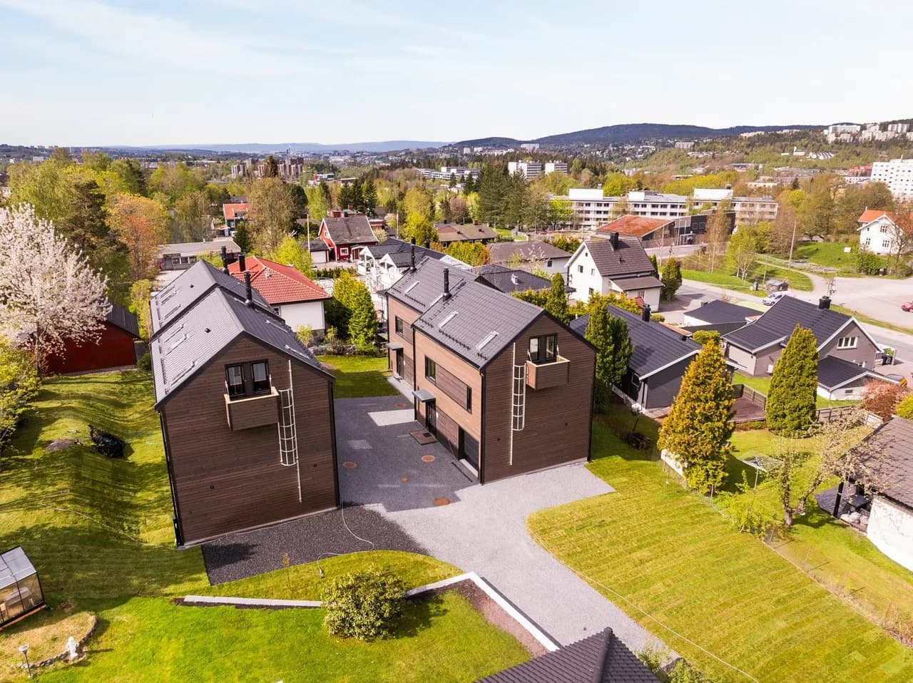 Eksklusiv familiebolig over tre etasjer: Denne eksklusive familieboligen er ferdigstilt i 2025. Med sitt moderne uttrykk, gjennomgående høy kvalitet og funksjonelle planløsning, er dette et hjem som kombinerer komfort og eleganse på en imponerende måte. Boligen strekker seg over tre etasjer og byr på fire soverom, to stuer, to bad, separat wc og et moderne kjøkken med tilhørende spiseplass. De store vindusflatene gir et fantastisk lysinnfall og skaper en luftig atmosfære, mens materialvalg av høy kvalitet sikrer et stilrent og varig uttrykk. Her bor du med det lille ekstra! 1. etasje Entré Entréen er lys og innbydende, med fliser av typen SINTESI Frammenti, Bianco 60x60. Veggene er malt i fargen Kokos, mens himlingen er sparklet gips malt i S 0502Y. Trappen er levert som Stryntrappa Berg med trinn i eik og håndløper i dempet sort. Praktisk innvendig bod gir ekstra lagringsplass. Kjøkken og spisestue Kjøkkenet er fra Keo, med slette, lyse fronter og integrerte hvitevarer. En stor kjøkkenøy med sitteplasser skaper både arbeidsflate og sosial sone. Benkeplaten er slitesterk, kombinert med en sort kjøkkenvask, og kjøkkenet har en Space kjøkkenkran med avstengning i sort. Ventilatoren leveres med motor i sort og utluft til yttervegg. Spisestuen har store vinduer og skyvedører ut mot hagen. Gulv i 13 mm eik Harmoni Rus White 1-stav. Toalettrom WC i 1. etasje har mørkegrønne vegger, grå fliser på gulv og innredning fra PARIS møbelpakke i WENGE. Utstyrt med Space servantkran i krom og vegghengt Nika toalett. Bad/vaskerom Badet i 1. etasje er utstyrt med MIE 60 møbelpakke med fingergrep, servant ADA 60 mid, speil Oda 60 med LED, servantbatteri ASK i sort matt, dusjvegg A Collection med sorte profiler, samt dusjbatteri Tapwell TVM7200 i matt sort. Vegghengt Nika toalett kompletterer uttrykket. 2. etasje Stue Stuen er lys og romslig med takhøye vinduer og flott utsikt. En peisovn Sargas 1 med gulvplate i glass gir både varme og hygge. Gulv i Eik Harmoni Rus White 1-stav, vegger malt i Kokos og himling i S 0502Y. Hovedsoverom med walk-in Hovedsoverommet har suitefølelse, med walk-in garderobe og direkte tilgang til eget bad. Store vinduer gir rikelig dagslys. Baderom (tilknyttet hovedsoverom) Utført med store grå fliser på gulv og vegger, servantmøbel i mørkt tre, hvit servant, sort blandebatteri og rundt speil med integrert lys. Dusjhjørne i glass med sorte profiler, sort armatur og vegghengt toalett. 3. etasje Loftstue Et lyst og fleksibelt oppholdsrom med store takvinduer og skråtak. Perfekt som ekstra stue, lekerom eller hjemmekontor. Gulv i Eik Harmoni Rus White 1-stav. Tre soverom Alle rommene er lyse, med skråtak, takvinduer og god plass til seng og garderobe. Baderom Baderommet har grå fliser på gulv og vegger, dusjvegg med sorte profiler, servantmøbel MIE 60 med servant ADA 60 mid, speil Oda 60 med LED, servantbatteri ASK i matt sort, dusjbatteri Tapwell TVM7200 og vegghengt Nika toalett. Materialer og tekniske spesifikasjoner Innvendig: Vegger i gips, parkett Eik Harmoni Rus White 1-stav, fliser SINTESI Frammenti Bianco 60x60 i entré, wc og bad. Himlinger sparklet og malt i S0502Y. Belistning i glatt hvitmalt furu. Dører/vinduer: Ytterdør Tun 351 i dempet sort, innvendige dører Funkis 1 speil, vinduer og terrassedører i S8500-N. Fasade: Gran 19x148 mm, Jotun 9061 Jernvitrol, takstein Benders dobbelkrom sort, beslag og nedløp i sort stål. Terrassebord 28x120 mm trykkimpregnert. Oppvarming og ventilasjon: OSO Saga S varmtvannsbereder 200 liter, peisovn Sargas 1, elektriske varmekabler i entré og bad, Flexit ventilasjonsanlegg med varmegjenvinning, sentralstøvsuger med uttak i hver etasje. Elektrisk anlegg: Leveres iht. NEK 400:2016 med downlights, dimmere, utelamper, stikkontakter, trekkerør til elbillader, SG termostat med ecomodus, sikringsskap med overspenningsvern og 230V røykvarslere.