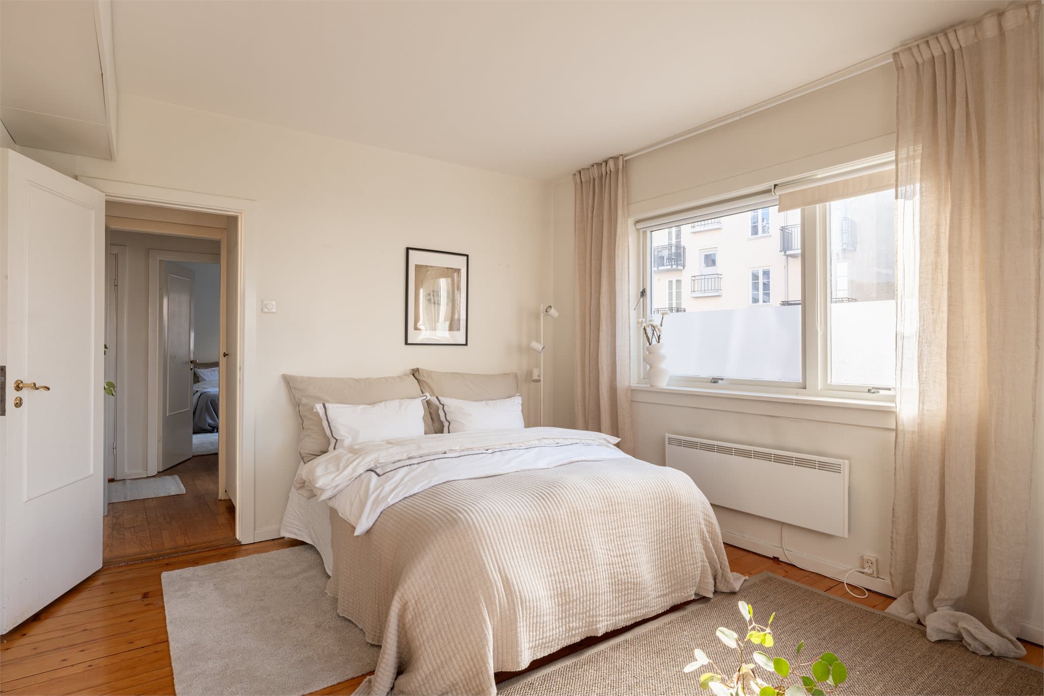 Dette er en hjørne-/ og endeleilighet med en fleksibel planløsning, store oppholdsrom og vinduer på tre sider av bygget. Leiligheten er preget av en takhøyde på rundt 2,6 meter og en rominndeling som er typisk for byggeperioden på 1950-tallet, med en blanding av originale detaljer og nyere oppgraderinger. Det er meget god vedlikeholdshistorikk i sameiet. Entré: Entréen ønskes velkommen via en lyd- og brannklassifisert inngangsdør fra 2020. Gangen fremstår som lys og luftig, og har en praktisk utforming som gir enkel adkomst til leilighetens øvrige rom. Her er det gode oppbevaringsmuligheter for yttertøy og sko, blant annet med speilskyvedør som bidrar til en romslig og funksjonell løsning. Stue: Stuen er romslig og innbydende, med god plass til en komfortabel sofagruppe. Det originale furugulvet gir rommet en varm og sjarmerende karakter, og understreker boligens tidløse preg. Det er også god plass til spisebord med tilhørende stoler, og store vindusflater sørger for rikelig med naturlig lysinnslipp. I hjørnet er det en åpen peis. Pipeløpet er rehabilitert (2025), og selv om ildstedet per i dag har fyringsforbud, ligger det godt til rette for å etablere et nytt, moderne og rentbrennende ildsted gitt godkjent tilkobling. Dette gir en spennende mulighet til å skape et både funksjonelt og atmosfærisk samlingspunkt i stuen. Spisestue/soverom l: I åpen tilknytning til stuen ligger spisestuen, som i dag er innredet og benyttes som hovedsoverom. Rommet er adskilt fra stuen med en bred skyvedør, noe som gir fleksibilitet i bruk og gjør det enkelt å tilpasse etter behov. Her er det god plass til en romslig spisegruppe. Dagens løsning viser et generøst soverom med plass til både seng, sofa og praktiske oppbevaringsløsninger. Soverom ll: Soverom ll har god størrelse med plass til dobbeltseng og tilhørende møblement. En skyvedørsgarderobe sørger for gode oppbevaringsmuligheter (3,14 m og høyde på 2,65 m), og en praktisk nisje gir rom for en liten arbeidsplass. Rommet egner seg også godt som gjesterom, kontor eller hobbyrom. Begge rommene fremstår som lyse og luftige, hvor hovedsoverommet har vinduer på to sider som gir rikelig med naturlig lys og en behagelig romfølelse. Kjøkken: Kjøkkenet er et separat rom med en praktisk og arealeffektiv U-formet innredning, som gir gode arbeidsforhold og rikelig med benkeplass. Benkeplaten i heltre tilfører både varme og funksjonalitet. Innredningen har fronter i tre, hvor enkelte overskap med glassfelt bidrar til et luftig uttrykk. Kjøkkenet fremstår som funksjonelt, men har et noe eldre preg. Det er nylig lagt parkettgulv (2025). Et stort vindu over kjøkkenbenken gir godt lysinnslipp. Bad og toalettrom: Badet ble oppgradert i 2007 og fremstår med flislagte overflater og varmekabler i gulv, som gir god komfort. Rommet er utstyrt med servantinnredning, dusjkabinett og opplegg for vaskemaskin. Vindu sørger for naturlig lys og god ventilasjon. Som følge av alder må det påregnes behov for videre oppgraderinger over tid. Leiligheten har et praktisk, separat toalettrom med toalett og servant. Også her er det varmekabler i gulvet, noe som bidrar til økt komfort i hverdagen. Overflater: Gulv: Parkett på kjøkken og i entré. Originale tregulv (furu) i stue og ett soverom/spisestue. Eldre parkett i ett soverom. Fliser på bad og toalettrom. Vegger: Malte plater, malt strie og tapet. Fliser på bad. Himling: Malte plater. Lagring: Leiligheten disponerer en kjellerbod på ca. 3 m². Moderniseringer og påkostninger: Ny entredør installert i 2020 (faglært). Nytt parkettgulv i eik på kjøkkenet lagt høst 2025 (faglært). Ny vask og speil på badet og varmtvannstank montert desember 2025. El-tilsyn gjennomført i 2023. For fullstendig teknisk informasjon om boligen, se punktet Byggemåte i salgsoppgaven.