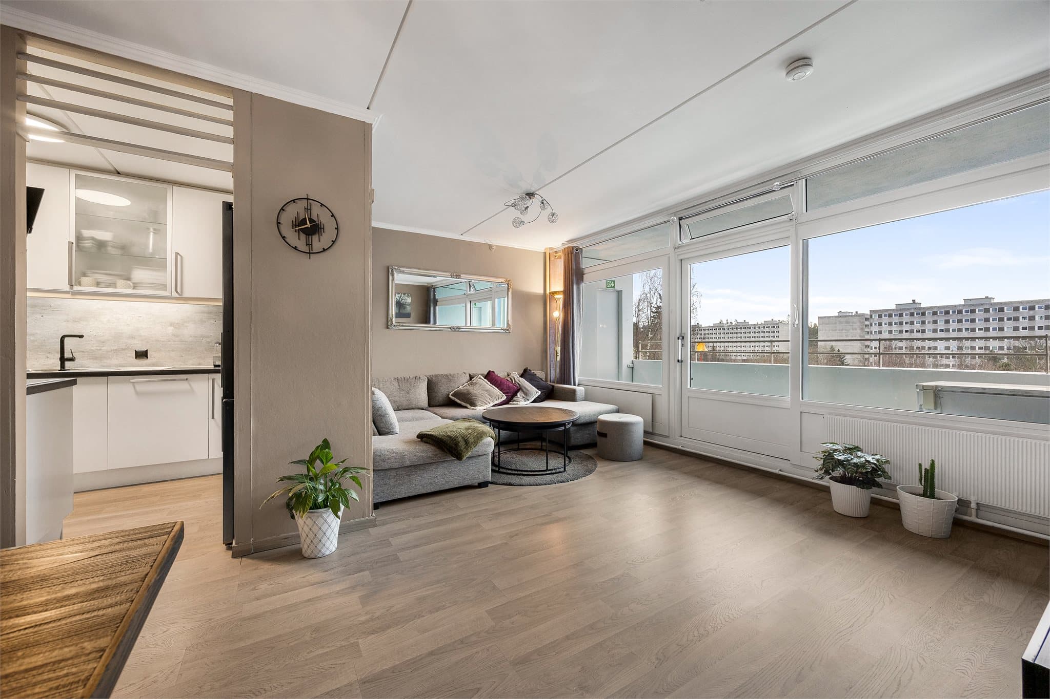 Leiligheten presenterer en arealeffektiv og praktisk planløsning, fordelt over ett plan. Boligen inneholder tre soverom, et bad som ble pusset opp i regi av borettslaget i 2017/2018, og et separat toalettrom. Kjøkkenet fikk moderniserte fronter i 2024, og fra stuen er det utgang til en balkong. Gjennomgående lyse overflater og en god romfordeling gir et funksjonelt hjem. Entré: Du kommer inn i en entré som fungerer som et bindeledd til leilighetens øvrige rom. Herfra er det tilgang til en praktisk innvendig bod. Stue: Stuen har laminat på gulvet og malte vegger. Rommet har plass til både sittegruppe og spisebord. Fra stuen er det direkte utgang til leilighetens balkong. Balkong: Balkongen på 8 m² fungerer som en naturlig forlengelse av boligen i sommerhalvåret. Den er smart utnyttet av selger, blant annet med plassering av fryser. Kjøkken: Kjøkkenet har en innredning som ble modernisert i 2024 med nye, glatte fronter og en laminatbenkeplate med nedfelt kum. Av integrerte hvitevarer finnes platetopp og stekeovn sam opplegg for oppvaskmaskin. Rommet har ikke vindu og er utstyrt med mekanisk avtrekk og kullfilterventilator over kokesonen. Bad: Badet ble pusset opp i 2017 i regi av borettslaget. Rommet har flislagte overflater på gulv og vegger, og det er varmekabler i gulvet. Innredningen består av servantmøbel med glatte fronter og en dusjnisje med dører i herdet glass. Ventilasjon skjer via mekanisk avtrekk. Toalettrom: Leiligheten har et praktisk separat toalettrom med fliser på gulv og vegger. Rommet er utstyrt med et vegghengt toalett med innebygget sisterne og en servant. Her er også fordelerskapet for rør-i-rør-systemet plassert. Tre soverom: Leiligheten inneholder tre soverom av god størrelse. Rommene egner seg som hovedsoverom, barneværelse, kontor, hobbyrom eller som en kombinasjon. Alle rommene har laminat på gulv og malte vegg- og takflater, noe som gir et godt utgangspunkt for personlig innredning. Overflater: Gulvoverflater: Gulvene har i hovedsak laminat. Fliser på bad og toalettrom. Vegger: Veggene har malte, sparklede og pussede overflater. Fliser på bad og toalettrom. Himling: Himlingene består av malte betongelementer og slette, malte flater. Lagring: Leiligheten disponerer en innvendig bod i tilknytning til entréen. I tillegg medfølger en bod på 2 m² i byggets kjeller. Hver oppgang har et fellesvaskeri med to vaskemaskiner, én tørketrommel og tørkeskap.