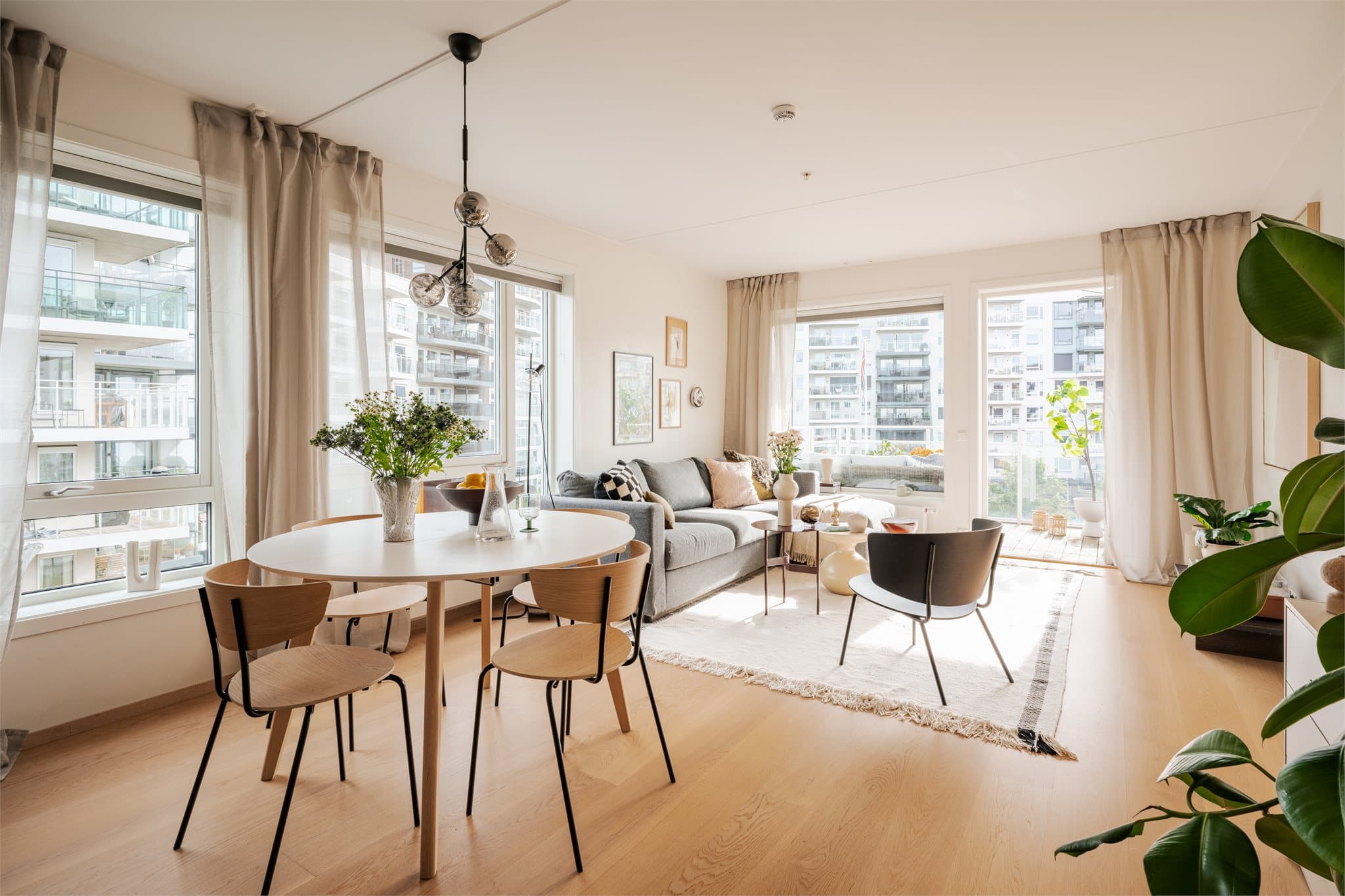 Entré Lys og innbydende entré som ønsker deg velkommen. Det er god plass til oppbevaring i garderobeskap med speilfronter, og gulvplassen gir et ryddig førsteinntrykk. Stue og kjøkken Lys og romslig stue med åpen løsning mot kjøkkenet. Store vindusflater slipper inn rikelig med naturlig lys og gir en luftig atmosfære. Kjøkkenet er innredet med moderne, slette fronter og integrerte hvitevarer. God plass til både spisebord og sofagruppe gjør dette til et sosialt samlingspunkt i boligen. Balkong Fra stuen er det utgang til en solrik balkong som fungerer som en naturlig forlengelse av oppholdsrommet. Her er det god plass til sittegruppe, beplantning og hygge. Bad Pent flislagt baderom med dusjhjørne med svingdører, vegghengt toalett og servant med speilskap over. Praktisk opplegg for vaskemaskin og tørketrommel samt god oppbevaringsplass. Soverom Leiligheten har to moderne soverom med gode møbleringsmuligheter.