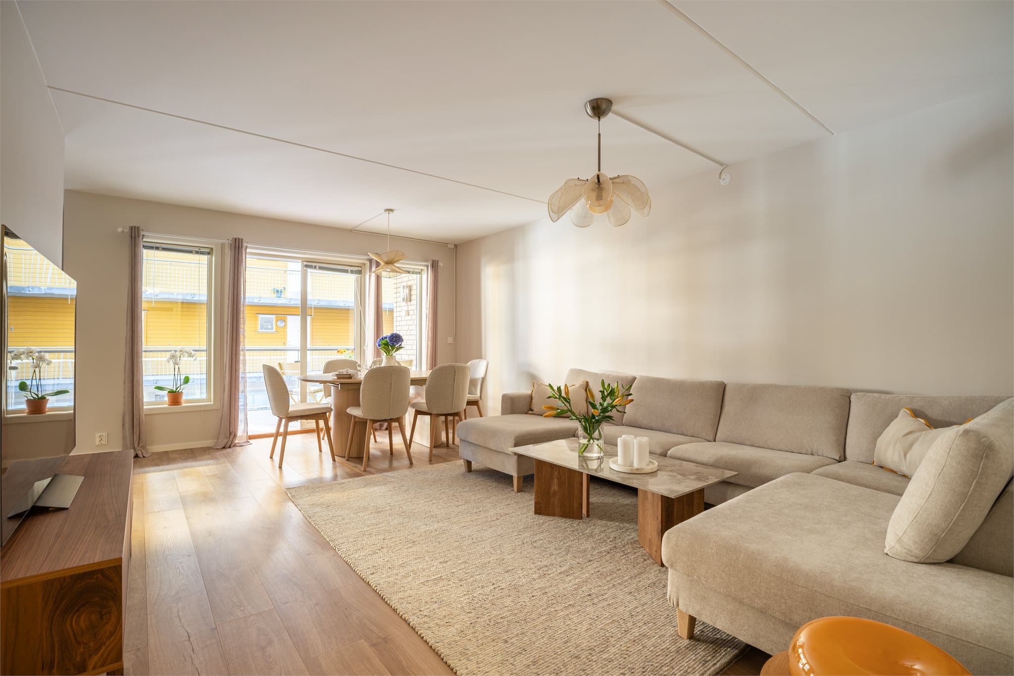 Entré Velkommen inn! Entréen gir et ryddig førsteinntrykk og binder boligens rom sammen på en naturlig måte. Her er det plass til både sko og yttertøy, og like innenfor finner du en praktisk innvendig bod som gir god oppbevaringsplass for alt du ikke ønsker fremme til daglig. Stue Stuen er lys og innbydende med store vindusflater som slipper inn godt med dagslys og gir en behagelig romfølelse. Her har du god plass til både sofagruppe og spisebord - perfekt for deg som liker å samle venner og familie. Fra stuen er det utgang til en overbygd og skjermet balkong som fungerer som et forlenget oppholdsrom store deler av året. Gulvet er lagt med moderne laminat og har varmefolie med temperaturstyring i de ulike sonene - en praktisk og komfortabel løsning som gir jevn varme gjennom hele året. Kjøkken Kjøkkenet er nytt og lekkert fra IKEA (2024) og har et tidløst, moderne uttrykk. Her finner du slette fronter i delikate fargetoner, benkeplate med marmor-look og detaljer som gullfargede håndtak og sort nedfelt kum med ettgreps armatur. Løsningen er både elegant og funksjonell, med rikelig skap- og benkeplass samt integrerte hvitevarer som stekeovn, induksjonstopp, kjøleskap og oppvaskmaskin - i tillegg til komfyrvakt. Kjøkkenet er delvis åpent mot stuen, noe som gir en sosial og praktisk løsning for både hverdagsliv og hyggelige sammenkomster. Hovedsoverom Et lekkert hovedsoverom med eksklusivt preg og rolige fargetoner som skaper en avslappende atmosfære. De flotte garderobeskapene gir rikelig med oppbevaring samtidig som de bidrar til et rent og helhetlig uttrykk. Her ligger alt til rette for en god natts søvn - et rom som gir ekte hotellfølelse i hverdagen. Soverom 2 / Kontor Det andre soverommet brukes i dag som hjemmekontor, men passer like godt som gjesteværelse eller barnerom. Rommet er av god størrelse og byr på fleksible innredningsmuligheter - med rikelig skapplass og et lyst og trivelig preg. Bad Baderommet er fra byggeåret (2007), men fremstår moderne og pent oppgradert med ny baderoms innredning. Rommet har flislagte overflater, gulvvarme og vegghengt toalett som gir et ryddig og stilrent uttrykk. Dusjhjørnet med glassdører gir et rent og tidløst preg, og praktisk nisje med plass til både vaskemaskin og tørketrommel gjør hverdagen enklere. Bod Boligen har en romslig innvendig bod med god lagringskapasitet - perfekt for sesongvarer, koffert, sportsutstyr eller annet du ønsker å oppbevare uten å fylle opp leiligheten. I tillegg disponerer leiligheten en kjellerbod på ca 5kvm. Balkong Fra stuen har du utgang til en overbygd og skjermet balkong på ca. 10 kvm. Dette er et hyggelig uteområde med plass til både sittegruppe og grønne innslag - perfekt for å nyte en rolig stund ute, uansett vær. Fellesarealer Sameiet Strømmen Atrium har fått sitt navn fra det flotte atriet i midten av bygget - et lunt og sosialt fellesområde rett utenfor inngangsdøren. Her møtes beboerne i grønne og rolige omgivelser som skaper en god nabolagsfølelse. På taket finner du en stor, solrik takterrasse med sittegrupper og beplantning - et perfekt sted å trekke seg tilbake for å nyte solfylte dager eller invitere venner til hyggelige sammenkomster. Parkering Leiligheten disponerer garasjeplass nr. 17 i felles garasjeanlegg. Her er det montert elbillader, og adkomst skjer via heis direkte opp til boligetasjen - en praktisk og trygg parkeringsløsning året rundt.